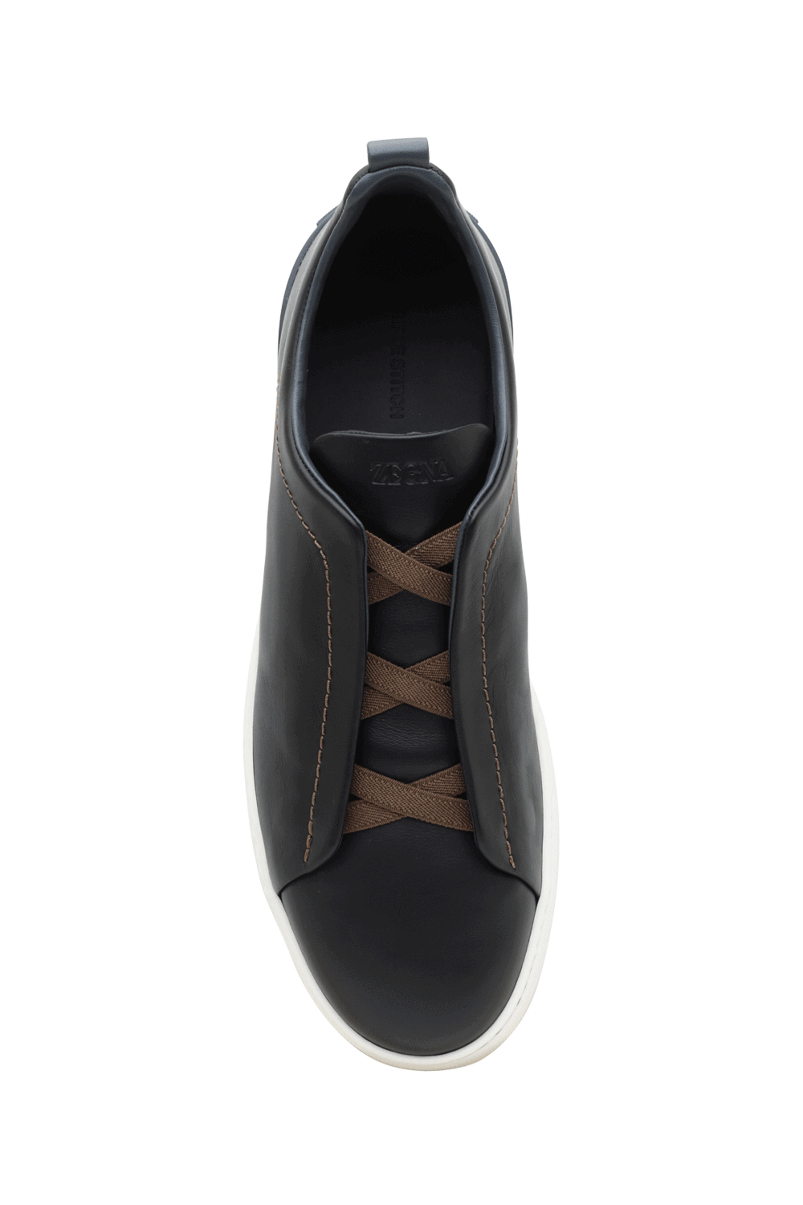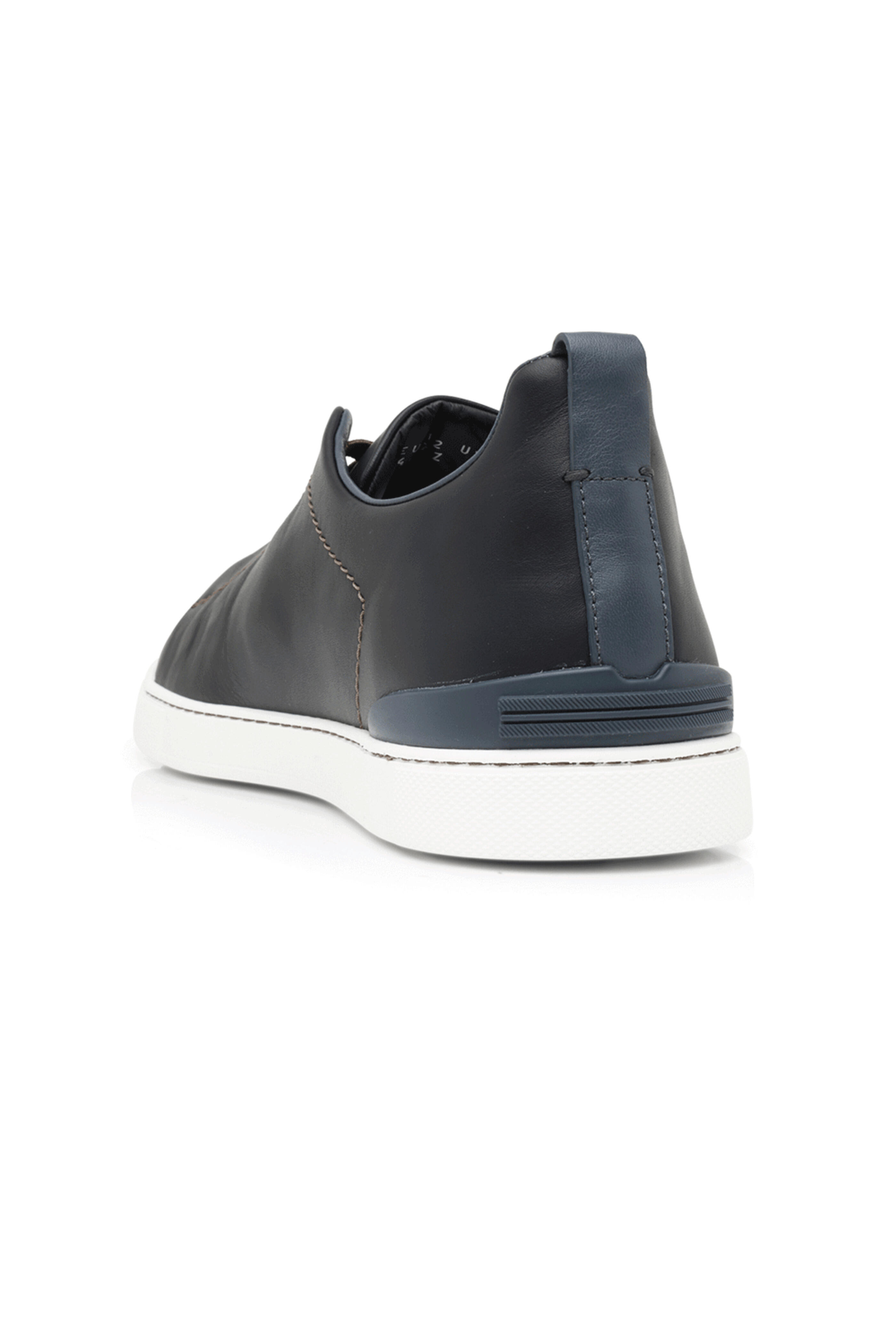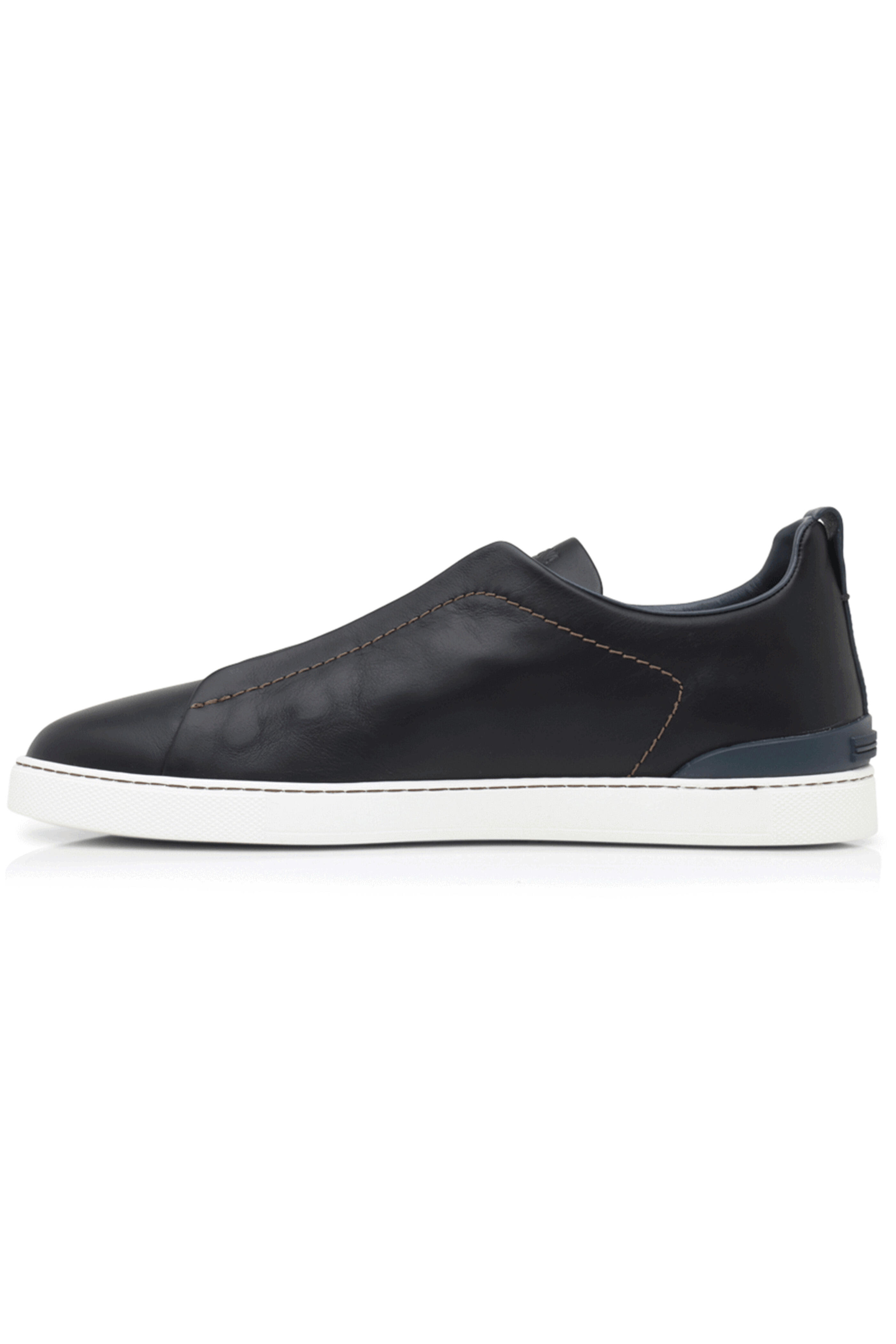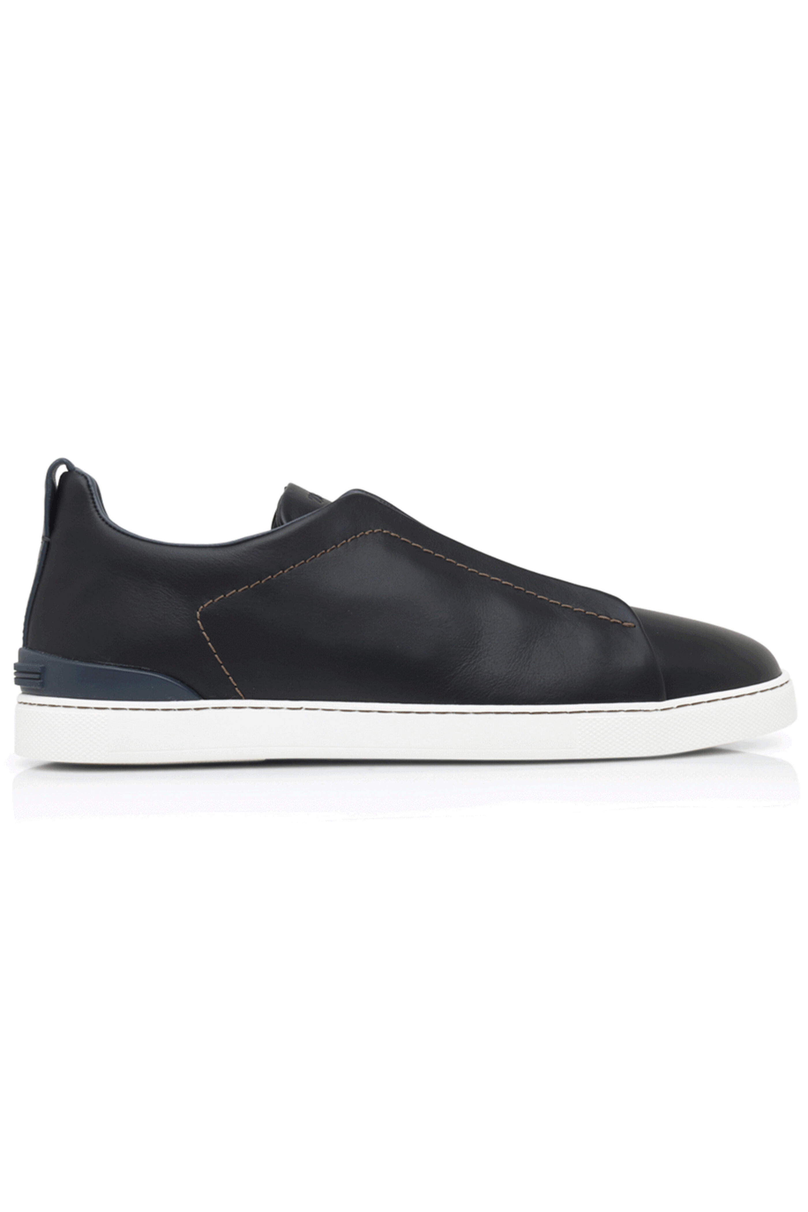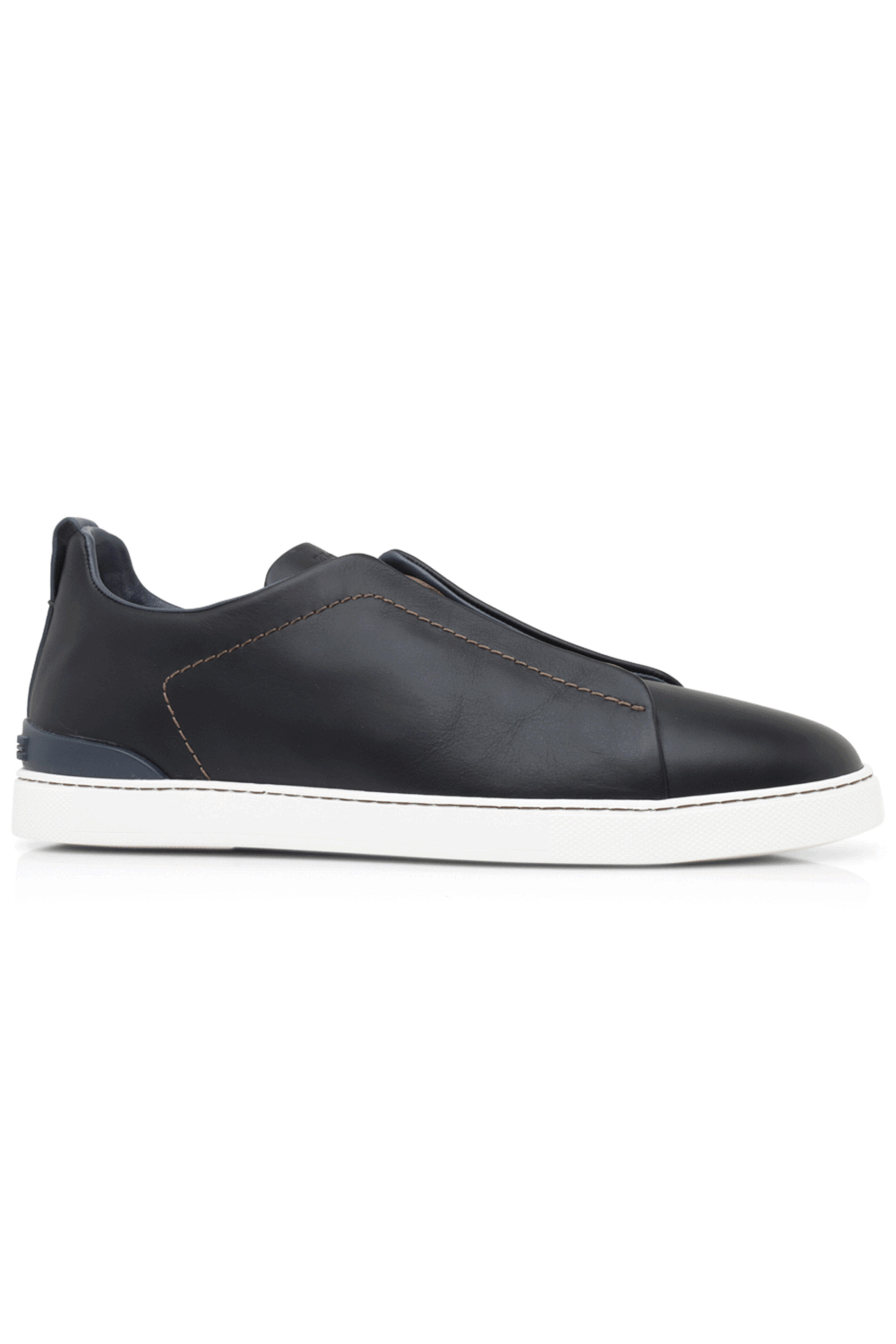 Zegna Leather Triple Stitch Sneaker in Black. Round toe. Elasticized lace-up vamp. Slip-on. Pull tab at heel. Contrast stitching and lacing. Leather lining and insole. Suede upper. Rubber sole. Made in Italy.