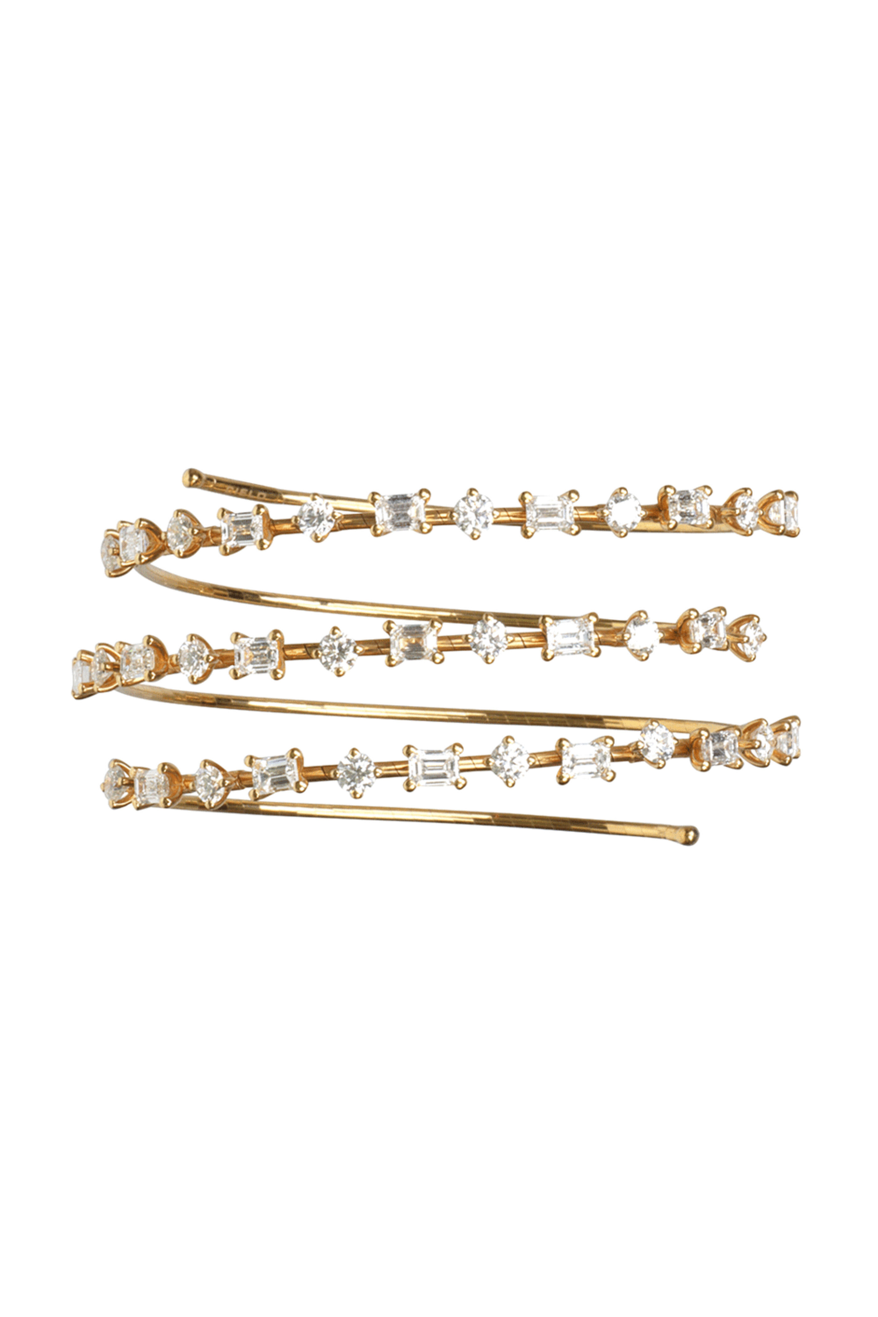 Mattia Cielo Mix Diamond Wrap Bracelet. 18k gold. Diamond 7.02 total carat weight. Emerald cut diamond. Round, brilliant cut diamond. Wrap style. Three rows. Diamonds staggered along wrist spiral. Flexible. Made in Italy.
