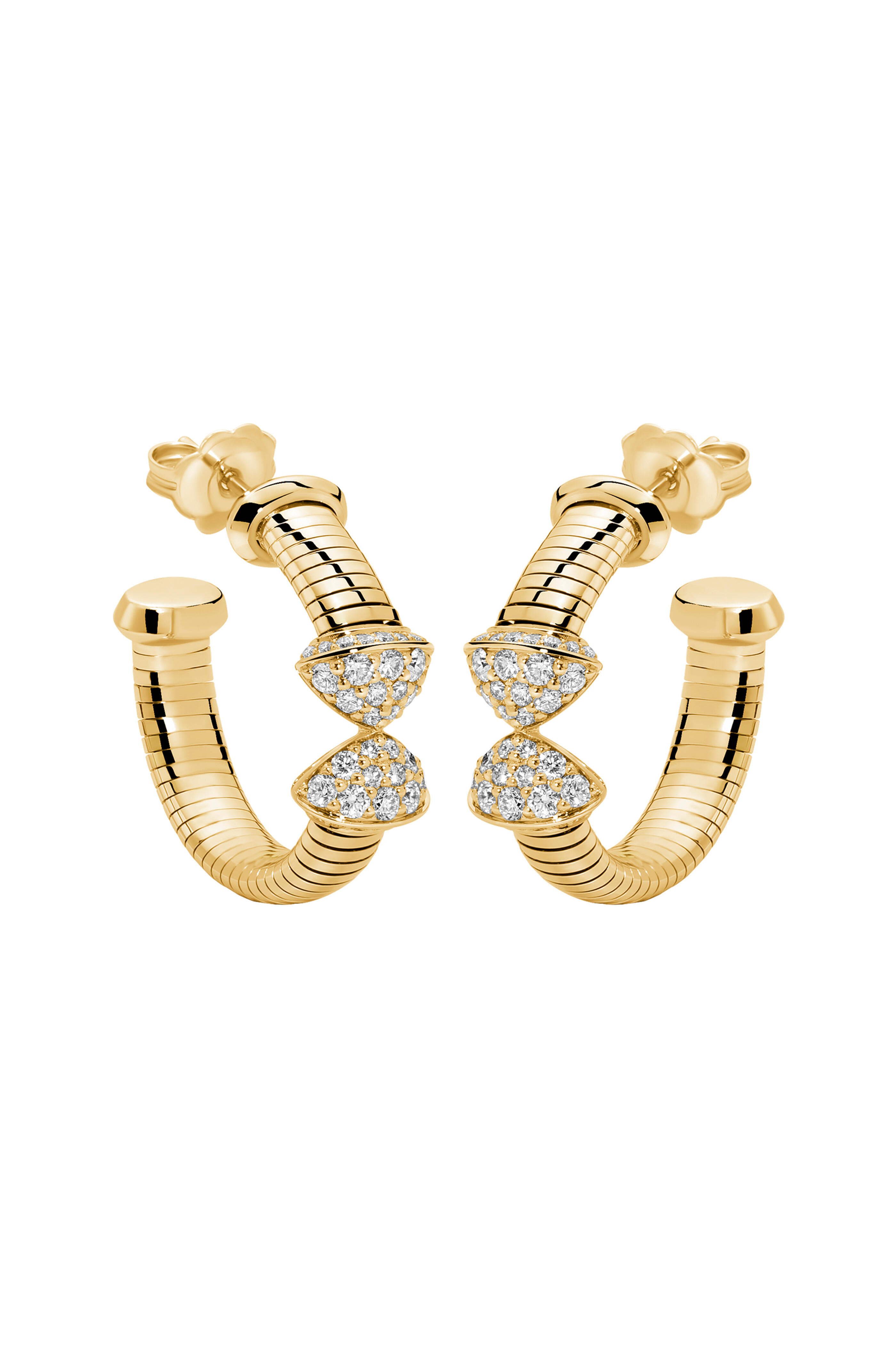 18k yellow gold. Diamond 0.50 total carat weight. Pave diamond. Spiral detailing. Hoop style. Push back post. Made in Italy.