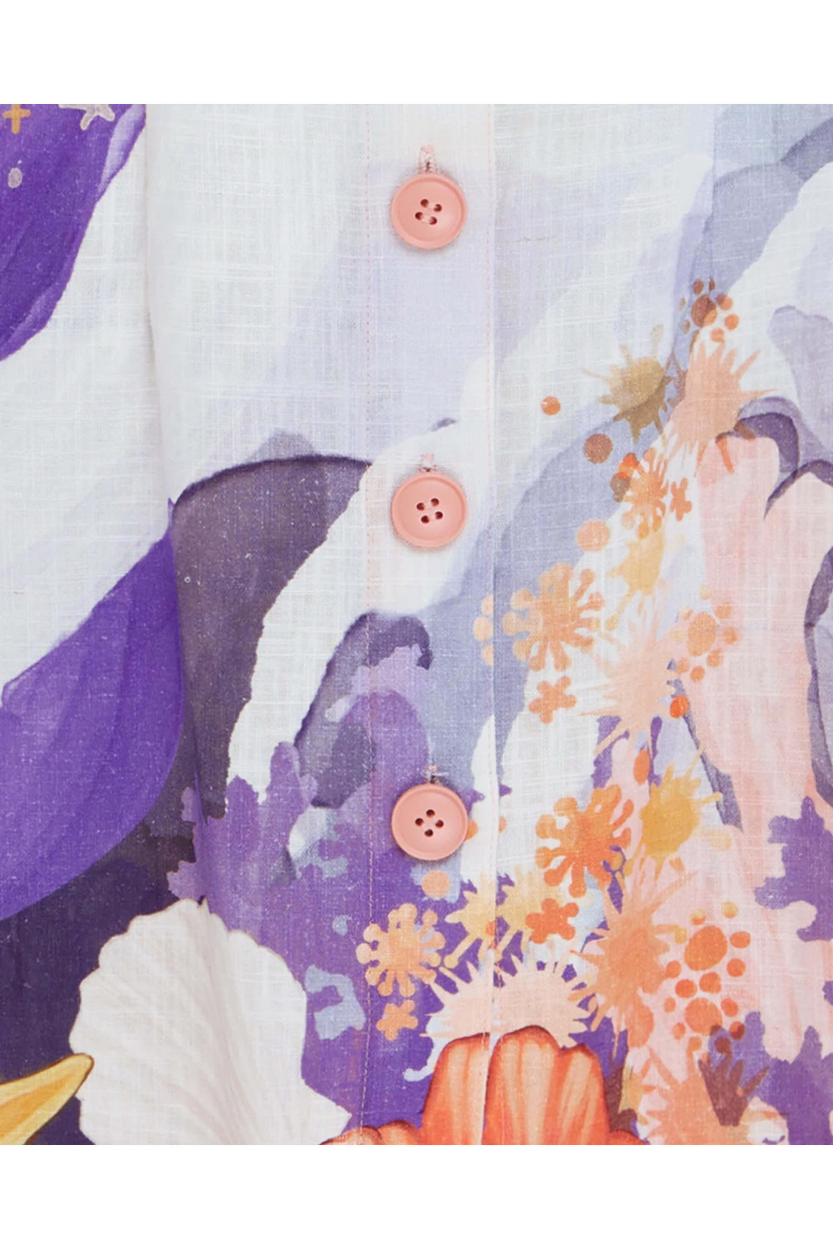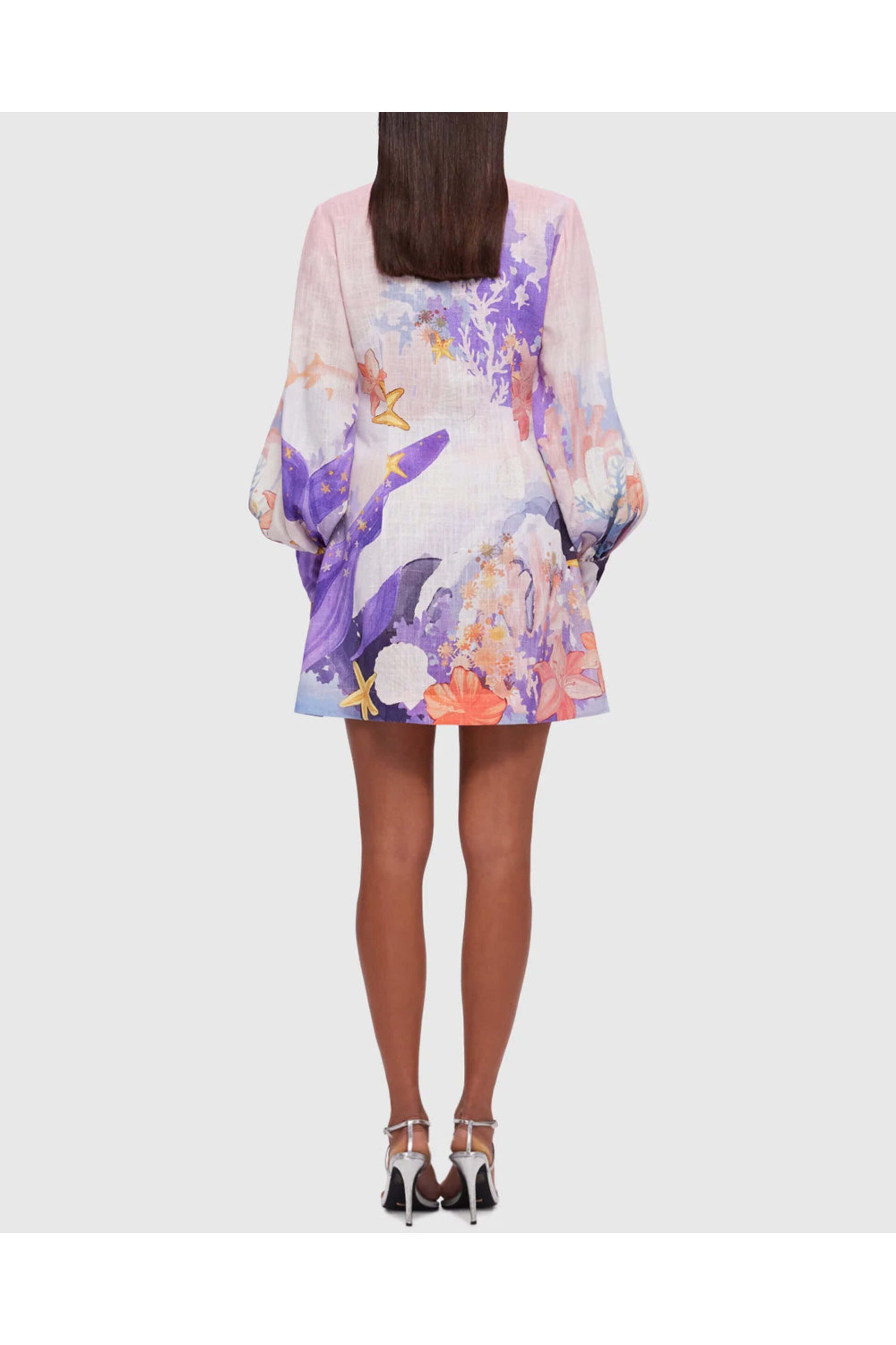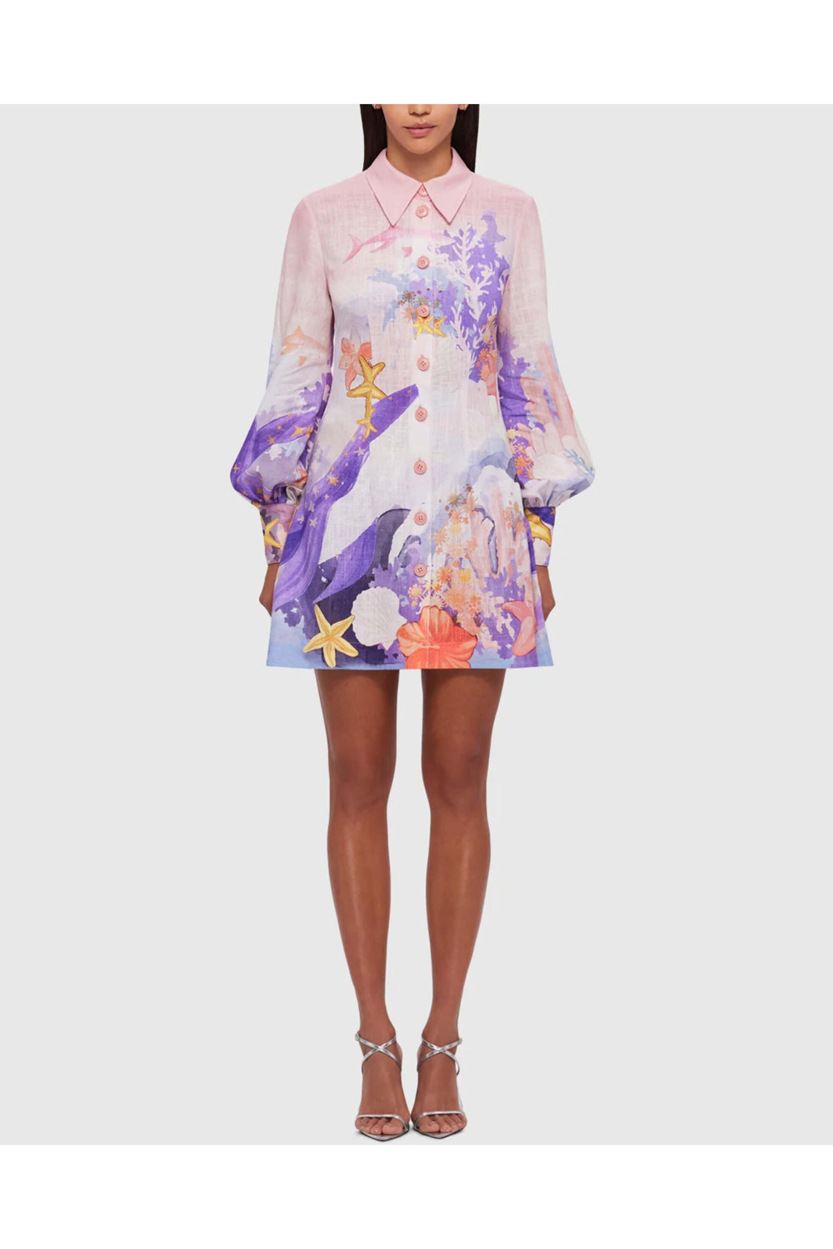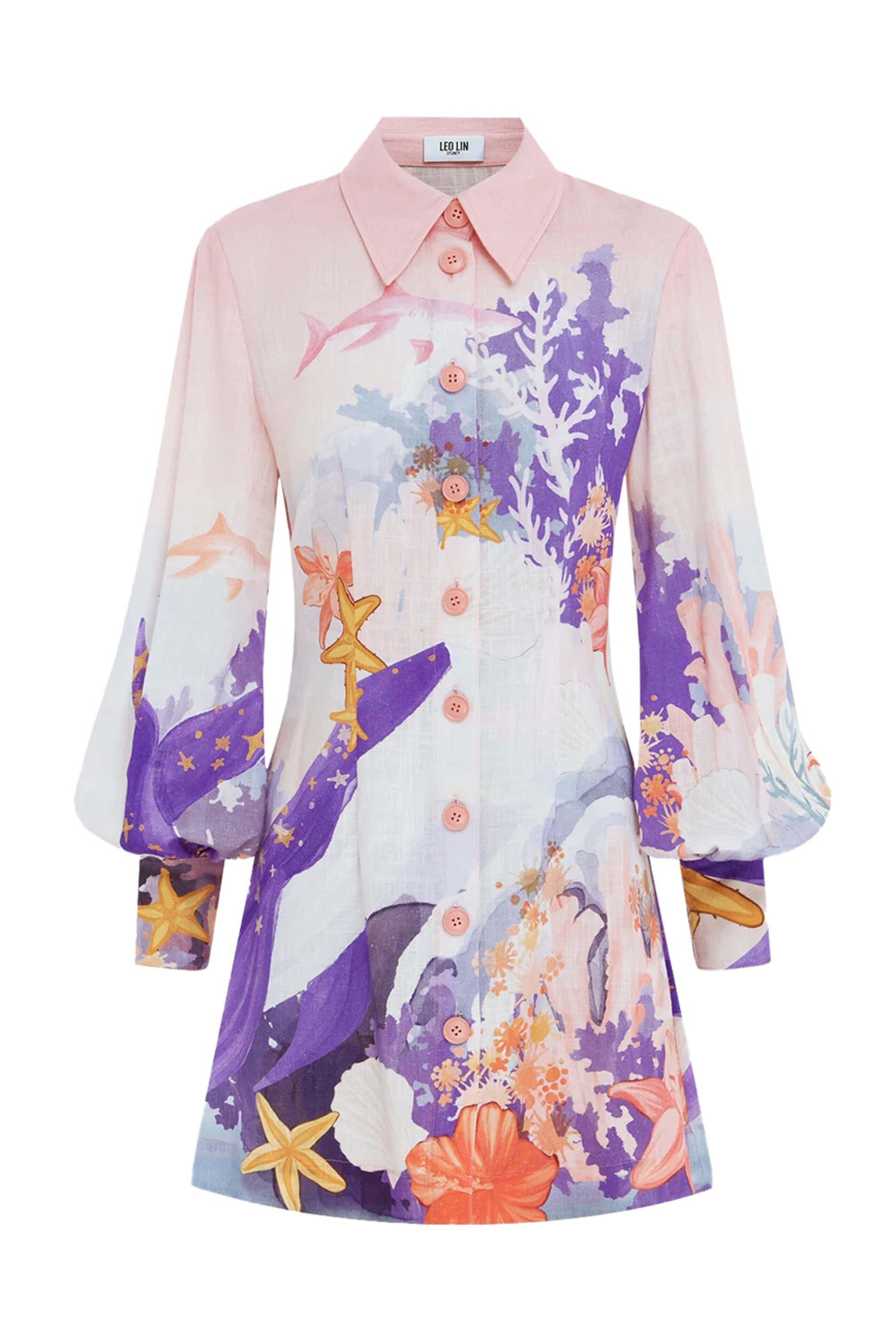 Leo Lin Neptune Print Coral Luminous Linen Mini Dress. Collar. Long balloon sleeves; button cuffs. Button down front closure. Regular fit. Mini length. 70% viscose, 30% linen.