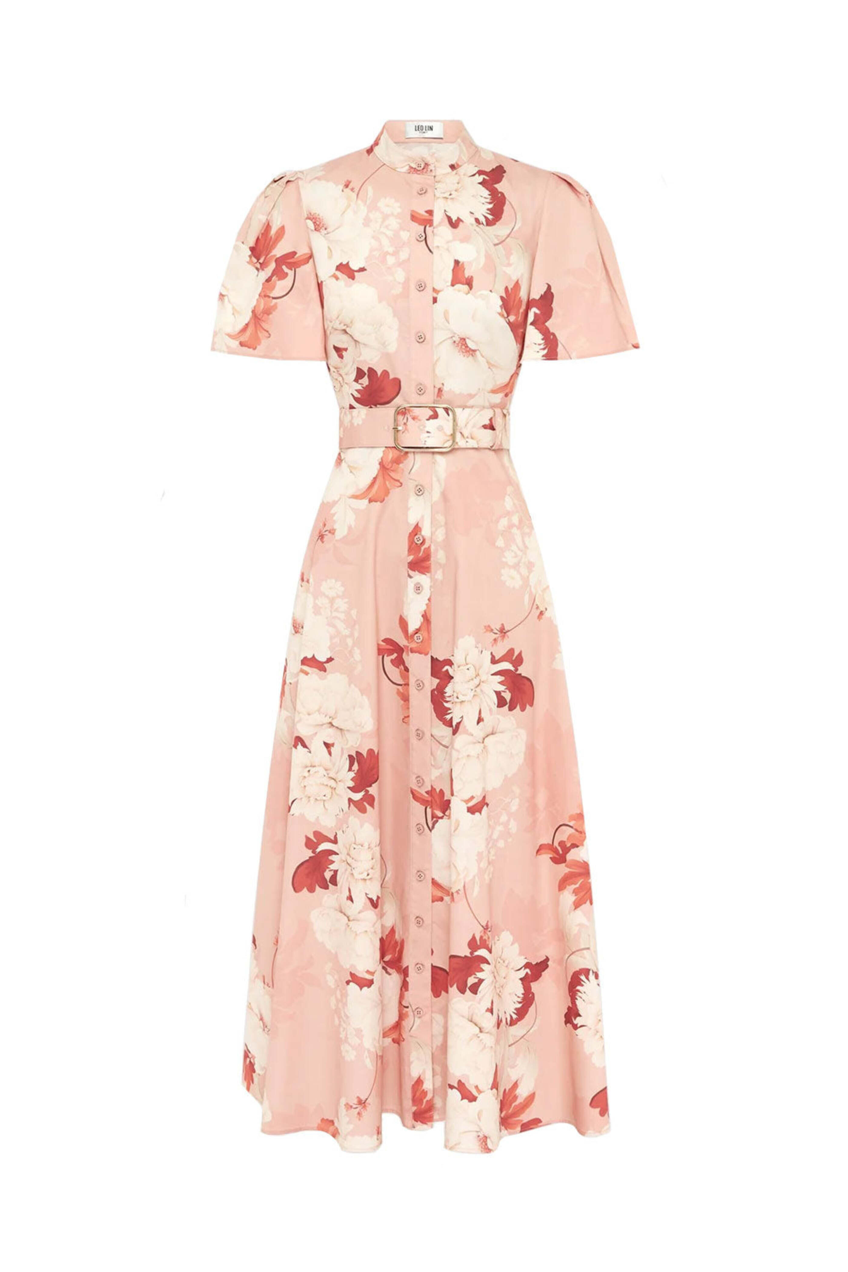 Leo Lin Peony Print Bianca Short Sleeve Midi Dress . Mandarin collar . Concealed front button tab . Short sleeves . Fitted banded waistline . Voluminous A-line skirt . Fully lined . Matching belt included . Main: 100% Cotton . Dry cleanable . Do not machine wash .