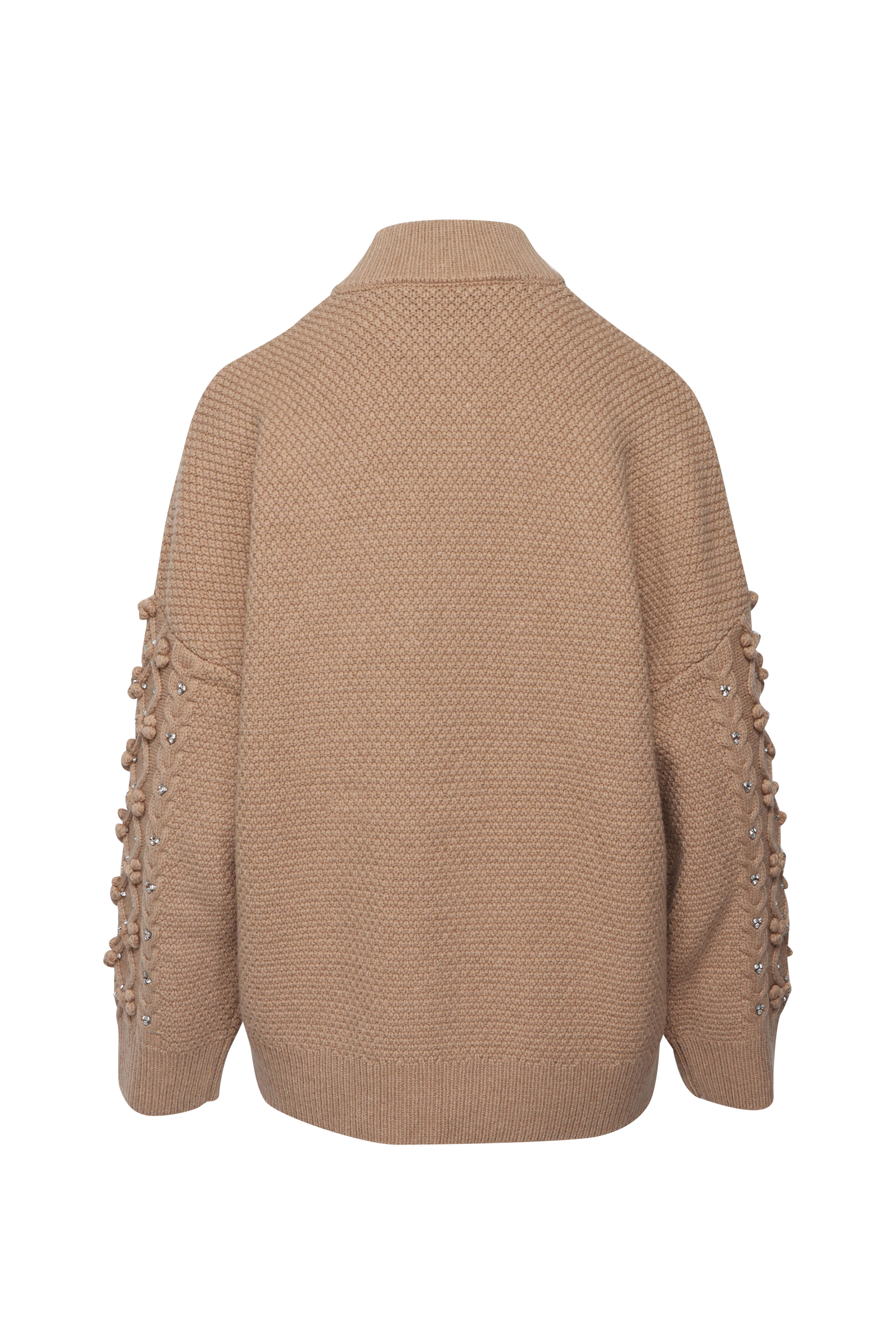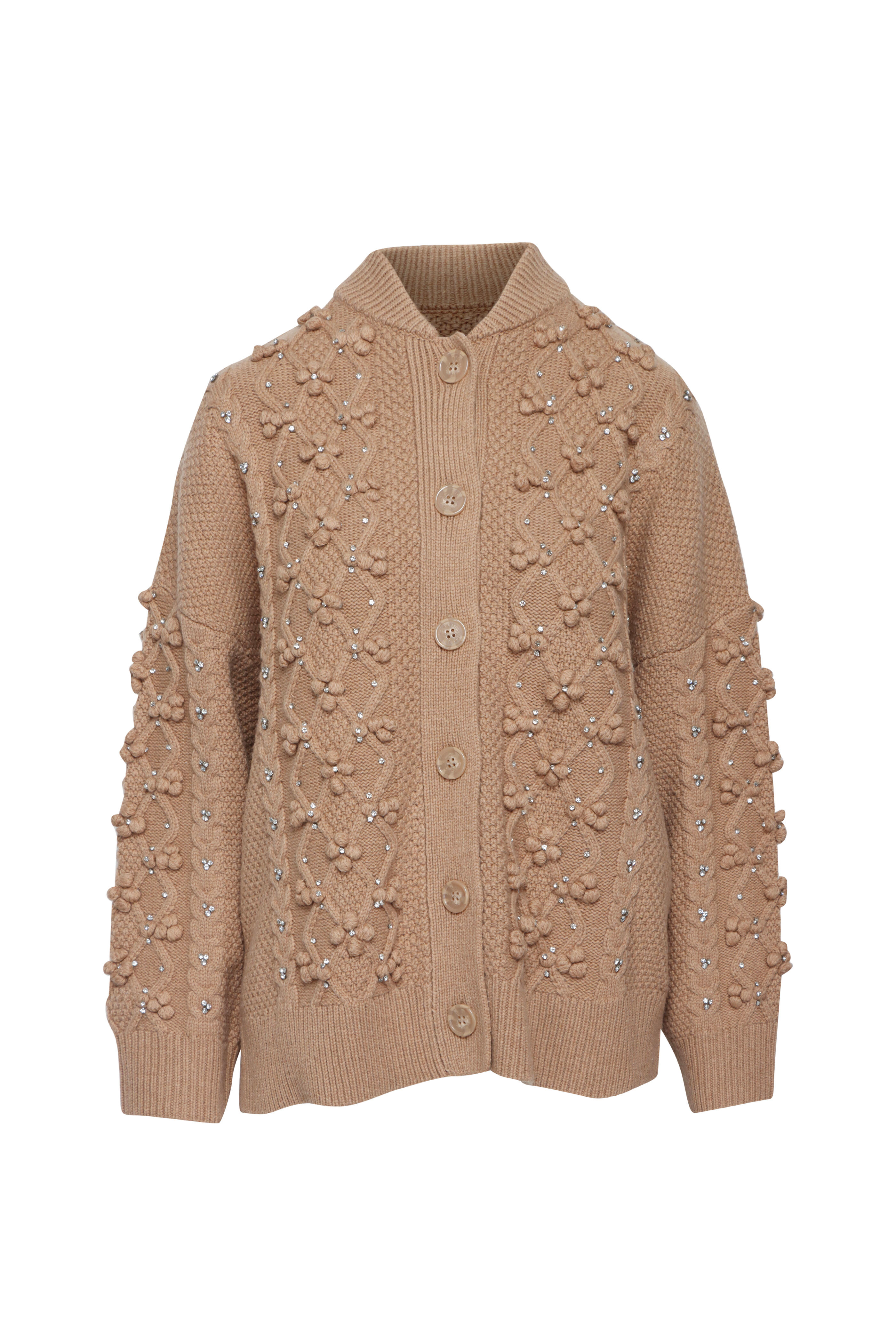 Bomber collar. Long sleeves. Button up front closure. Relaxed fit. Crystal embellished detail throughout. Imported. Length 26” (Size S). 80% wool, 20% nylon. Handwash.