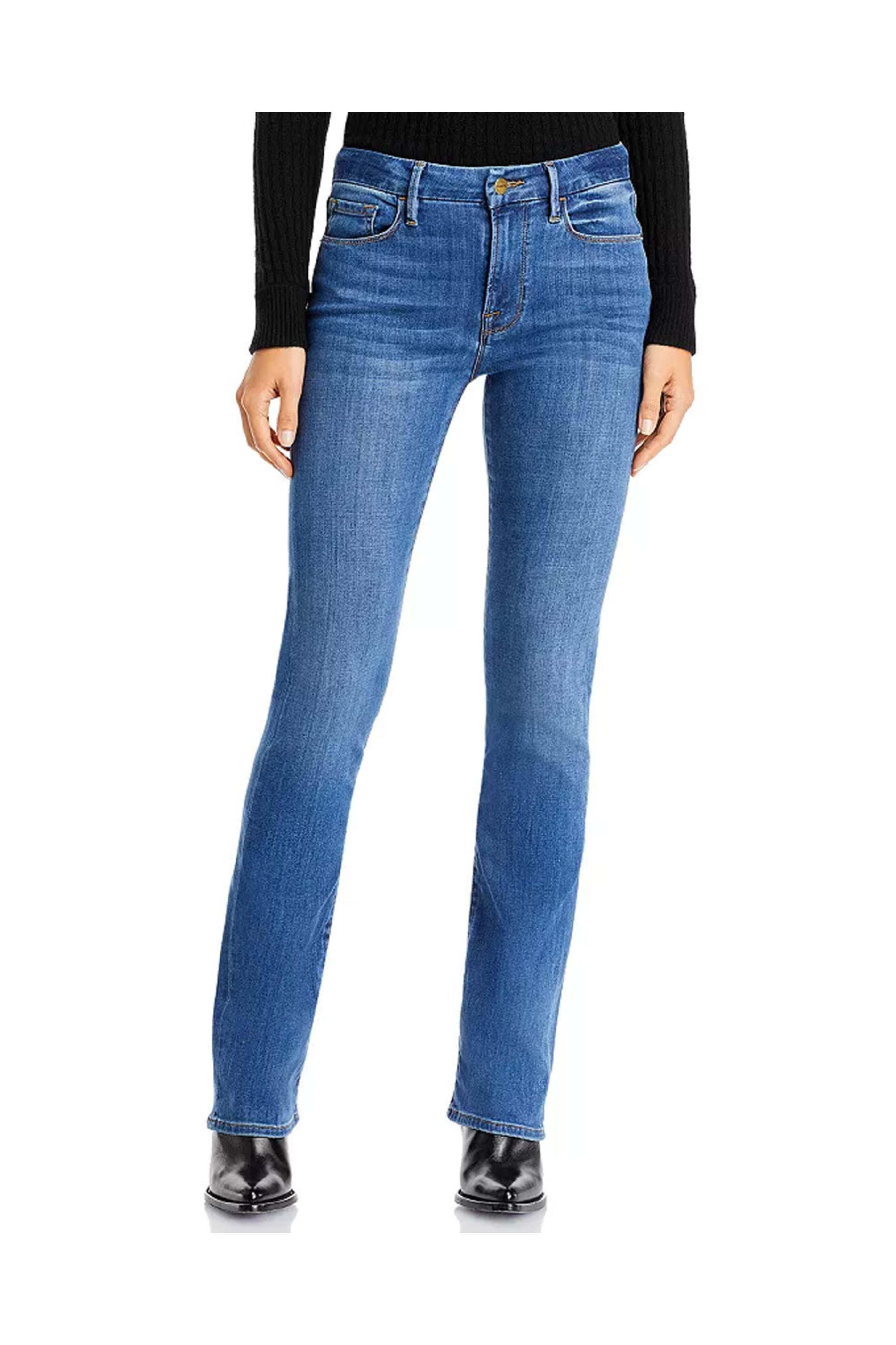 Frame Le Mini Boot Jean in Poe. High rise. Button closure. Zip fly. Belt loops. Five pocket style. Bootcut silhouette. Ankle length. 44% cotton, 42% lyocell, 13% polyester, 1% elastane.