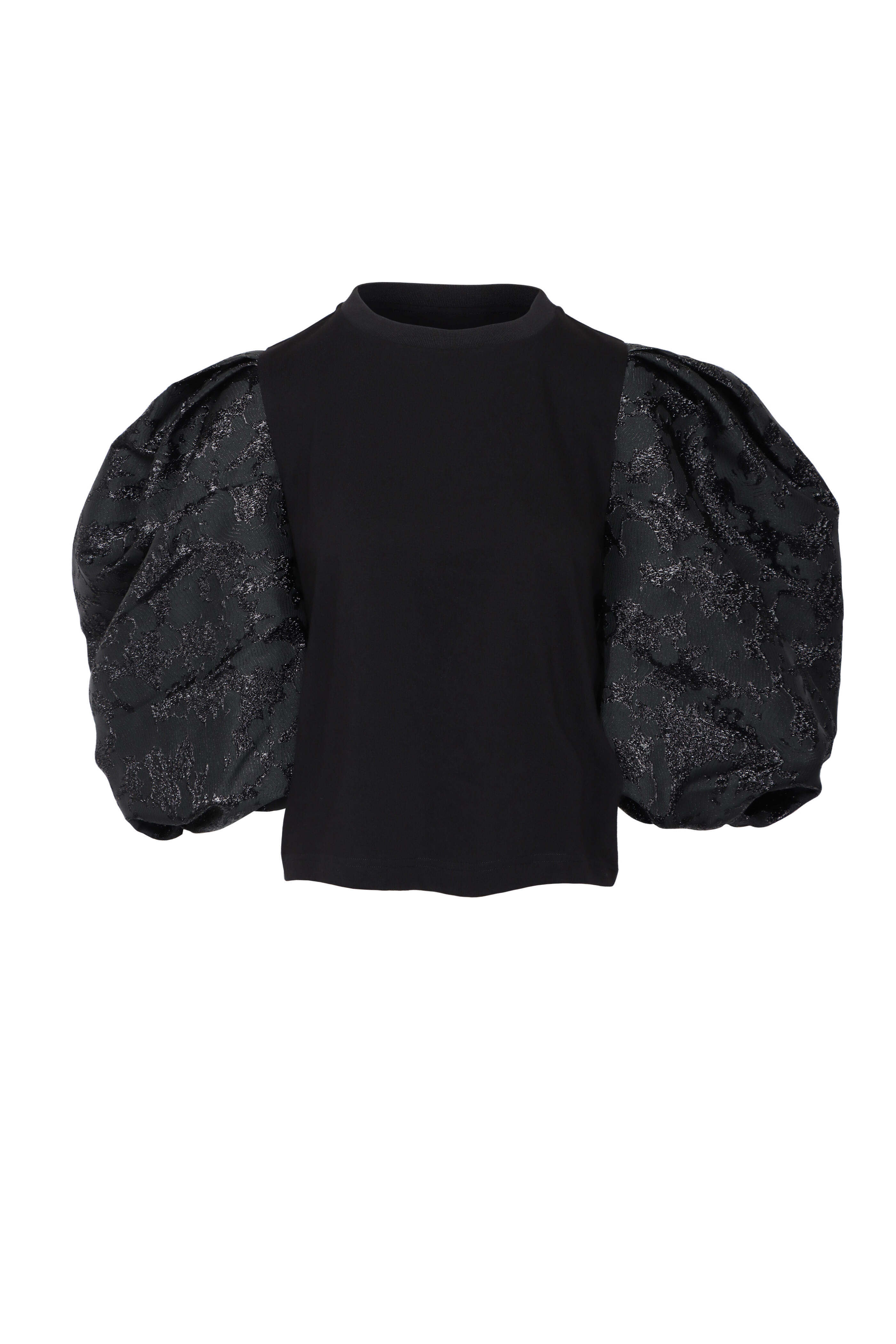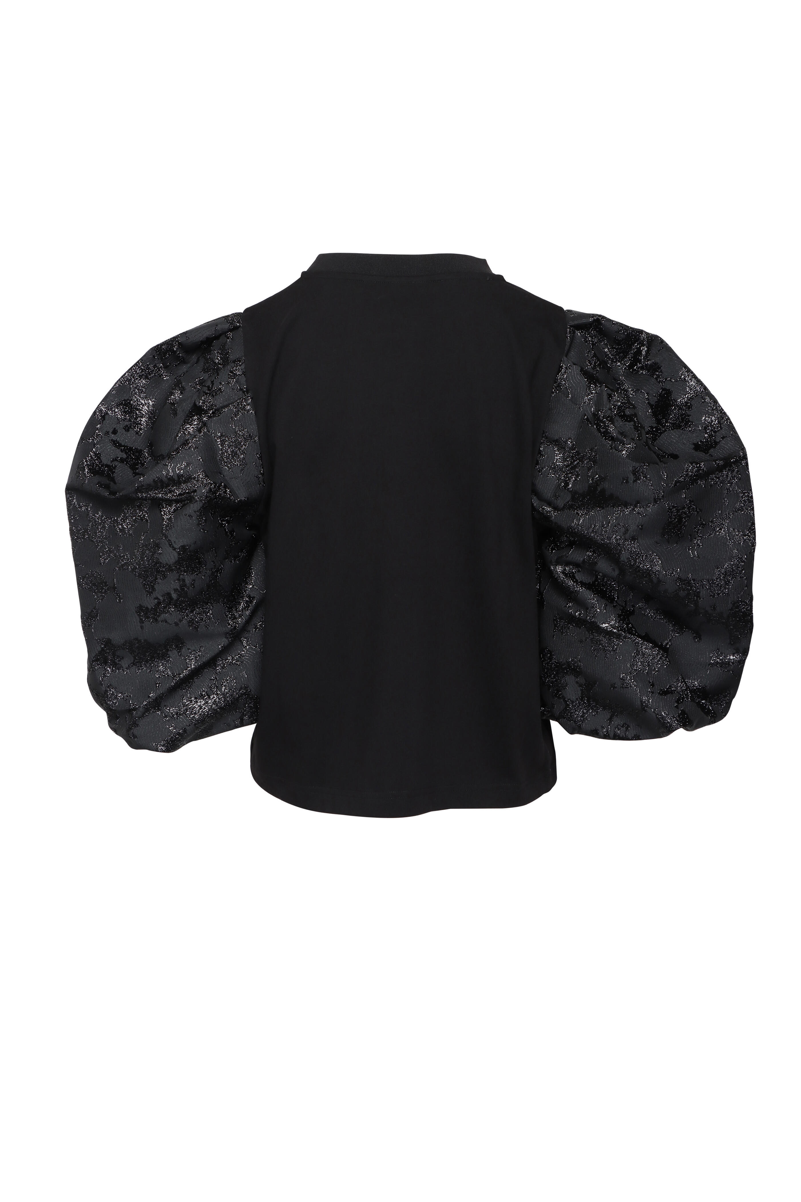 Crewneck. Elbow length puff sleeves; jacquard detail. Relaxed fit. Straight hem. Jersey fabrication. Imported. Length 23” (Size S). 100% cotton. Handwash.