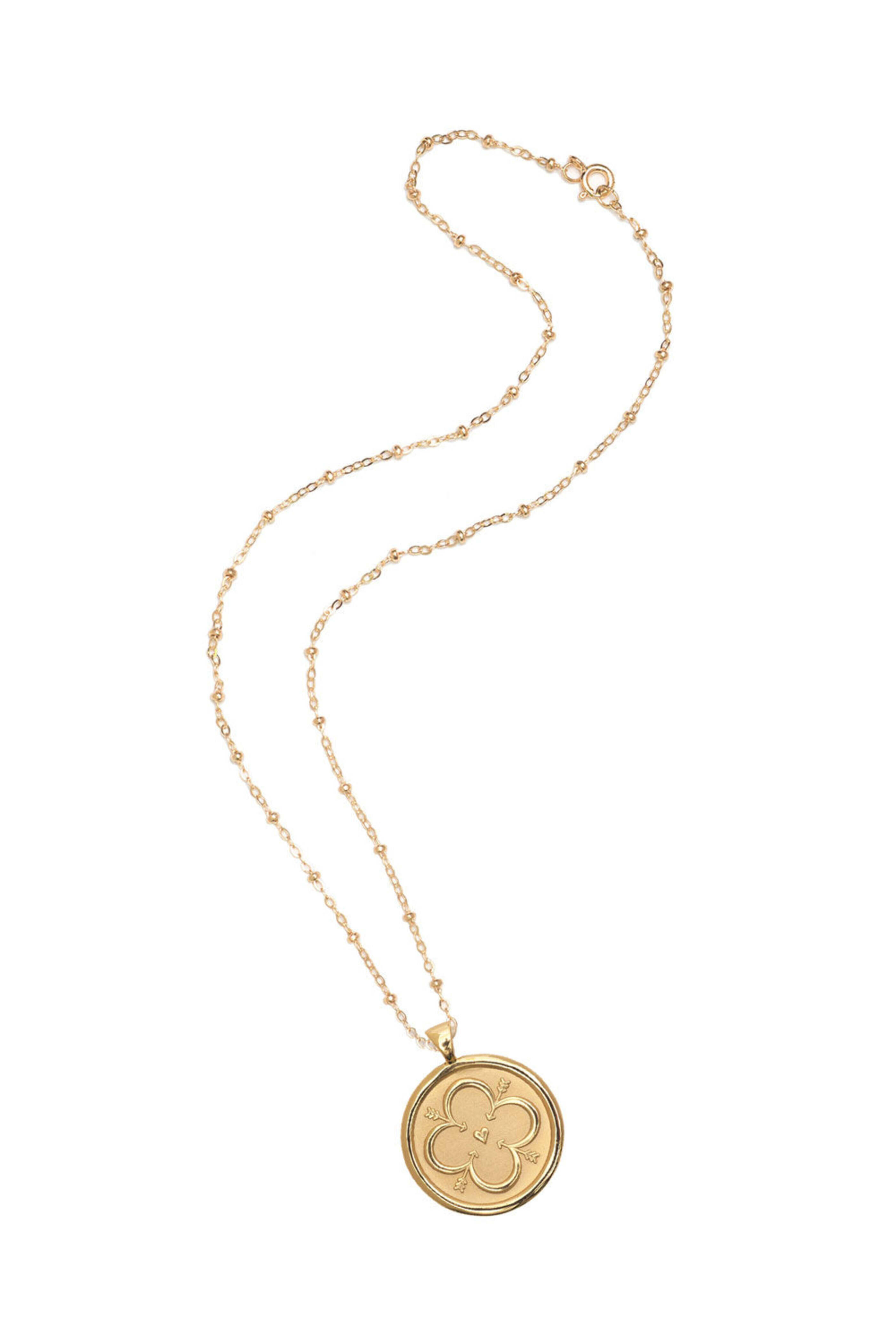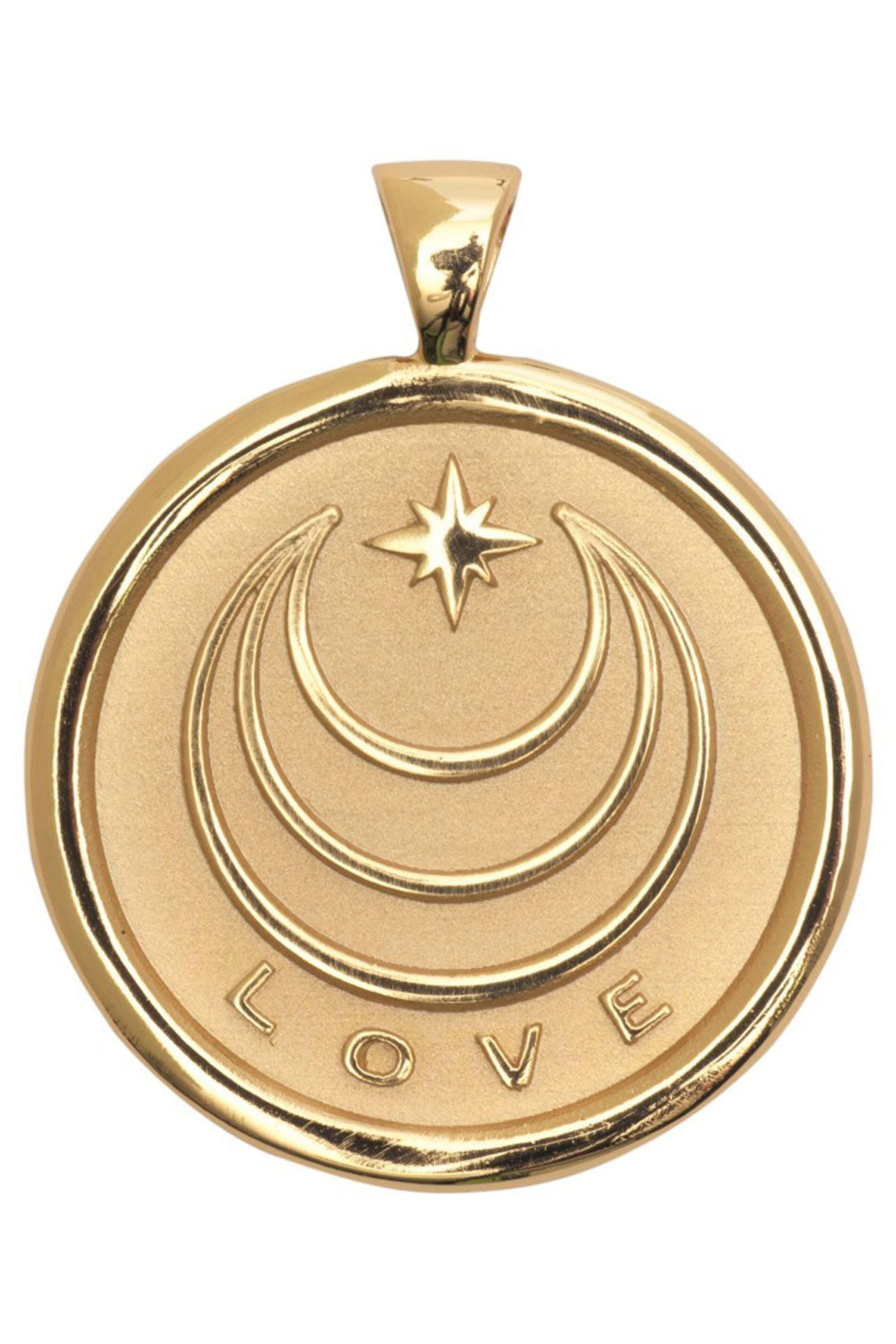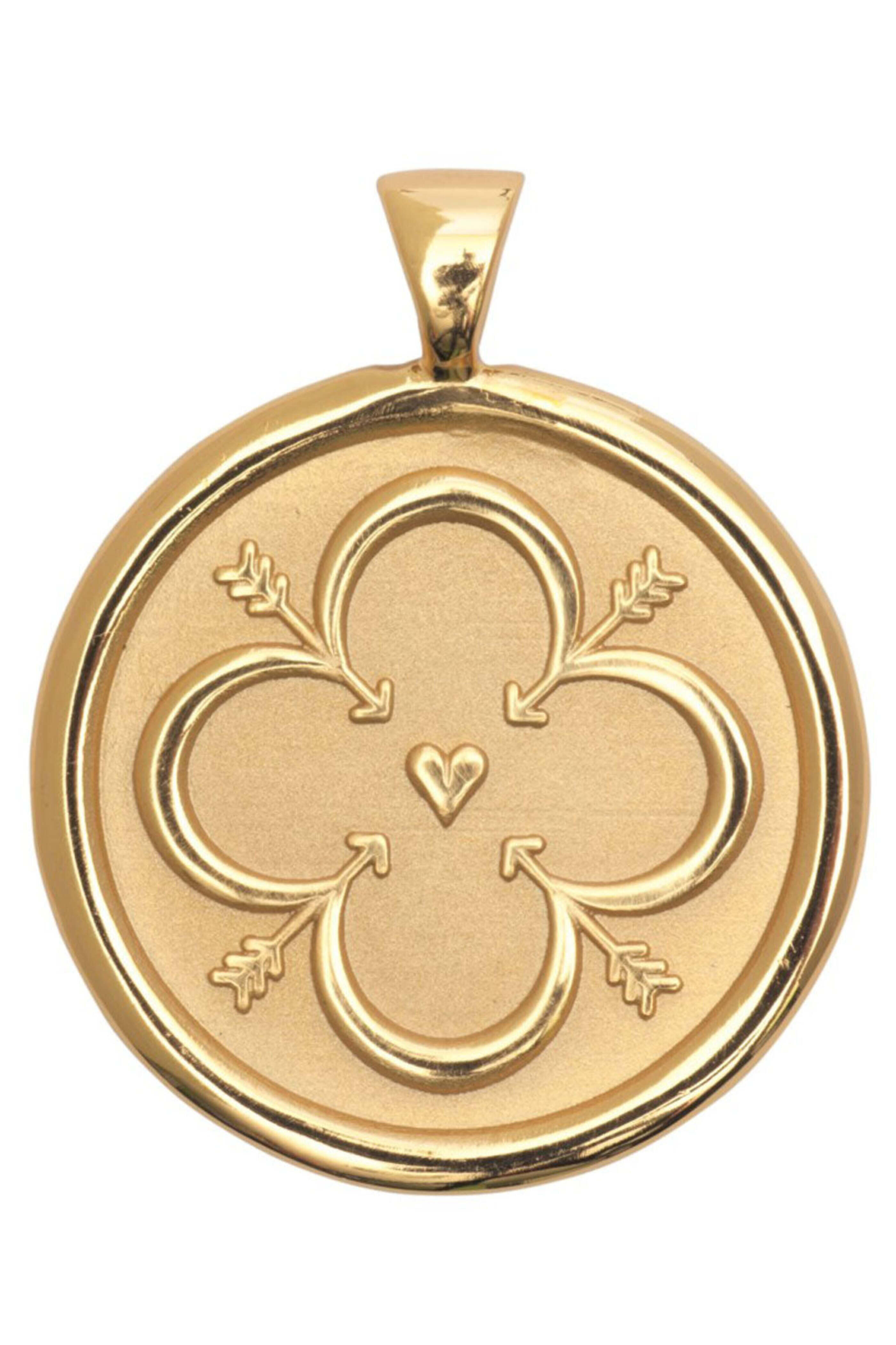 Jane Win Small Love Coin Pendant Satellite Chain Necklace. Coin pendant made of sterling silver dipped in 14k gold, measuring 0.975" in diameter.. DOUBLE SIDED: quatrefoil and hearts on one side, JW logo and LOVE inscription on the other. Wear either way!. Coin pendant bail (loop that attached the pendant to a chain) will fit a wide variety of chains.. 16-18" adjustable satellite chain.