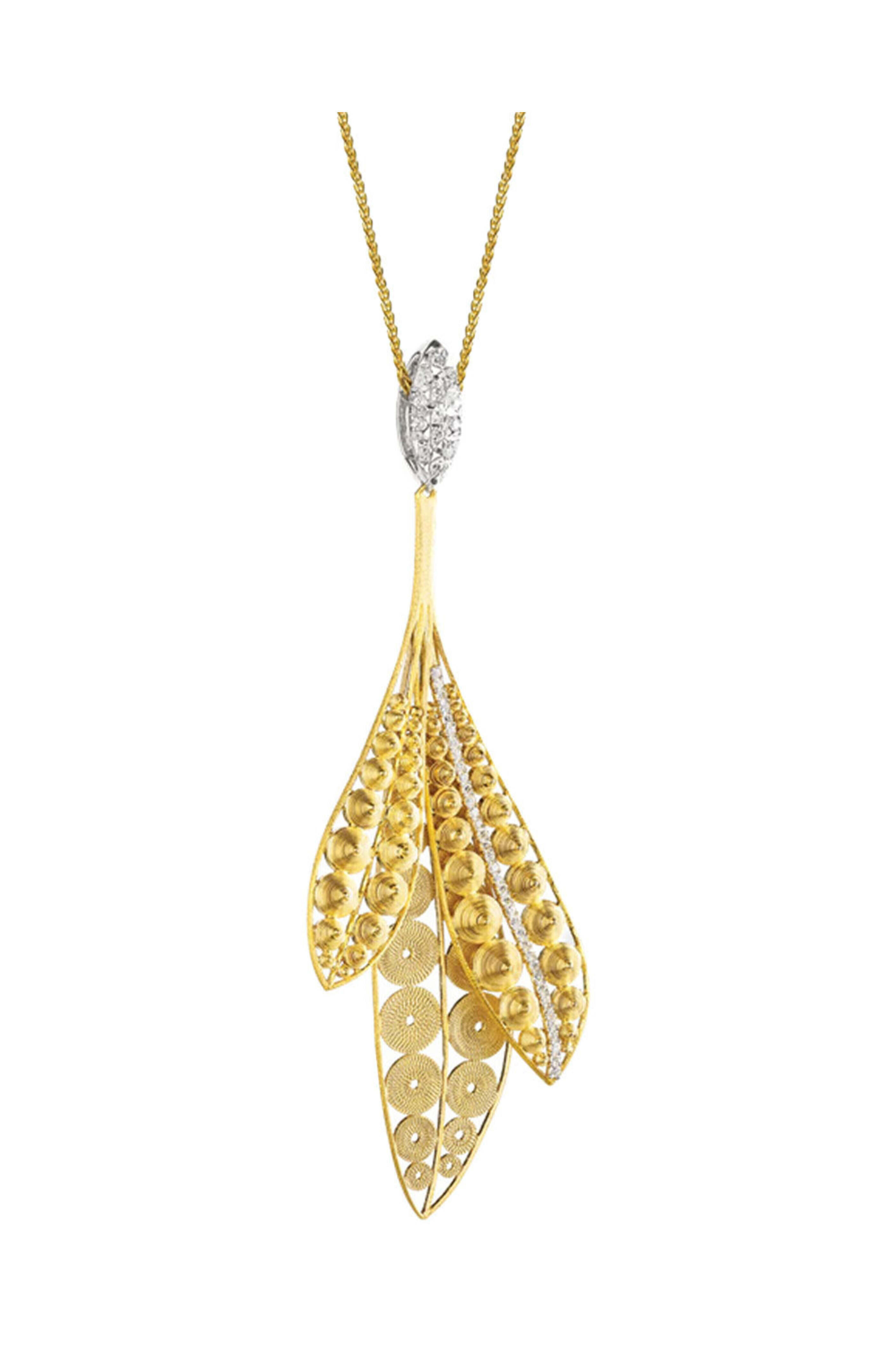 Luisa Rosas Luz Pendant with Chain. 18k yellow gold. 18k white gold. Diamond 0.25 total carat weight. Wheat chain. Three pieces. Two cone leaves. One large leaf with flat spirals. 24 L. Marquis diamond bail. Lobster claw clasp.