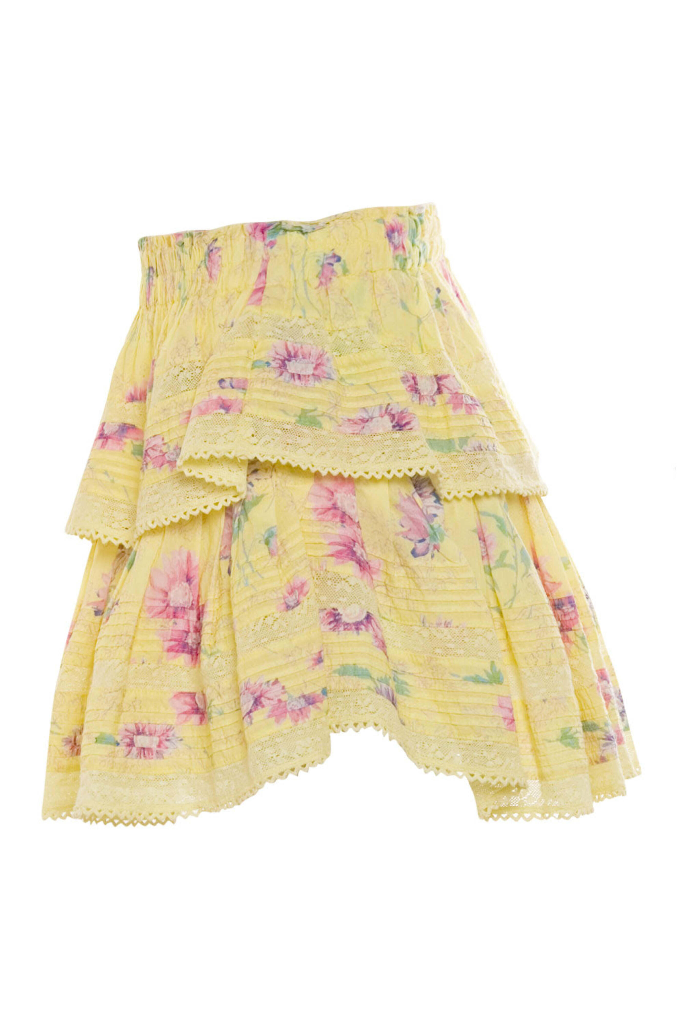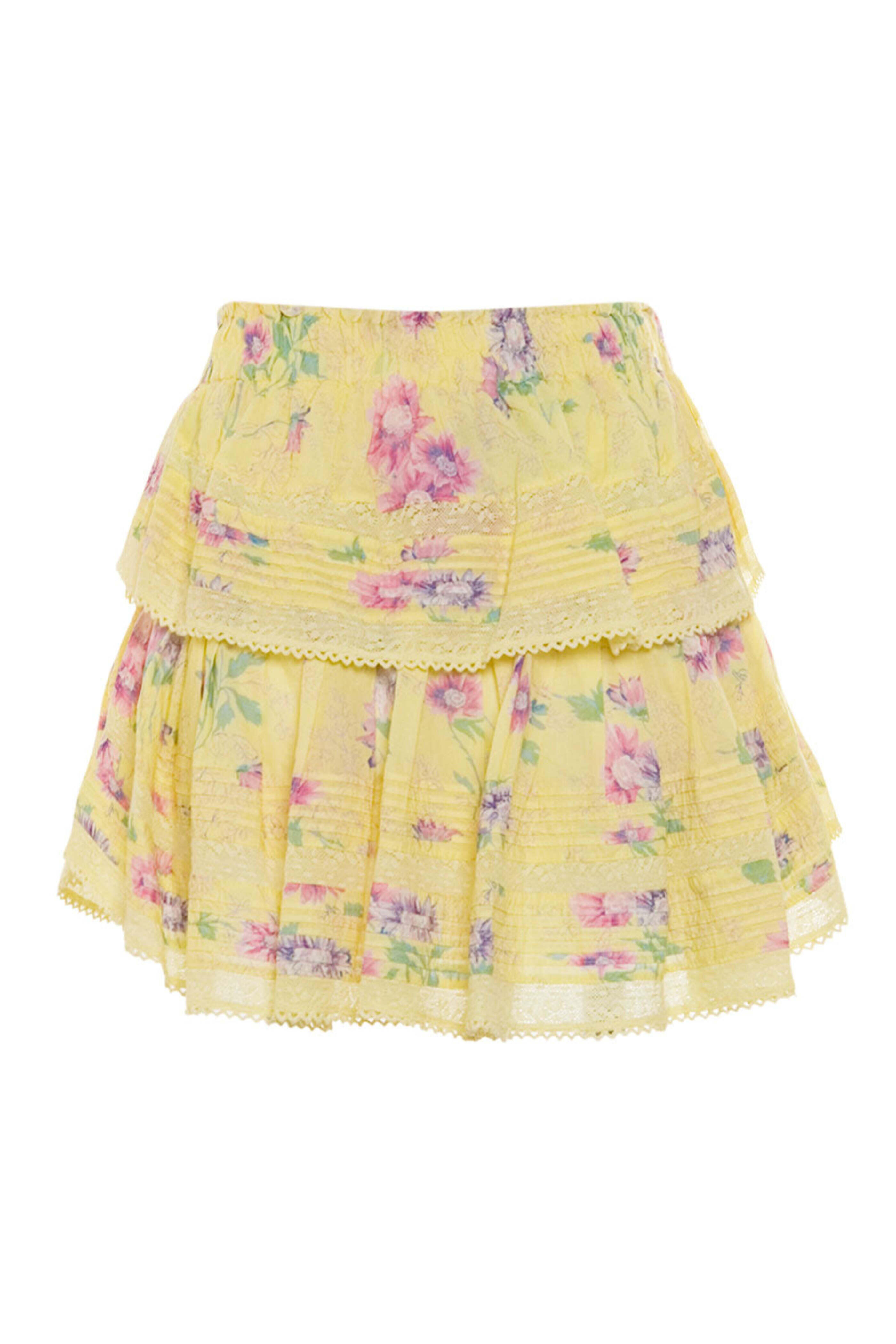 LoveShackFancy Bright Azalea Ruffle Mini Skirt. Elastic waistband. Tiered silhouette. Curved hem. Mini length. Lined. 100% viscose outer; 100% polyester lining.
