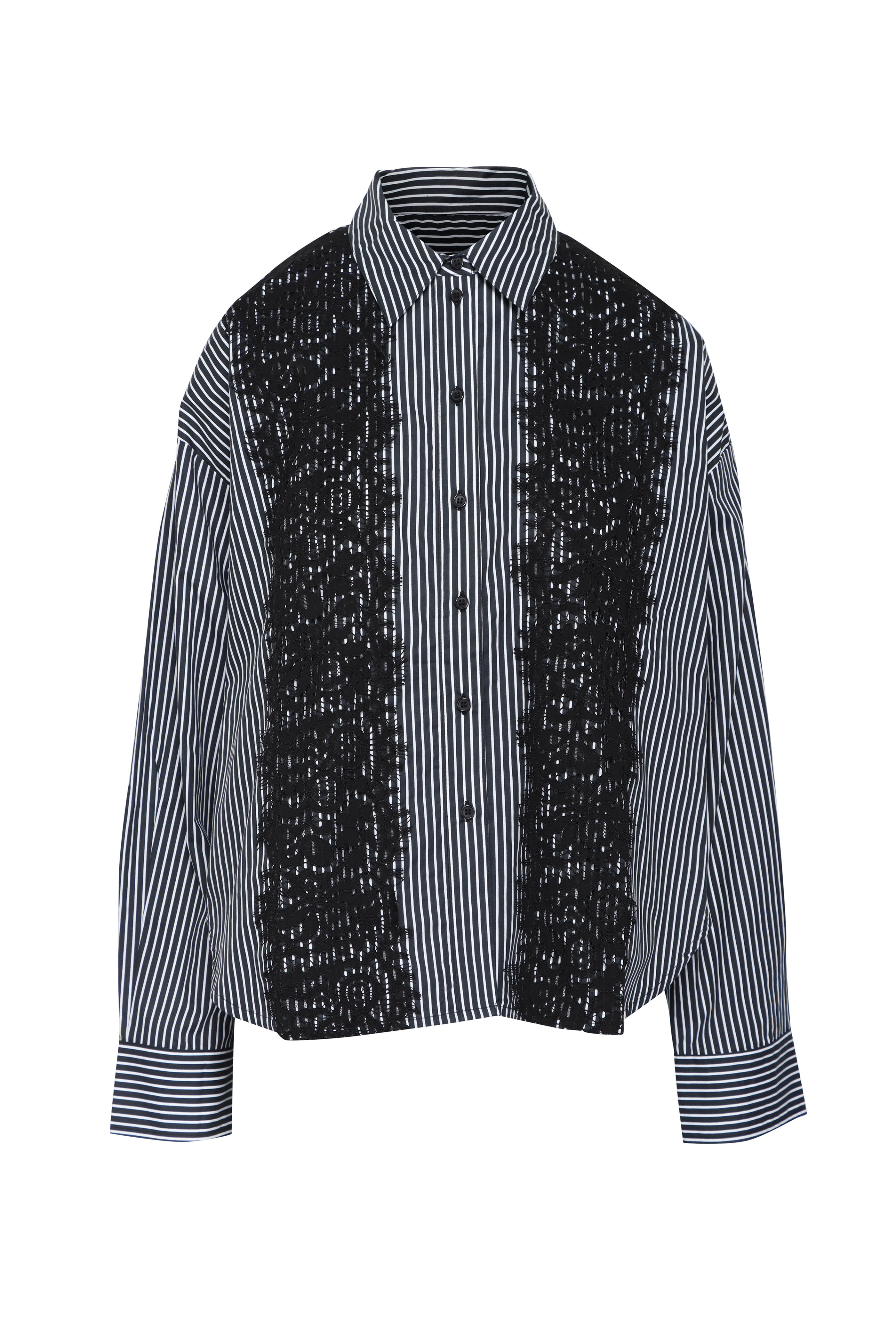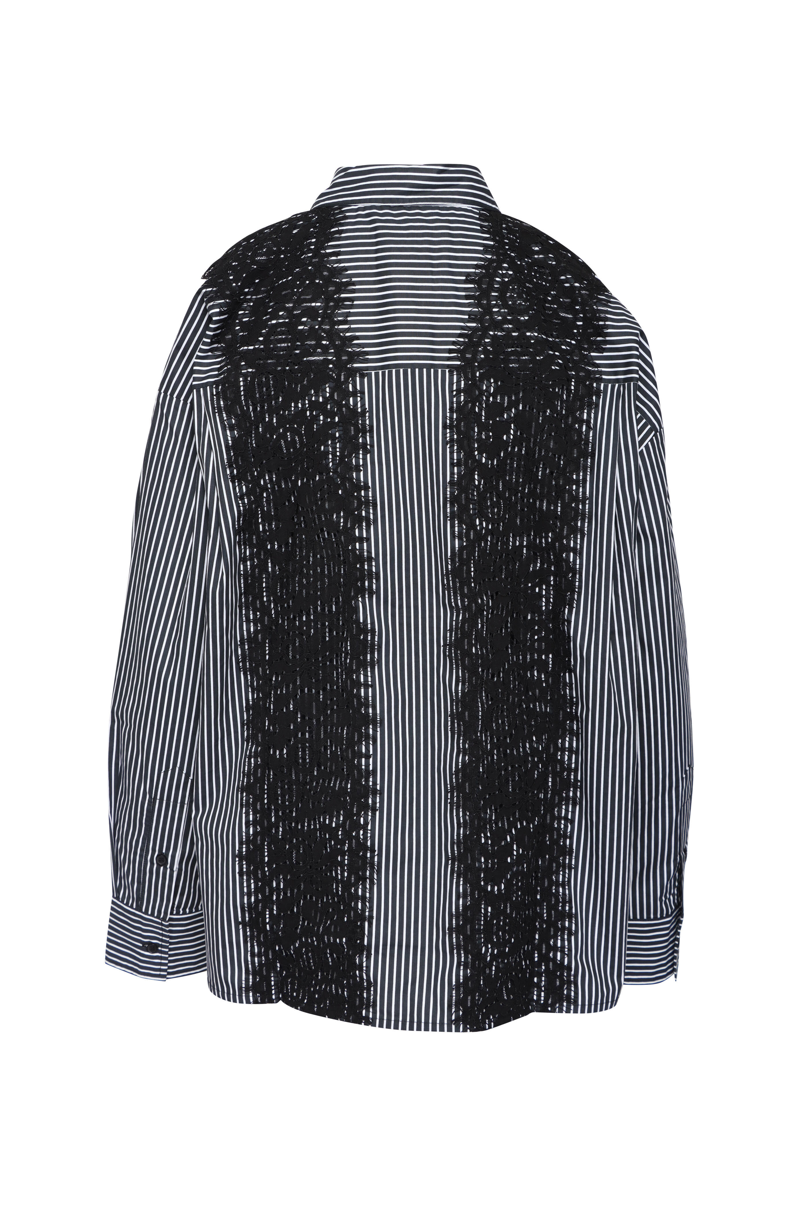 Collar. Drop shoulders. Long sleeves; button cuffs. Button front closure. Lace detail. Oversized fit. Imported. Bust 54” (Size S). Length 26” (Size S). 100% cotton. Handwash.