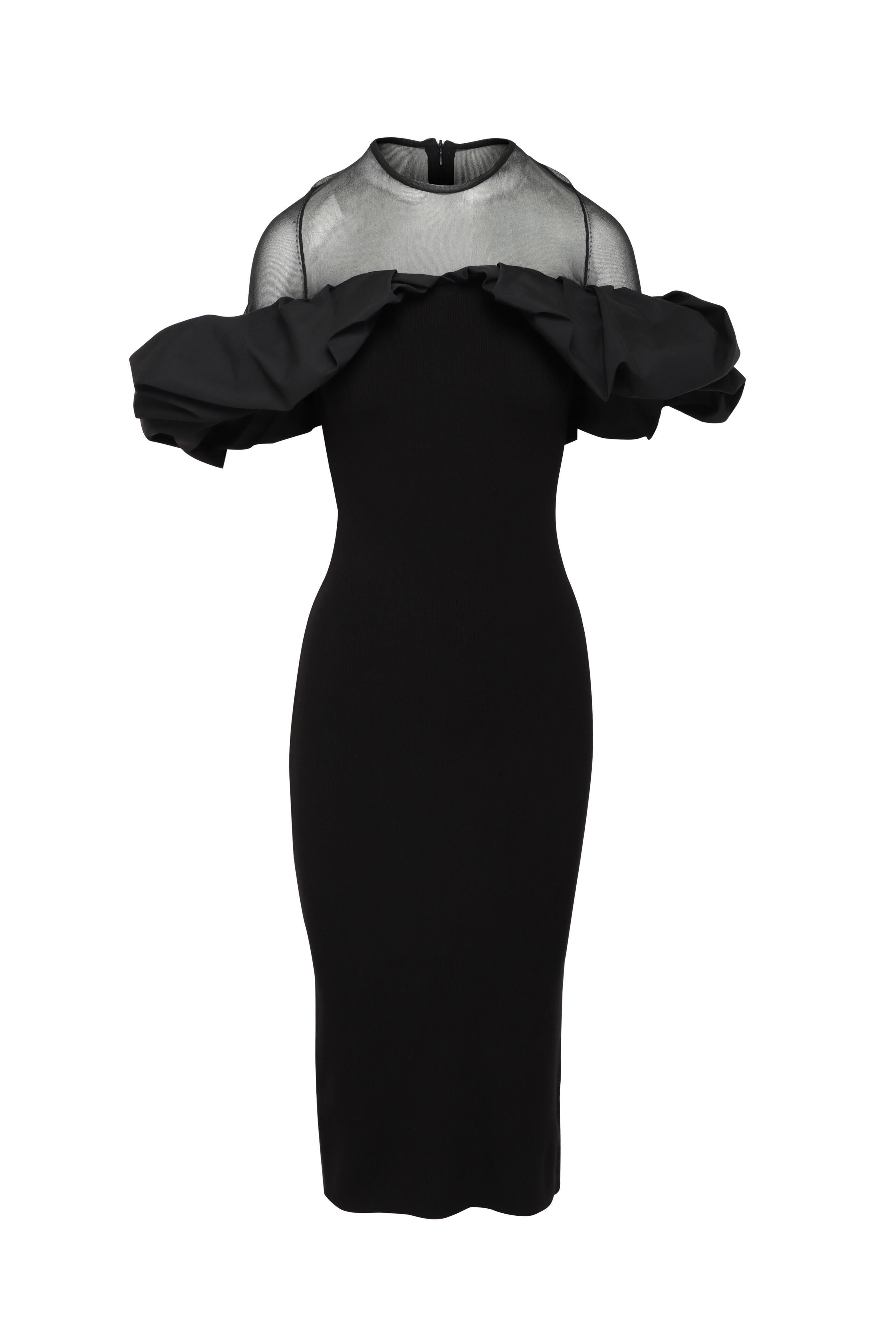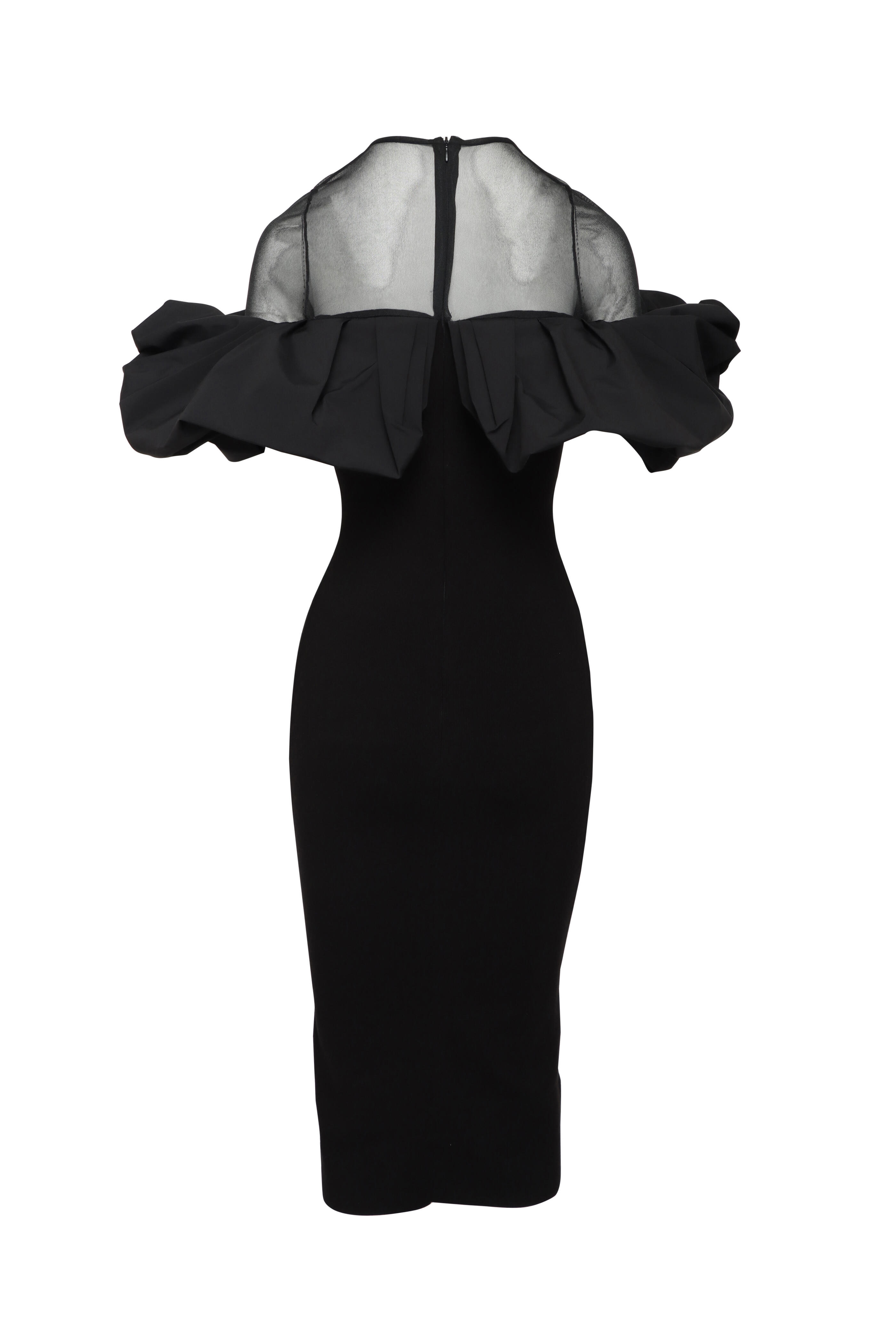 Sheer upper detail. Short puff sleeves. Concealed back zip closure. Slim silhouette. Imported. Midi length. 62% viscose, 38% polyester outer 1, 55% polyamide, 45% polyester outer 2. Handwash.