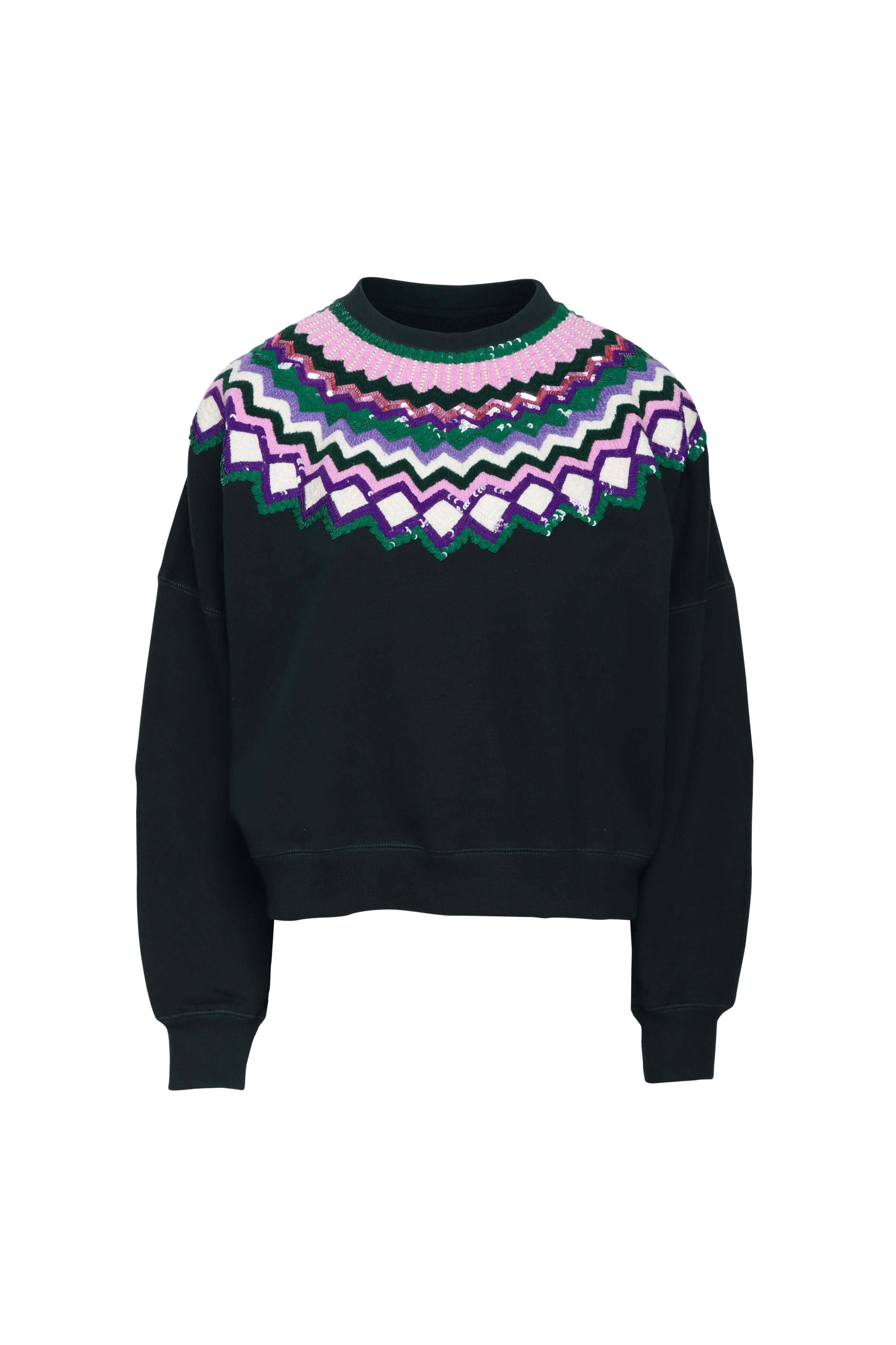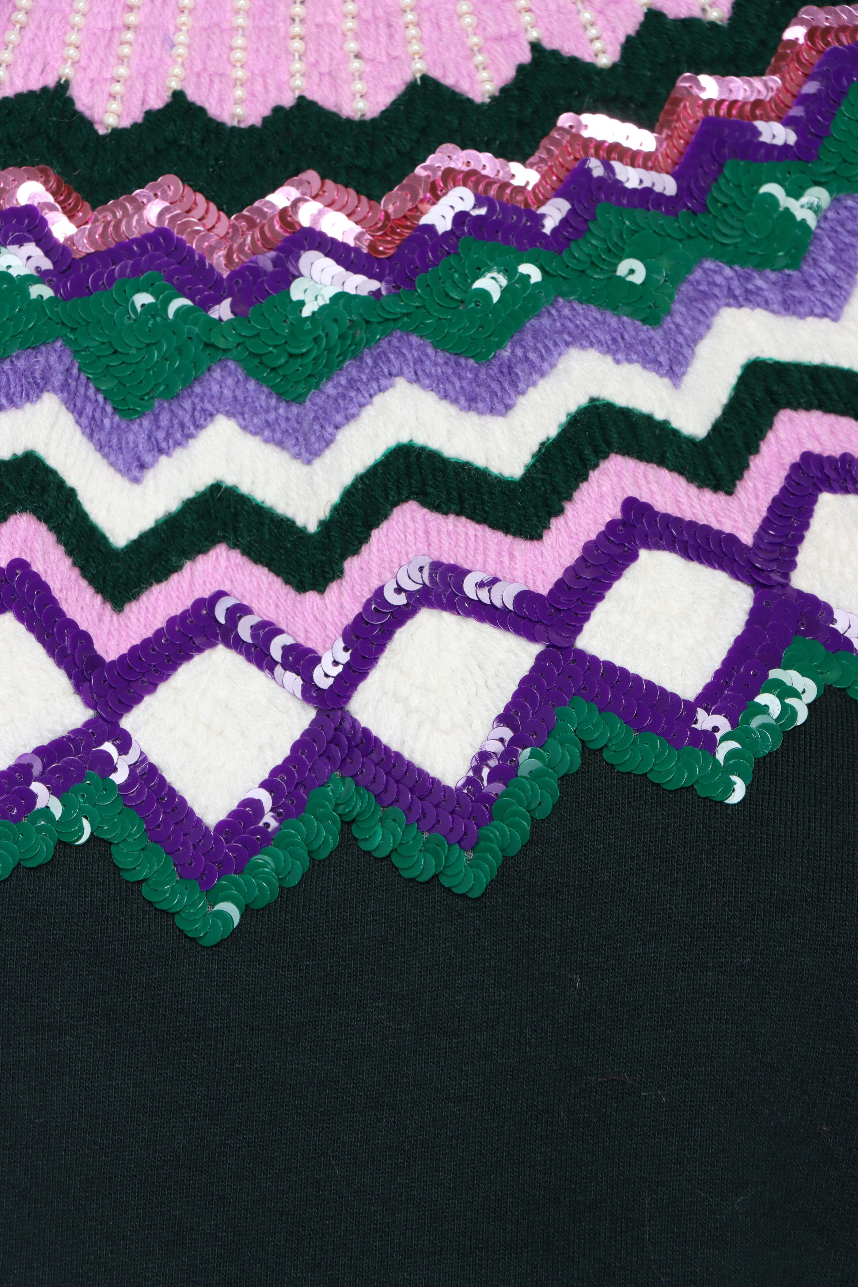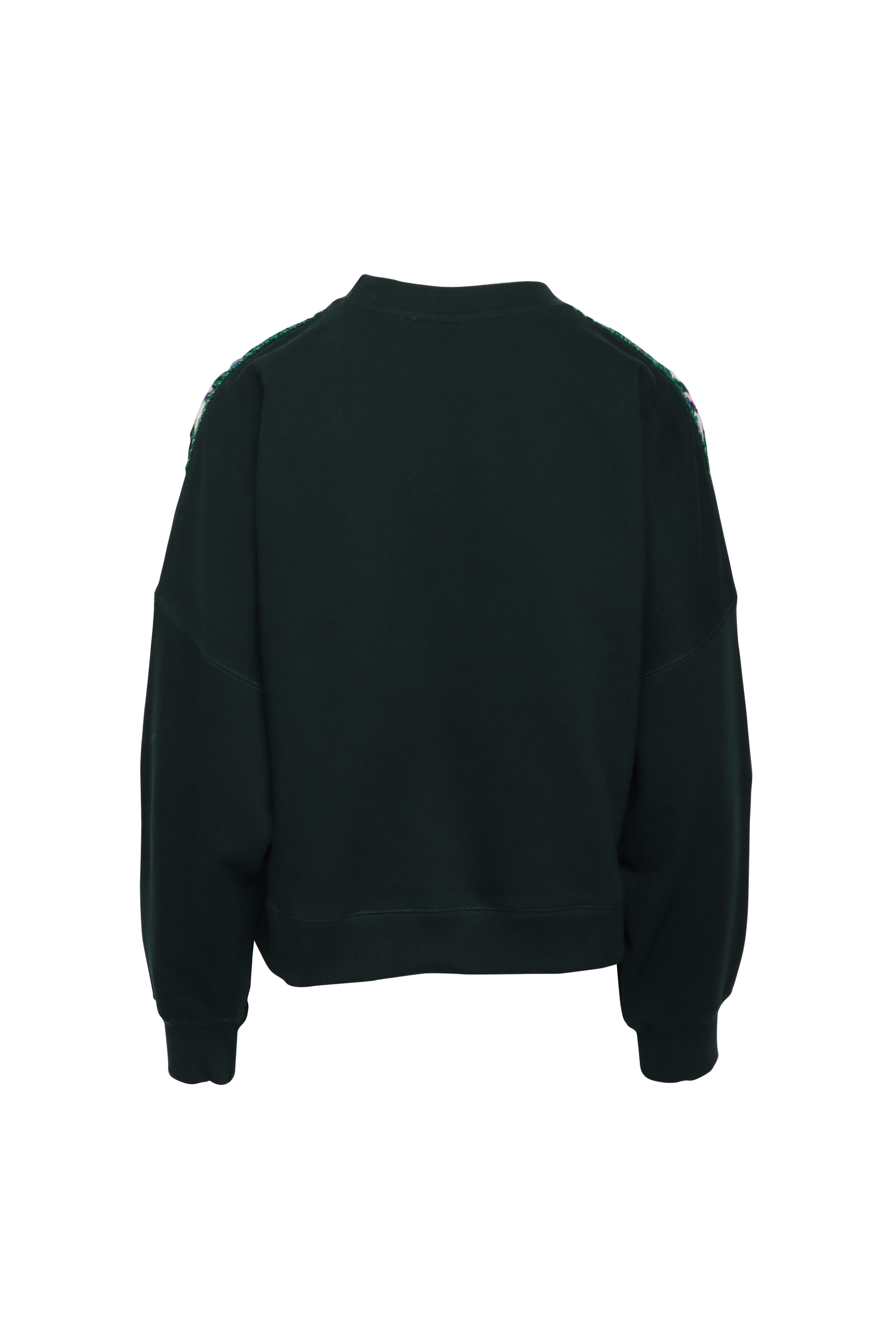 Crewneck. Drop shoulders. Long sleeves. Relaxed fit. Embellished detail. Imported. Sleeve 18” (Size S). Length 23” (Size S. 100% cotton outer, 100% polyvinyl chloride sequin detail, 100% acrylic embroidery. Handwash.