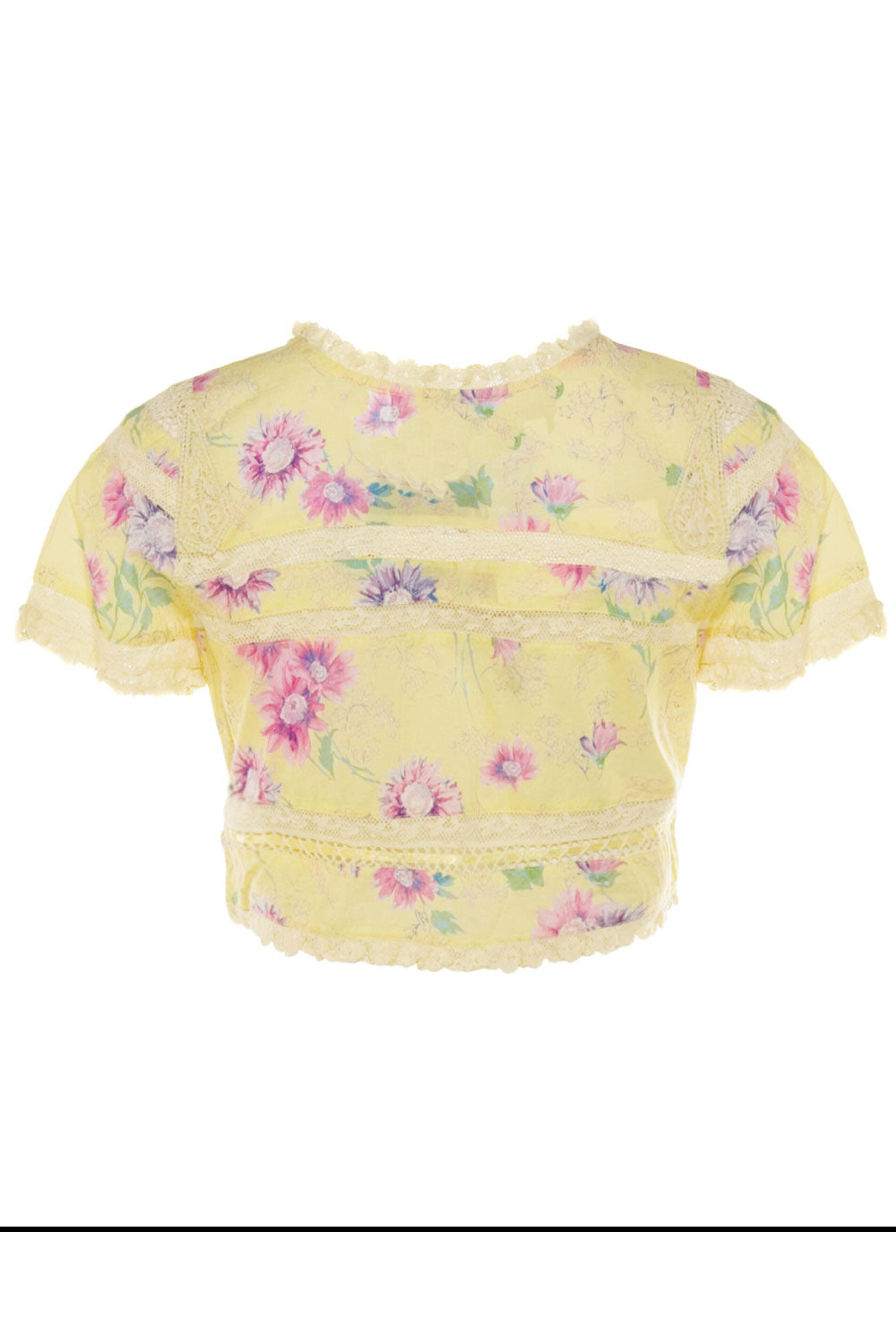 LoveShackFancy Bright Azalea Farley Crop Top. Round neck. Short sleeves. Front button closure with hidden placket. Self-tie detail. Lace detail throughout. Cropped length. 100% cotton.