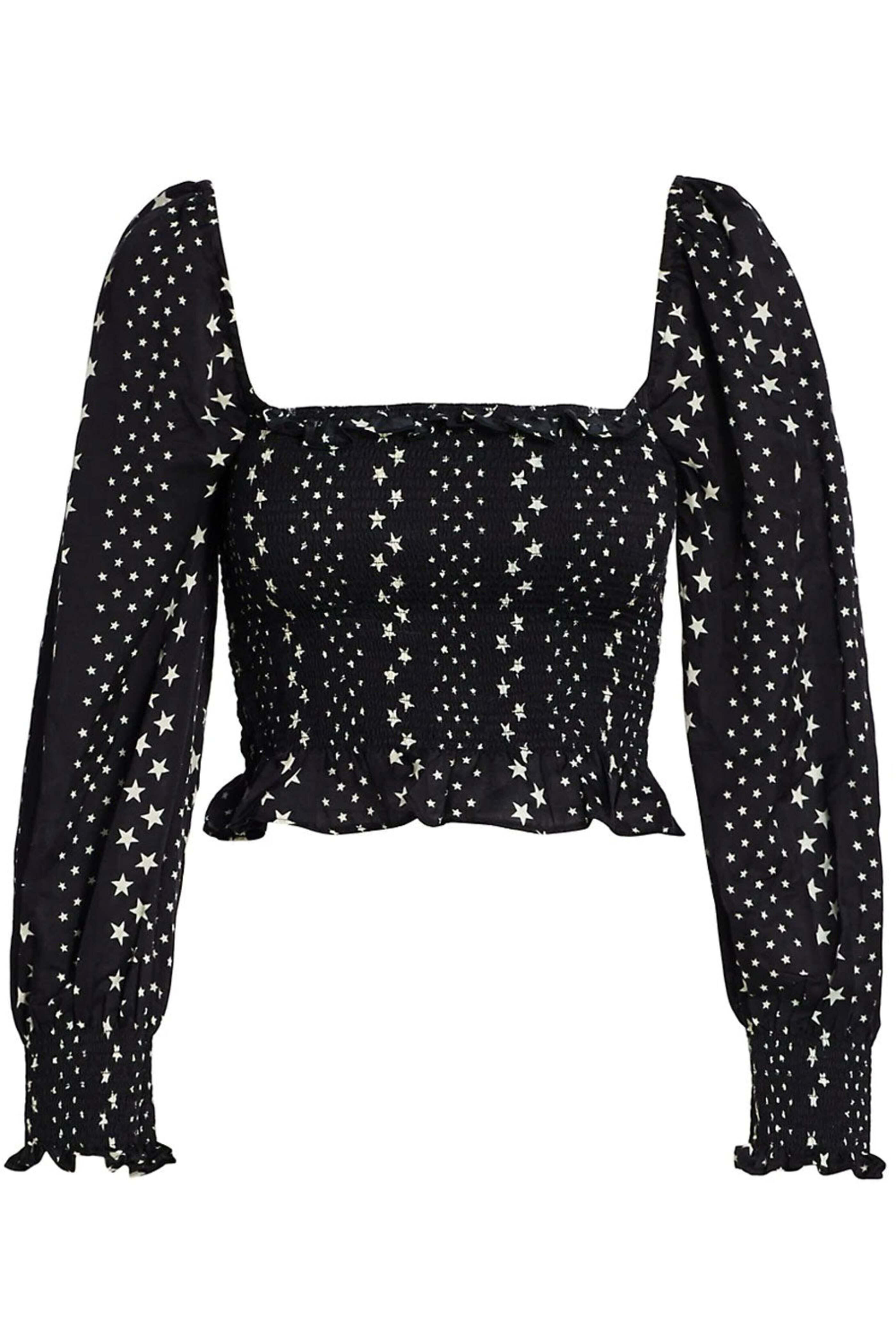 LoveShackFancy Black Satin Star Russell Top. Square neck. Square back. Long puff sleeves; smocked cuffs. Smocked bodice. Slim fit. Hip length. 70% cotton, 30% silk.