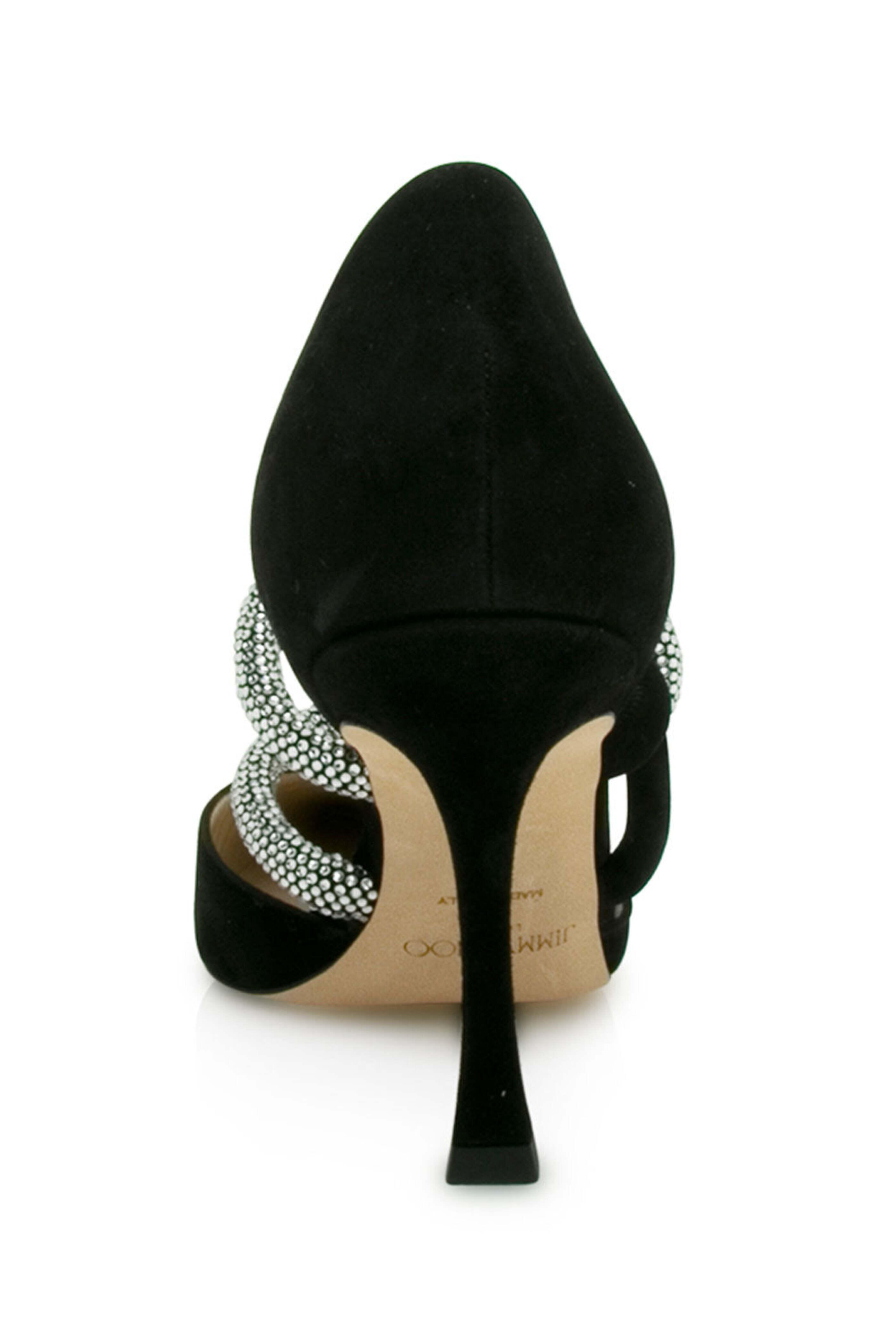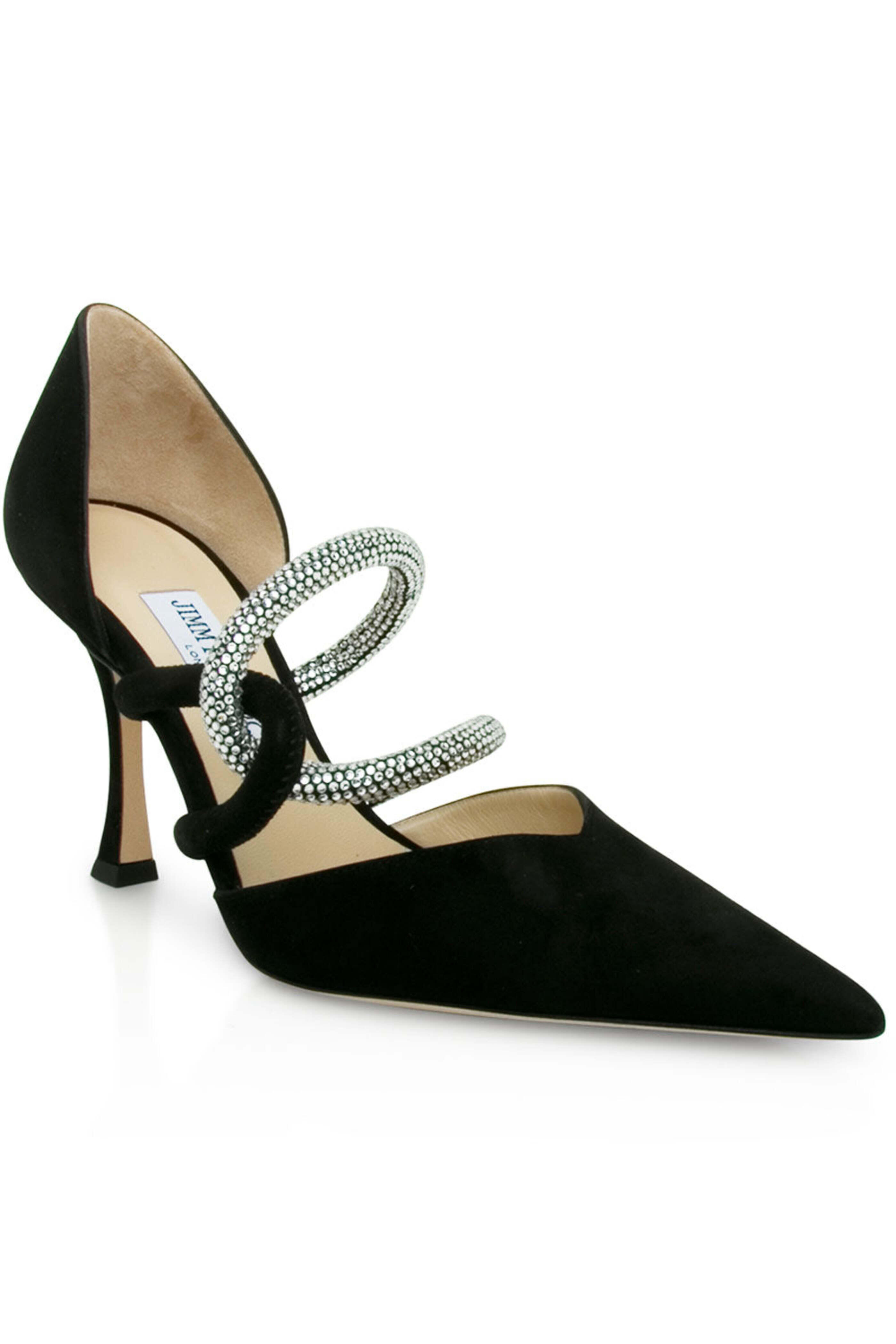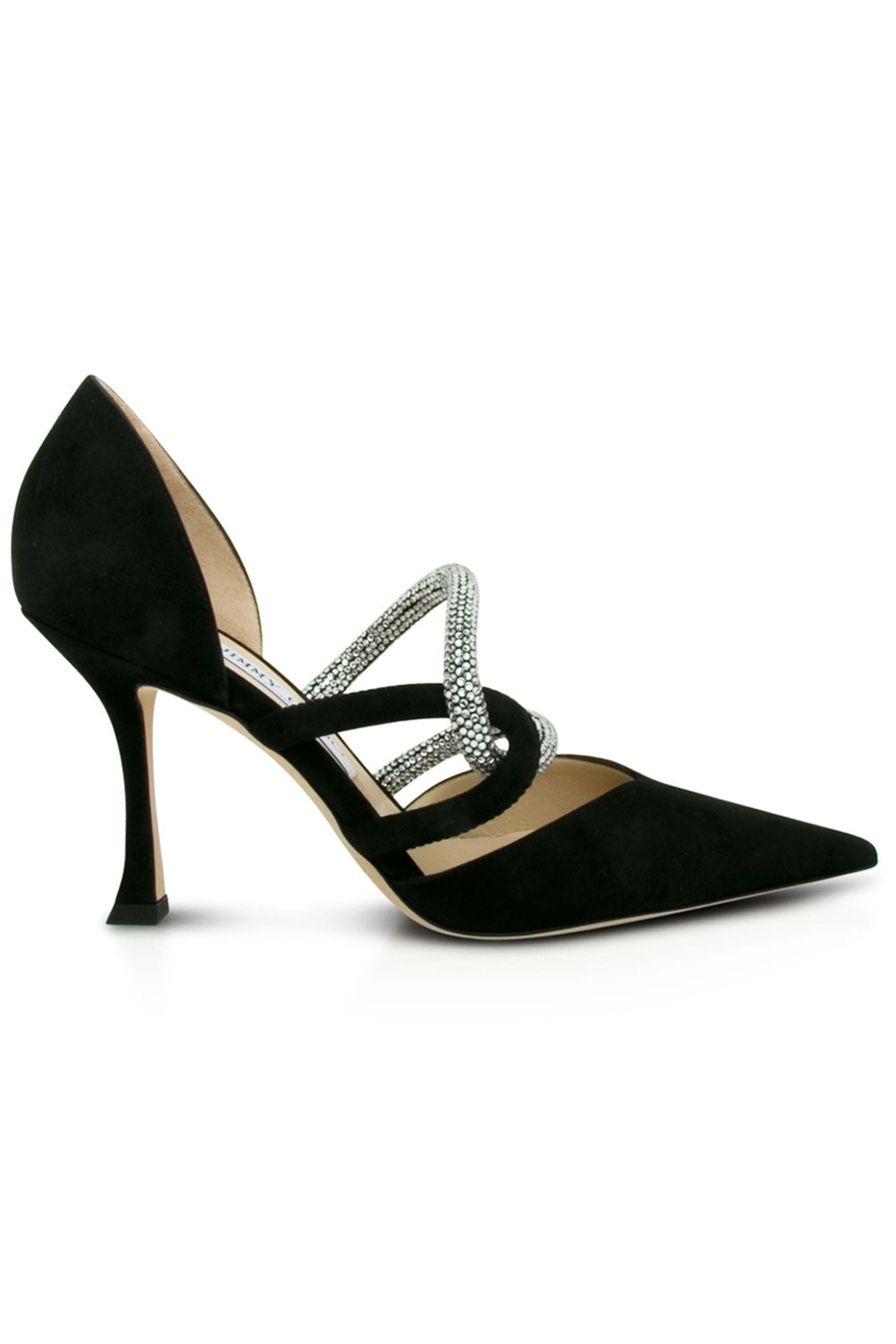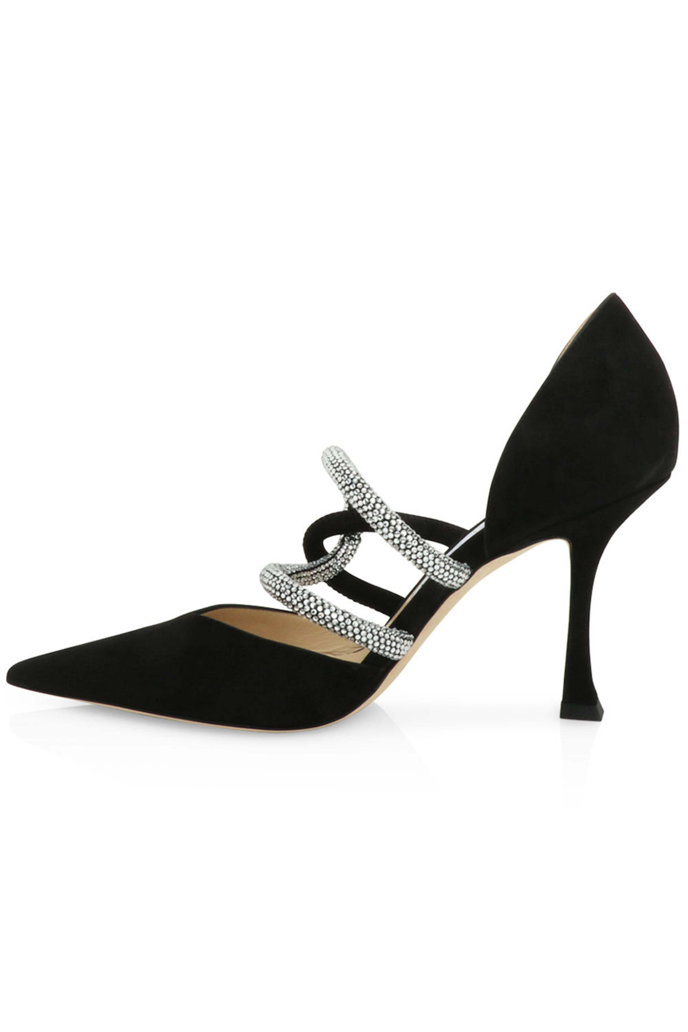 Jimmy Choo Luis Pump in Black. Pointed toe. 3.5 heel. Crystal embellished straps. Leather upper, lining, and sole. Made in Italy.