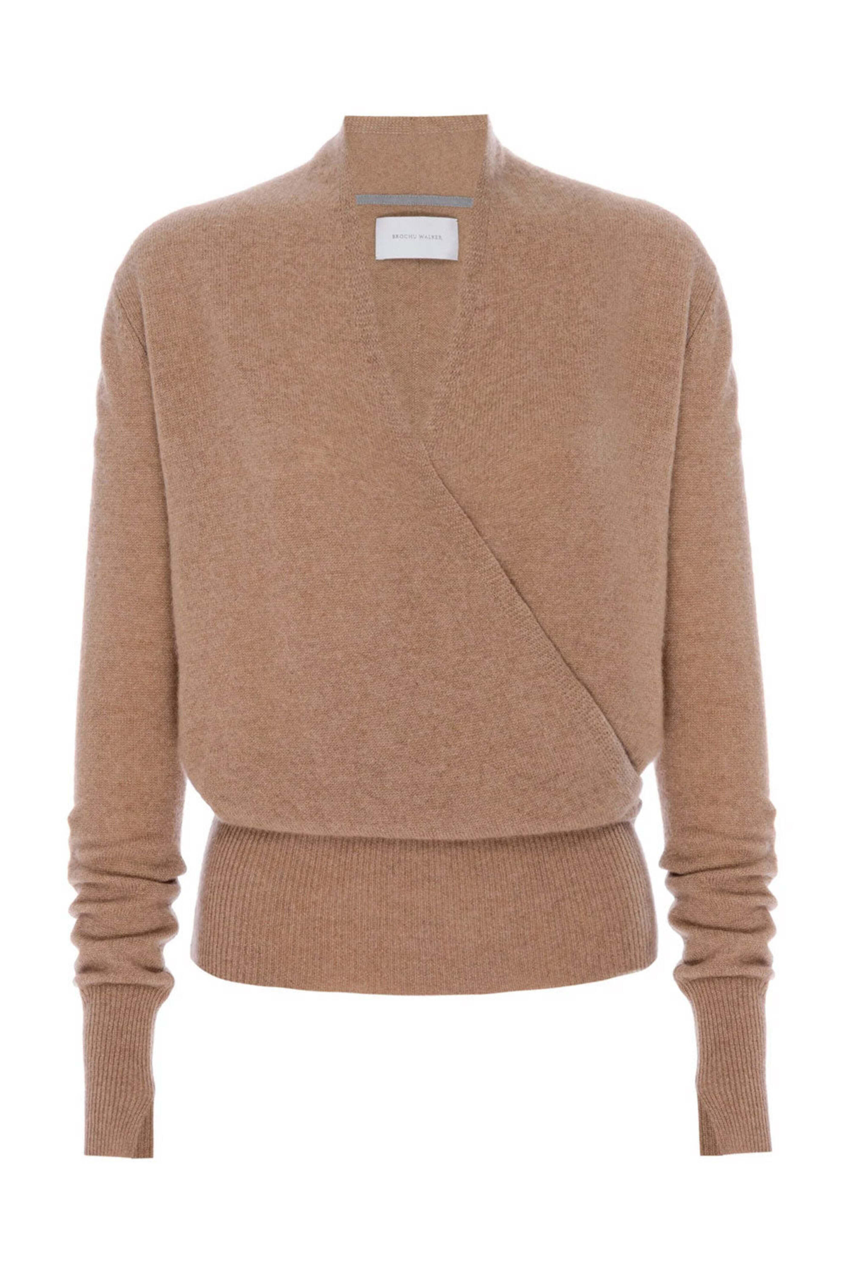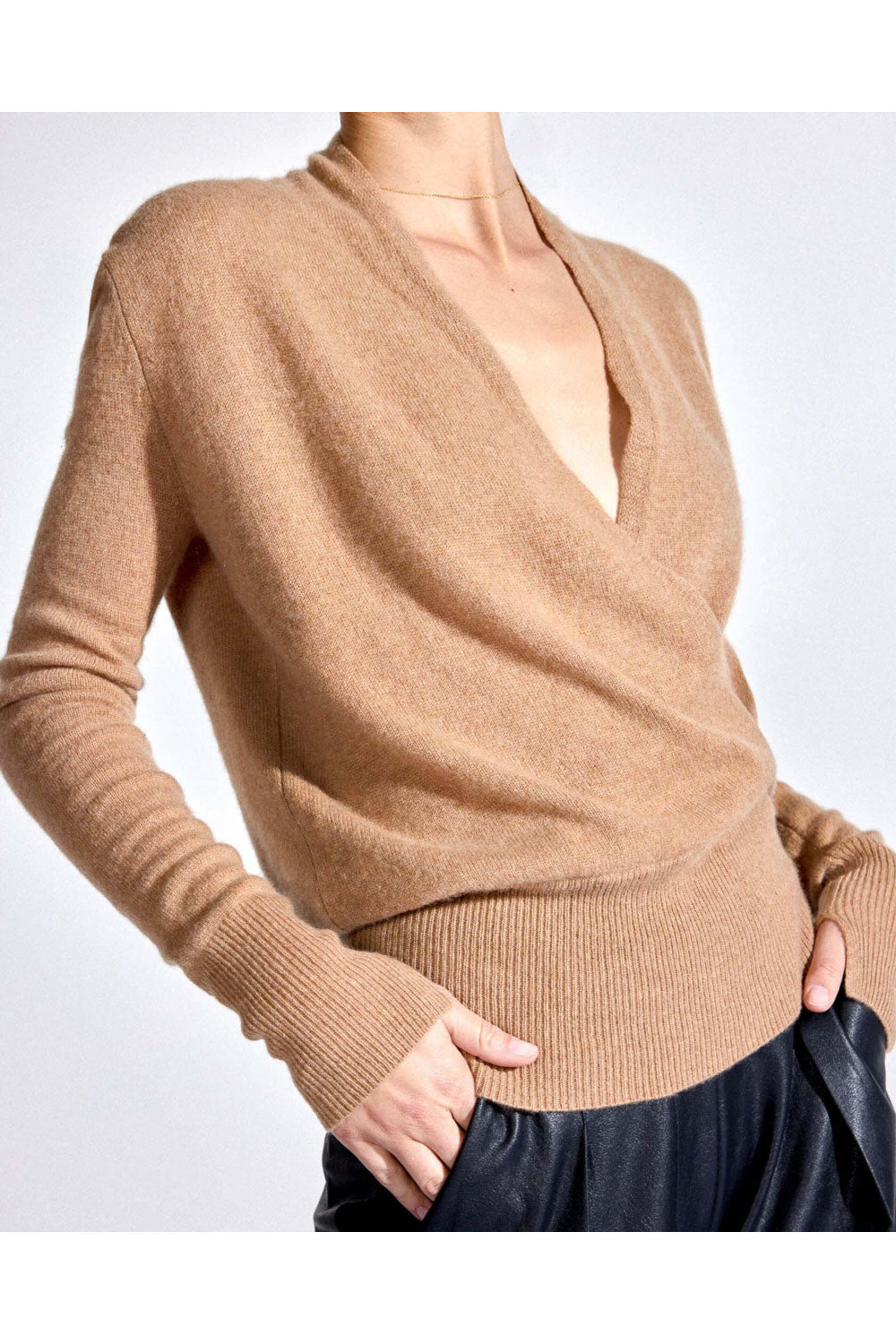 Brochu Walker Carmel Melange Phinneas Wrap Sweater. V Neck. Long sleeves; split cuffs. Self wrap front. Ribbed detail at cuffs and hem. Slim fit. 100% Cashmere.