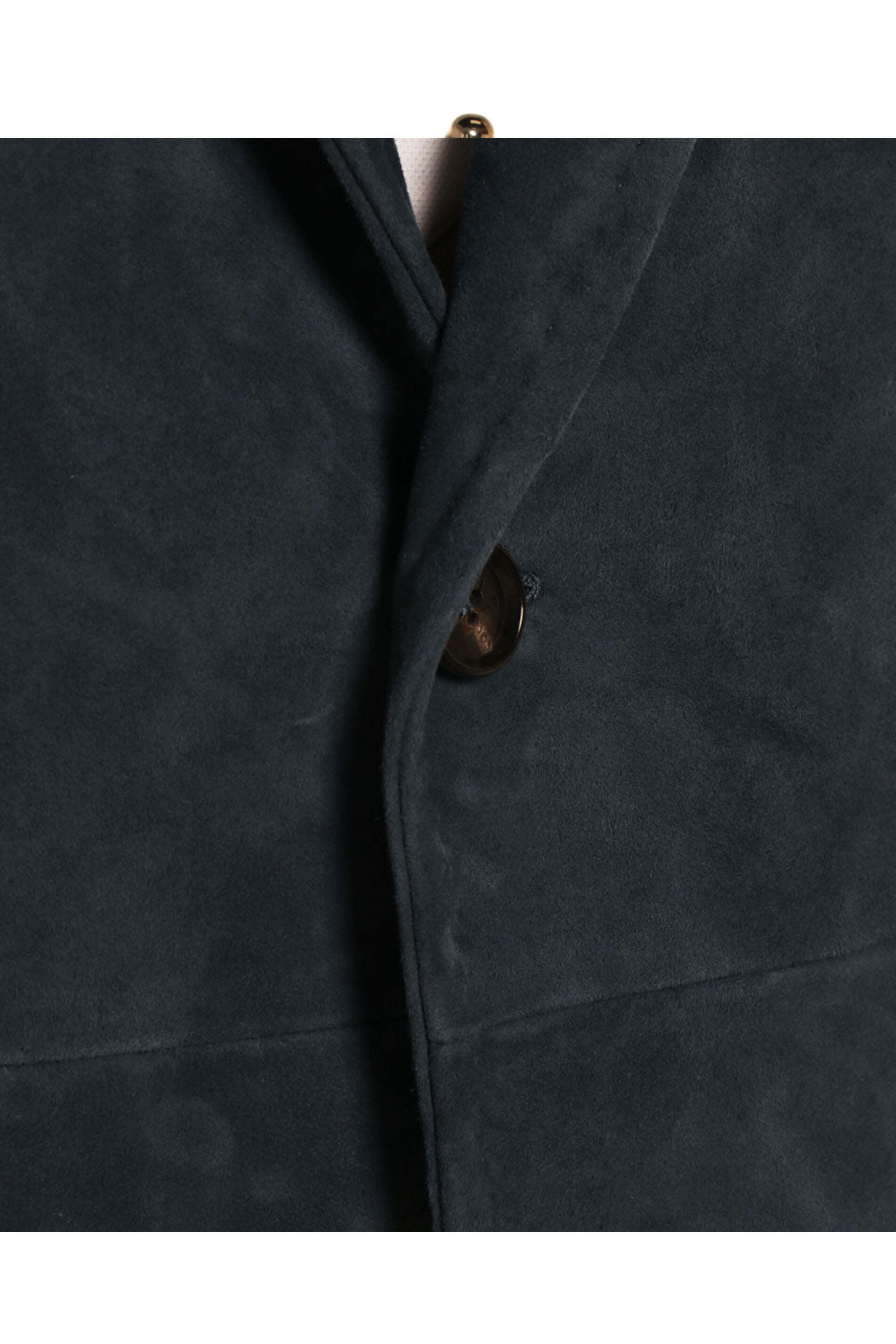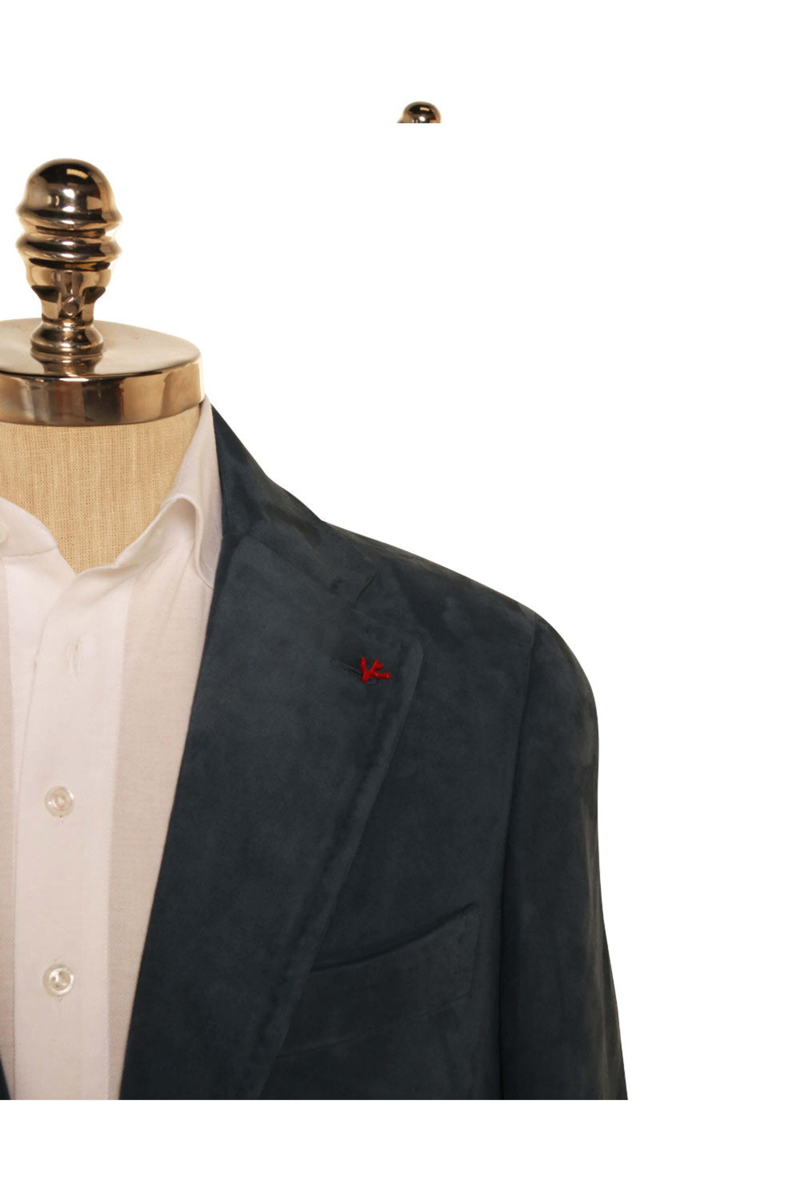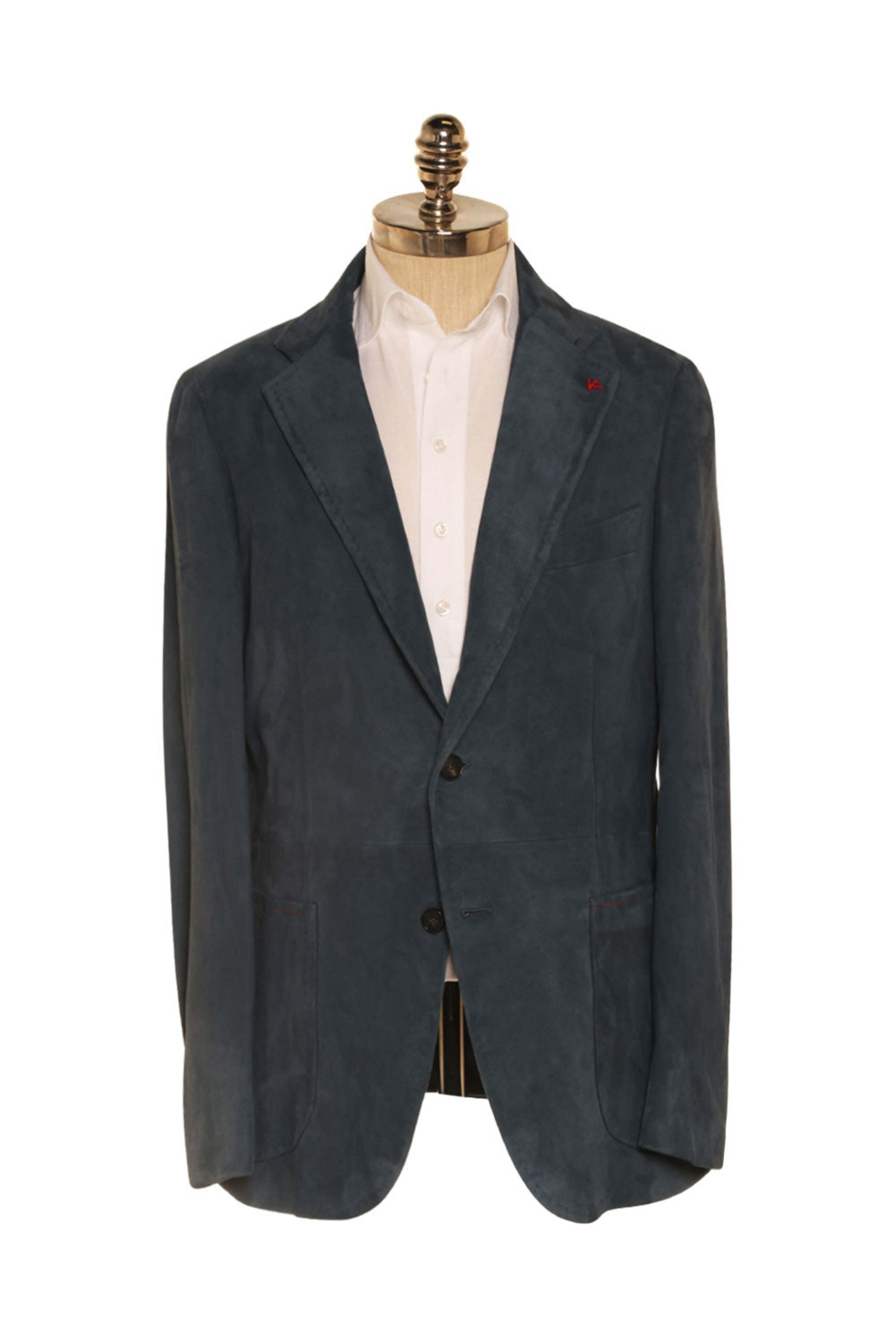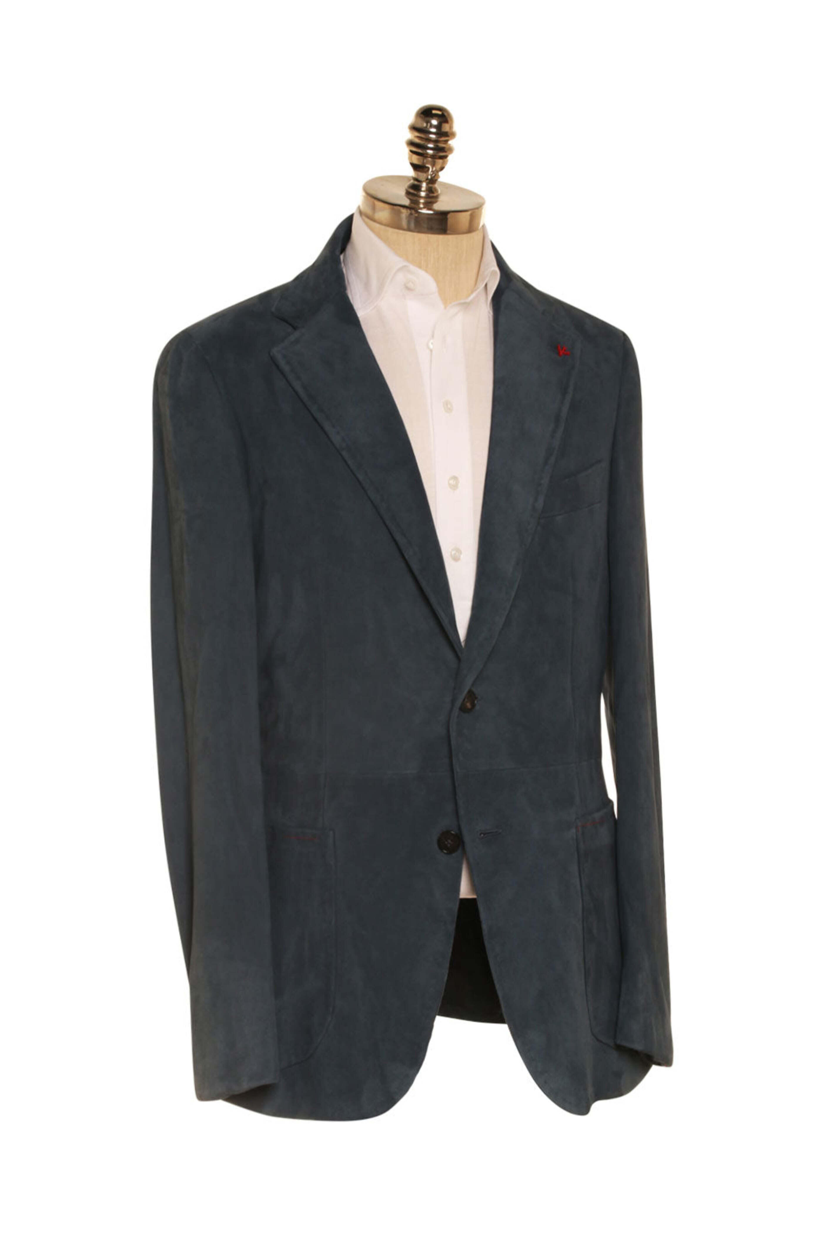 Isaia Medium Blue Suede Sportcoat. Notch lapels. Two button jacket. Front left chest welt pocket. Waist patch pockets. Signature Isaia lapel pin. Single back vents. Unfinished buttonholes. Pick stitch detailing. Fully lined. Cupro lining. Made in Italy. 100% lamb.