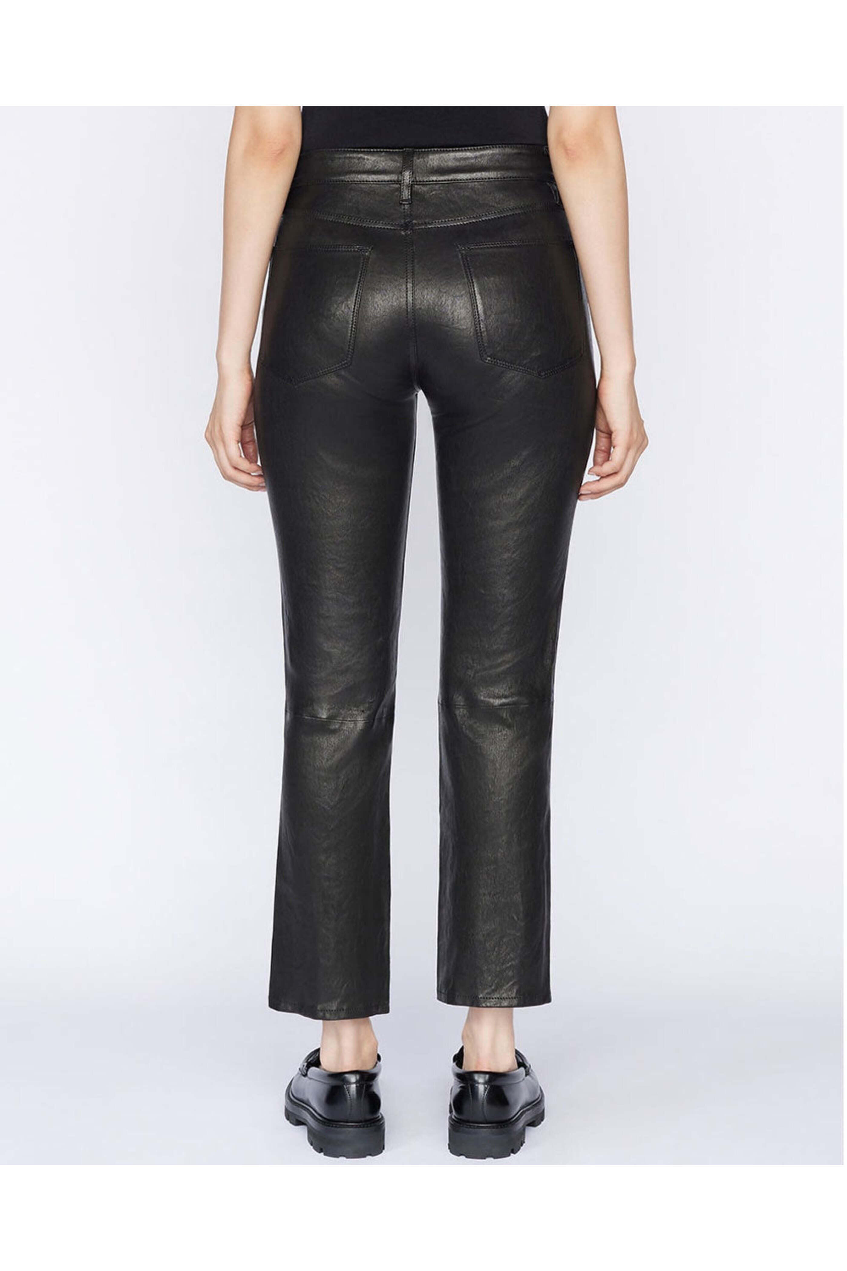 Frame Le High Straight Pant in Noir Leather. High rise. Button closure. Zip fly. Belt loops. Five pocket style. Straight through leg. Cropped length. 100% leather.