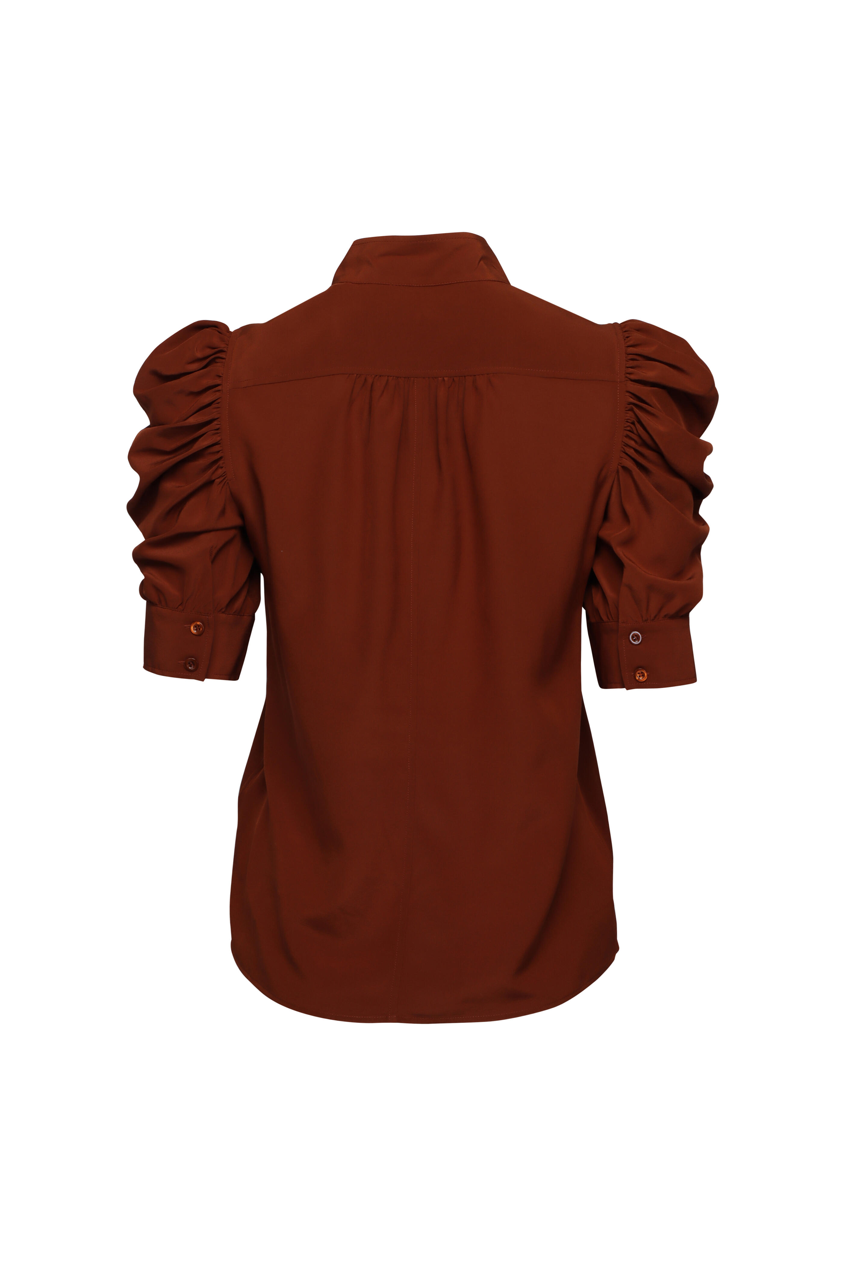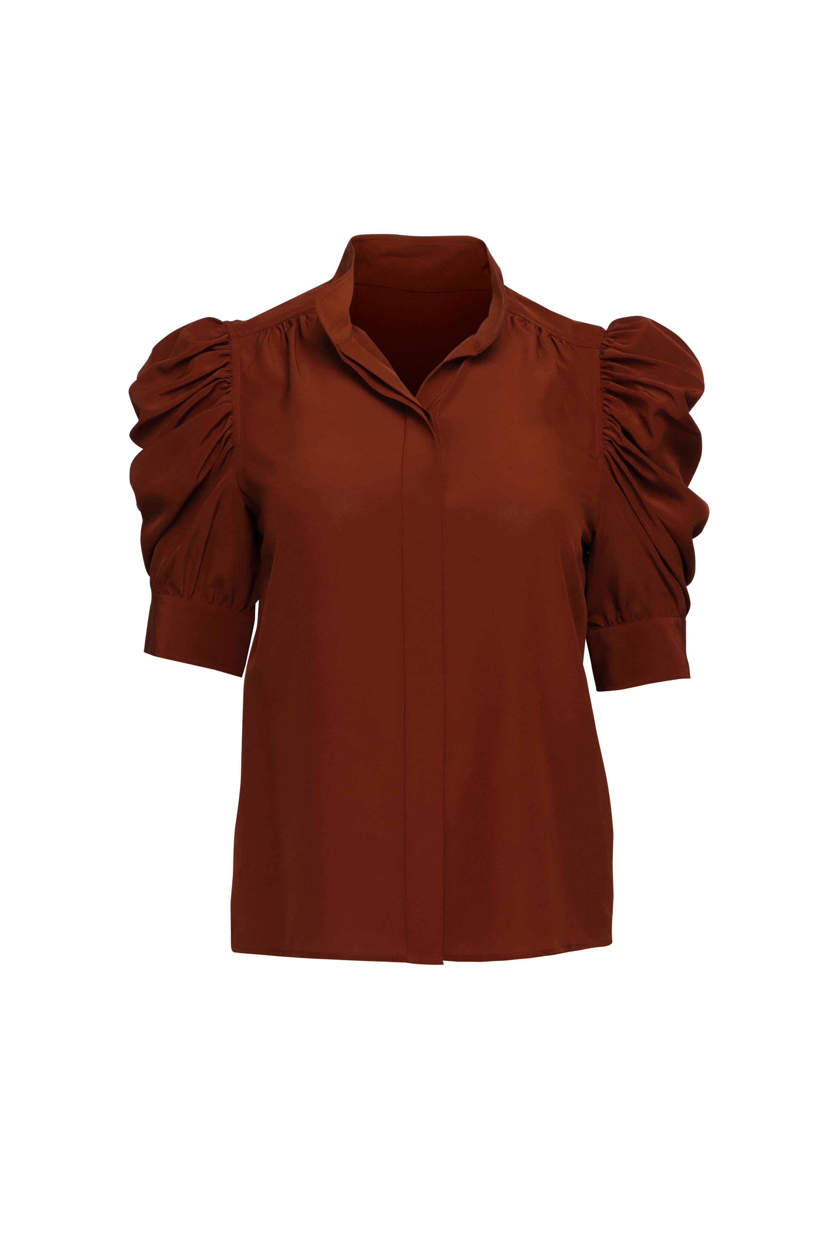 Stand collar. Puff shoulders. Elbow length sleeves. Concealed button front closure. Imported. Length 25” (Size S). 100% silk. Dry clean.
