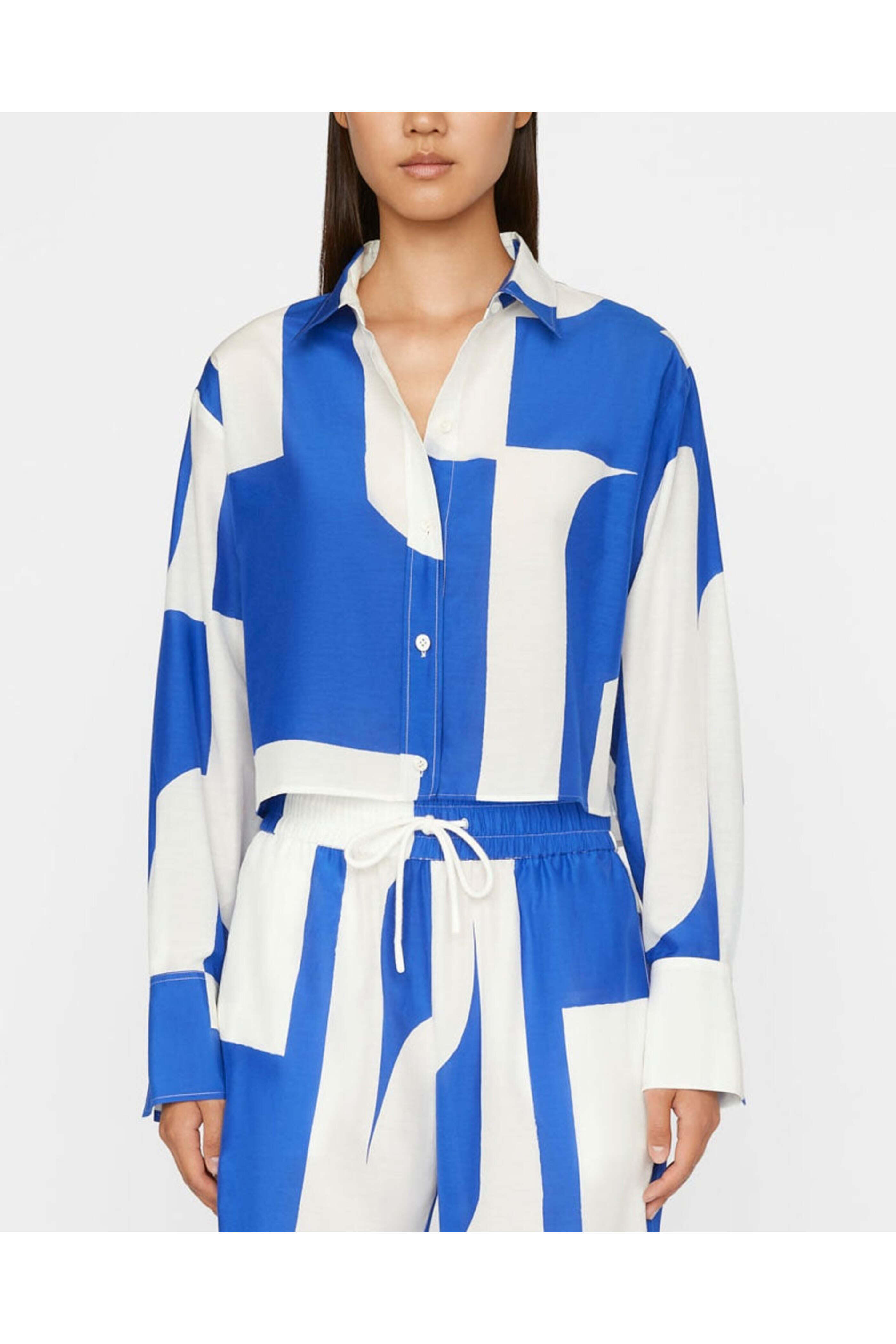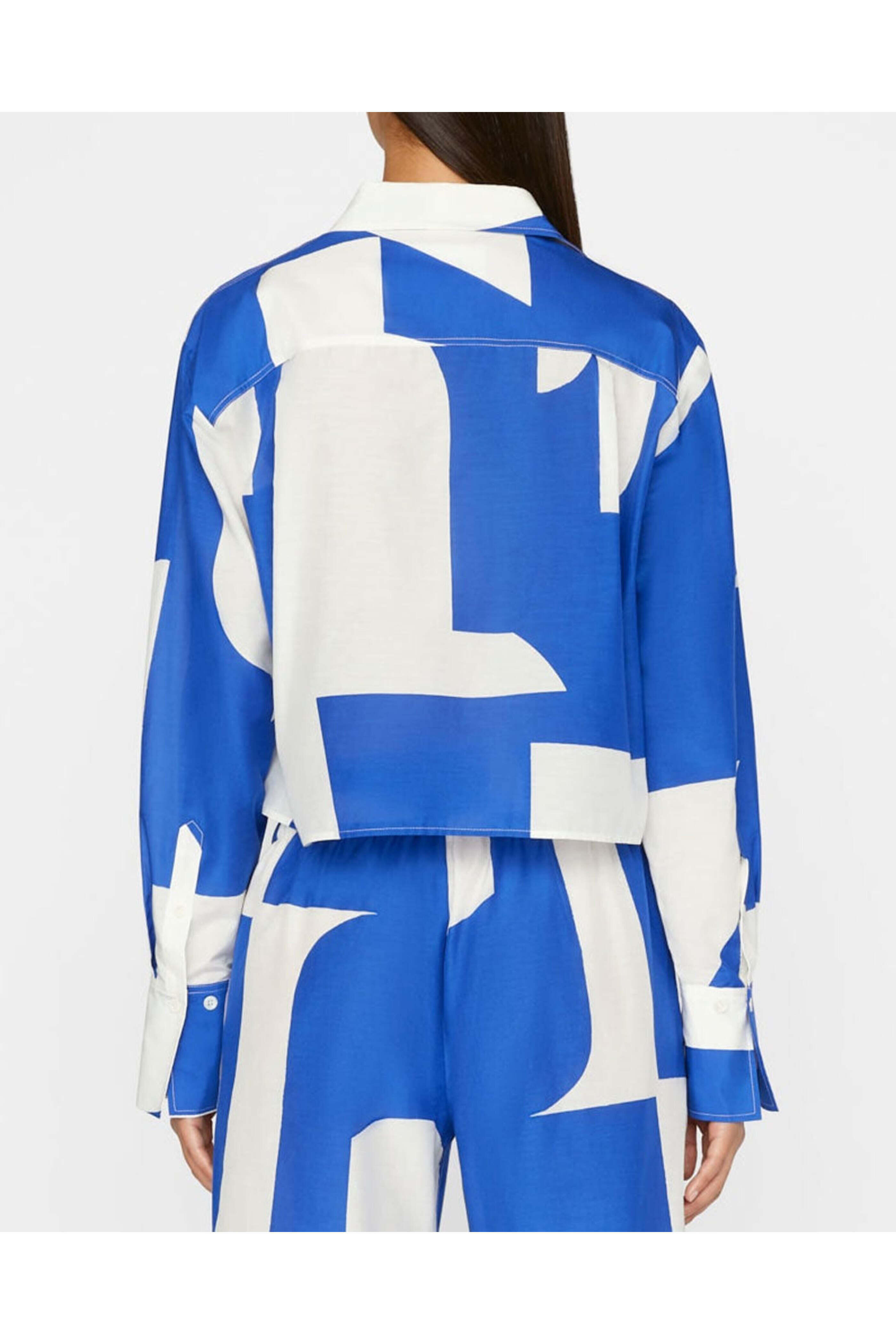 Frame The Cropped Oversize Shirt in Ultramarine. Collar. Drop shoulders. Long sleeves; button cuffs. Button down front closure. Boxy fit. Cropped length. Straight hem. 70% cotton, 30% silk.