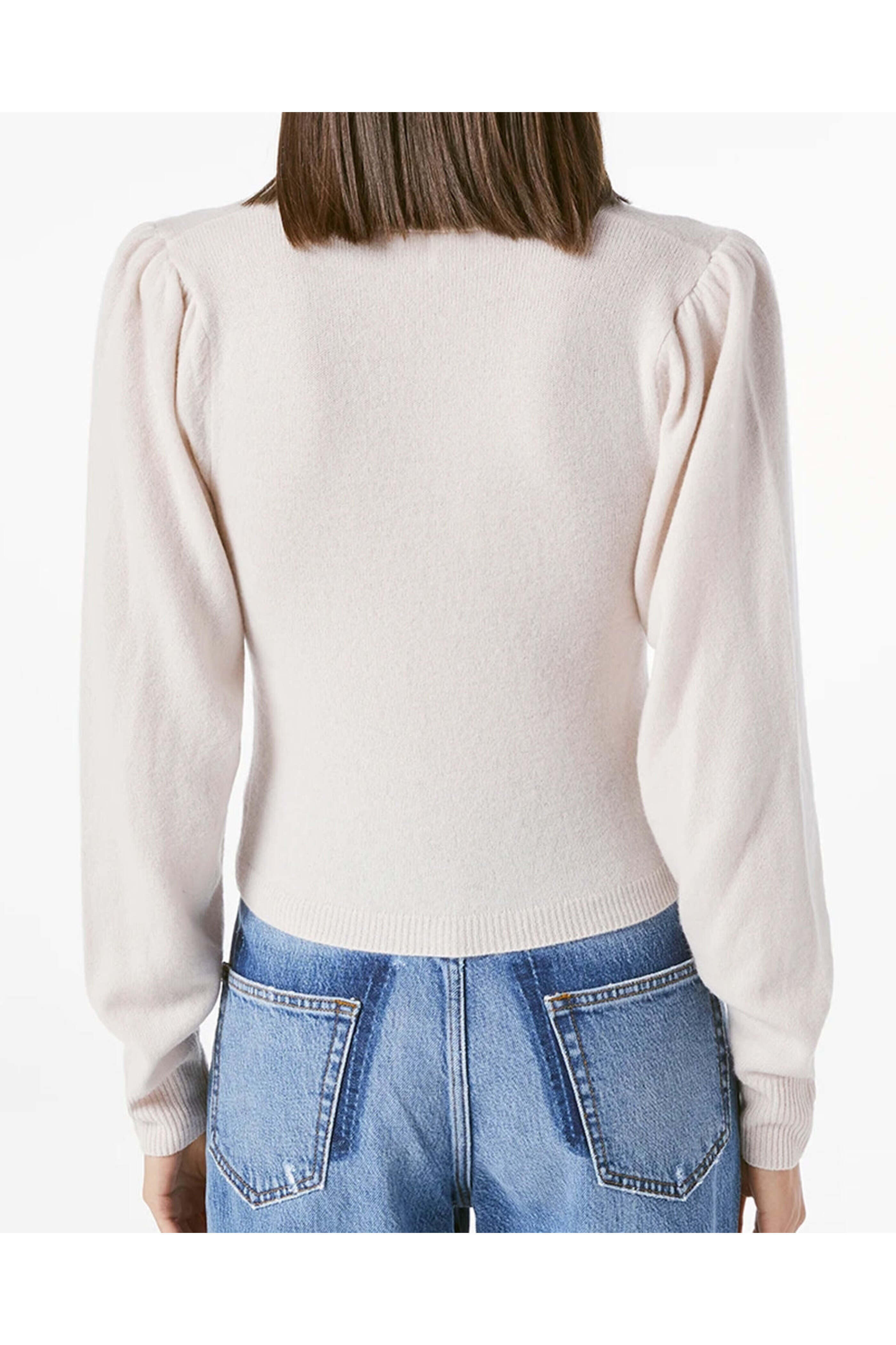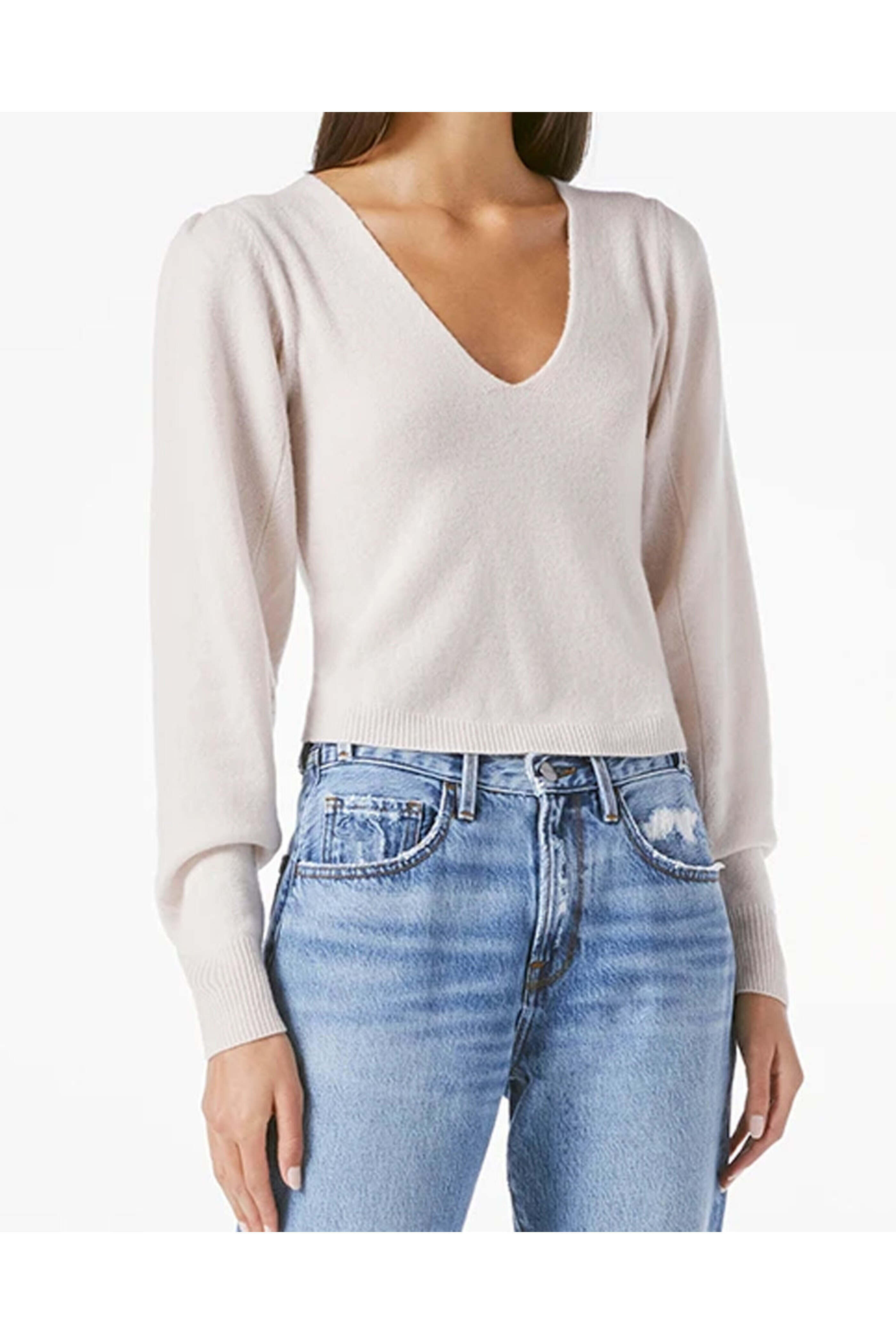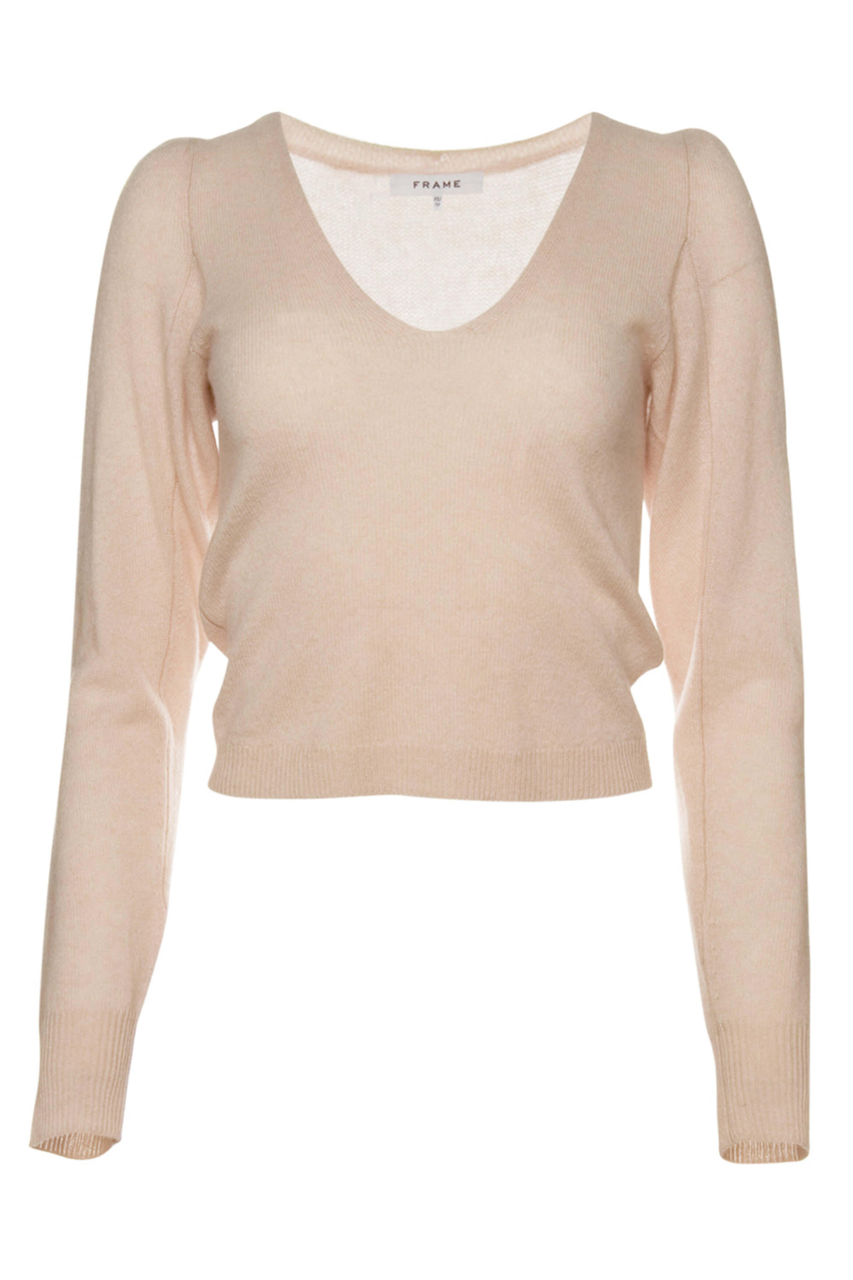 - Frame Champagne V Neck Leena Sweater V neck Puff shoulders Long sleeves Ribbed cuffs and hem Relaxed fit Unlined 100% cashmere