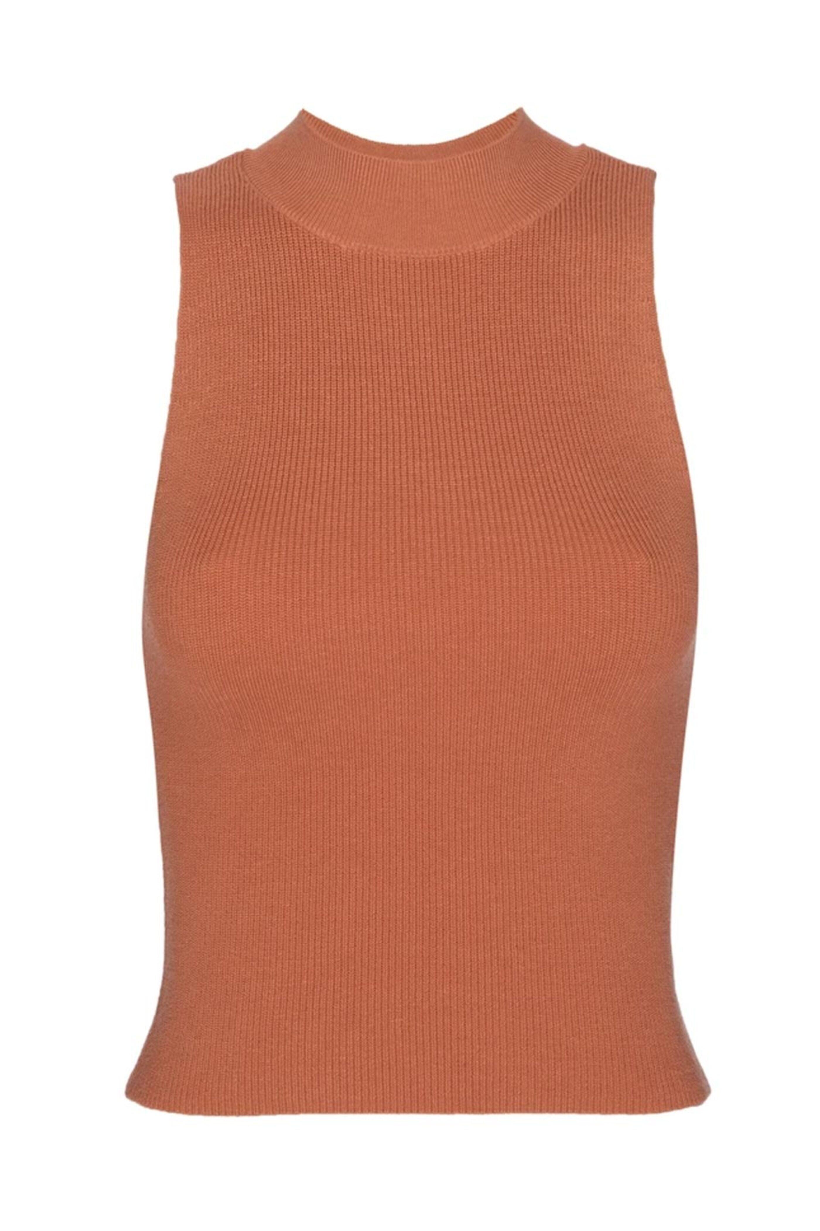 Frame Denim Tangerine Rib Mock Neck Sweater. Mock neck. Sleeveless. Fitted silhouette. Ribbed throughout. Unlined. 33% silk, 30% cotton, 32% nylon, 5% spandex.