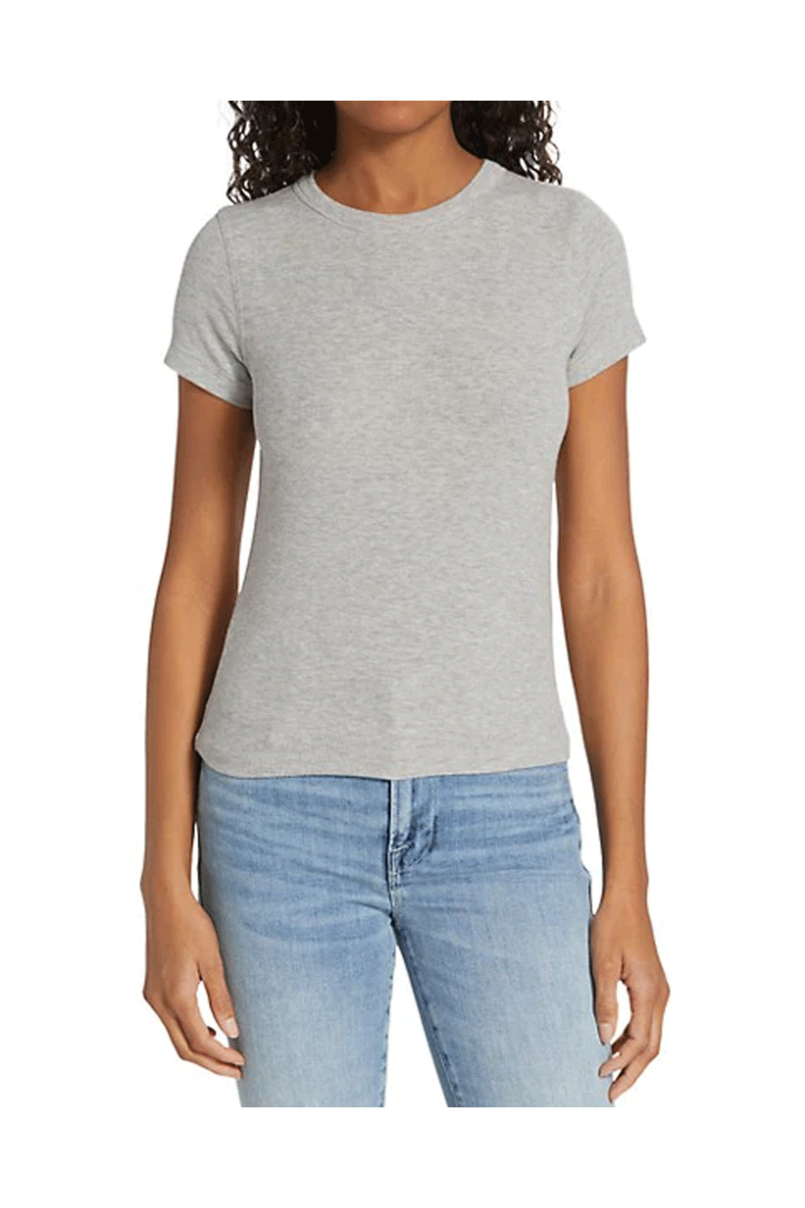 Frame Heather Gris Ribbed Shrunken Tee. Round neck. Short sleeves. Slim silhouette. 96% modal, 4% spandex.