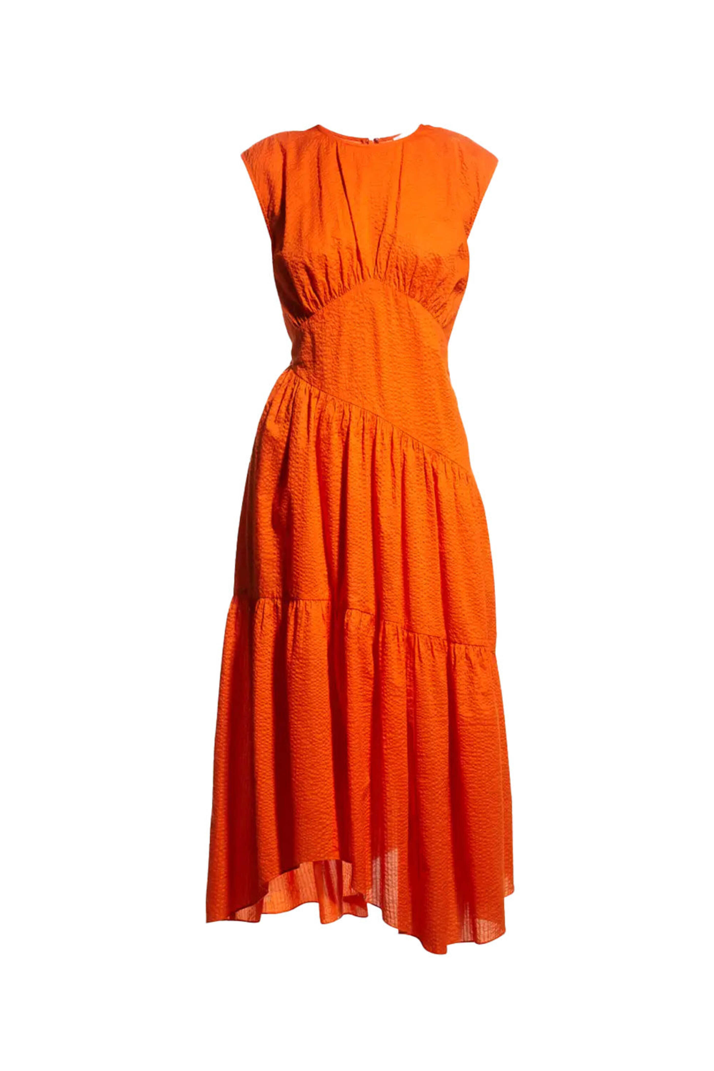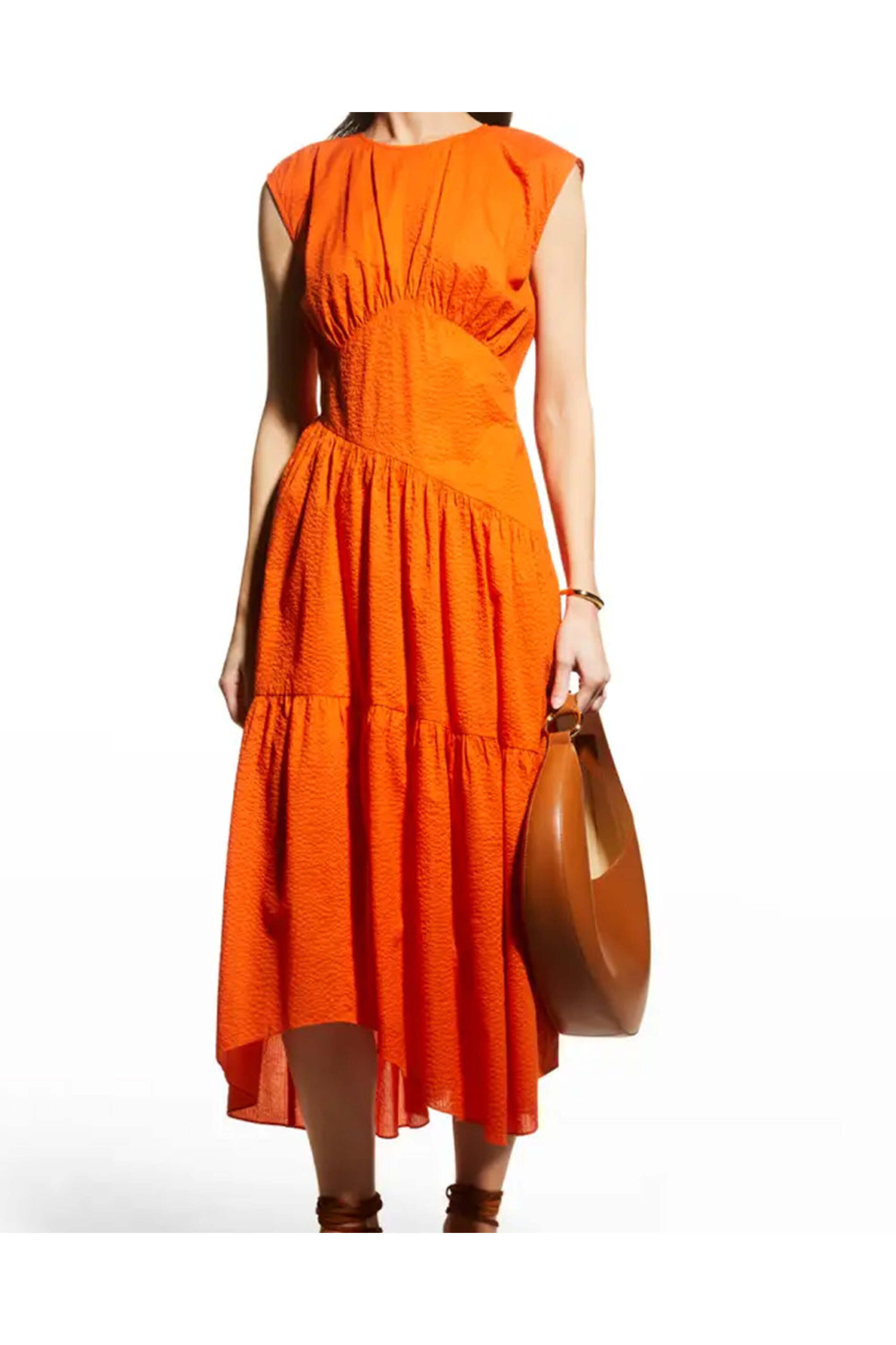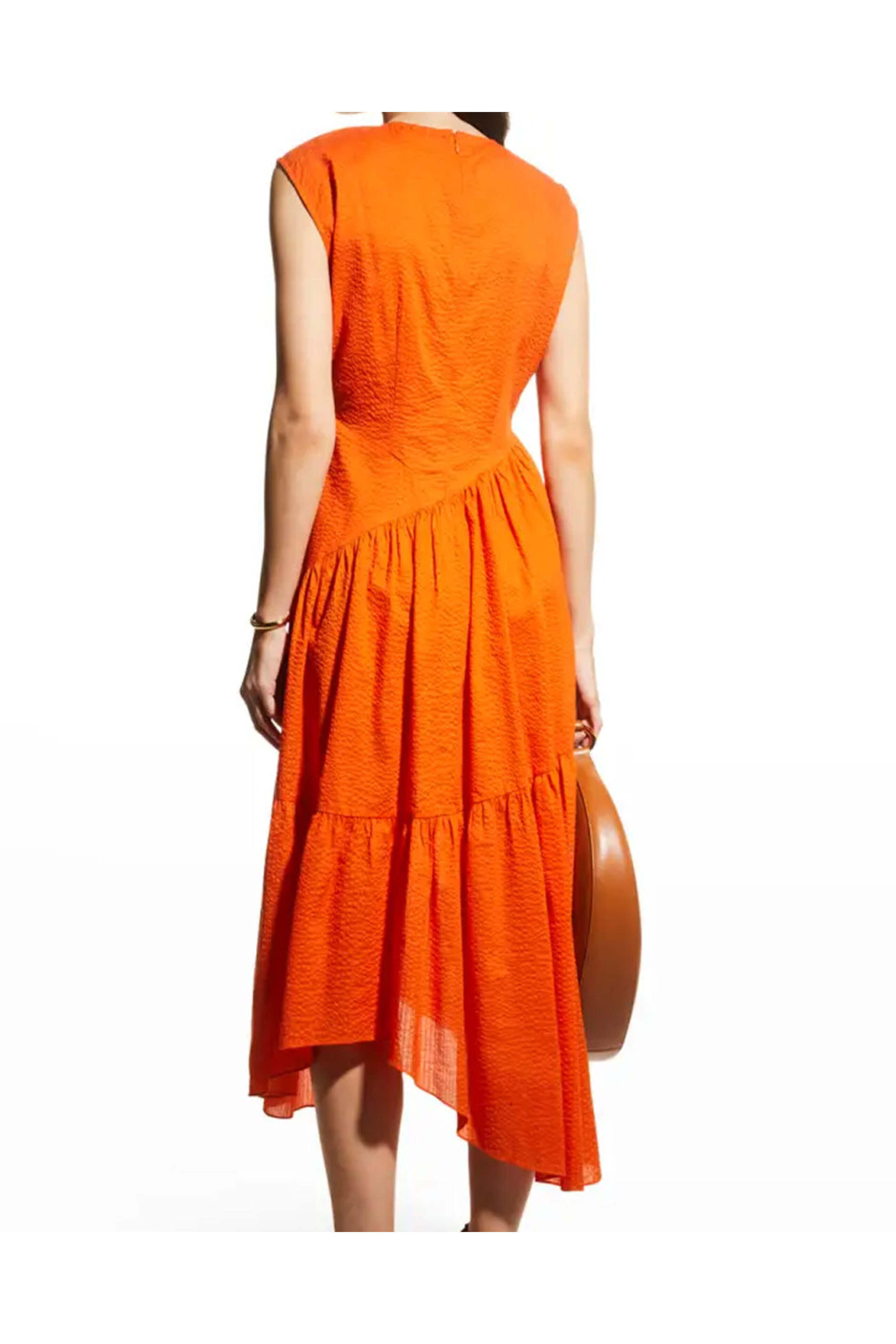 Frame Orange Crush Gathered Seam Dress. Jewel neckline. Sleeveless. Back zipper. Asymmetric hemline. Midi dress. A line silhouette. Relaxed fit. Lined. 100% cotton.