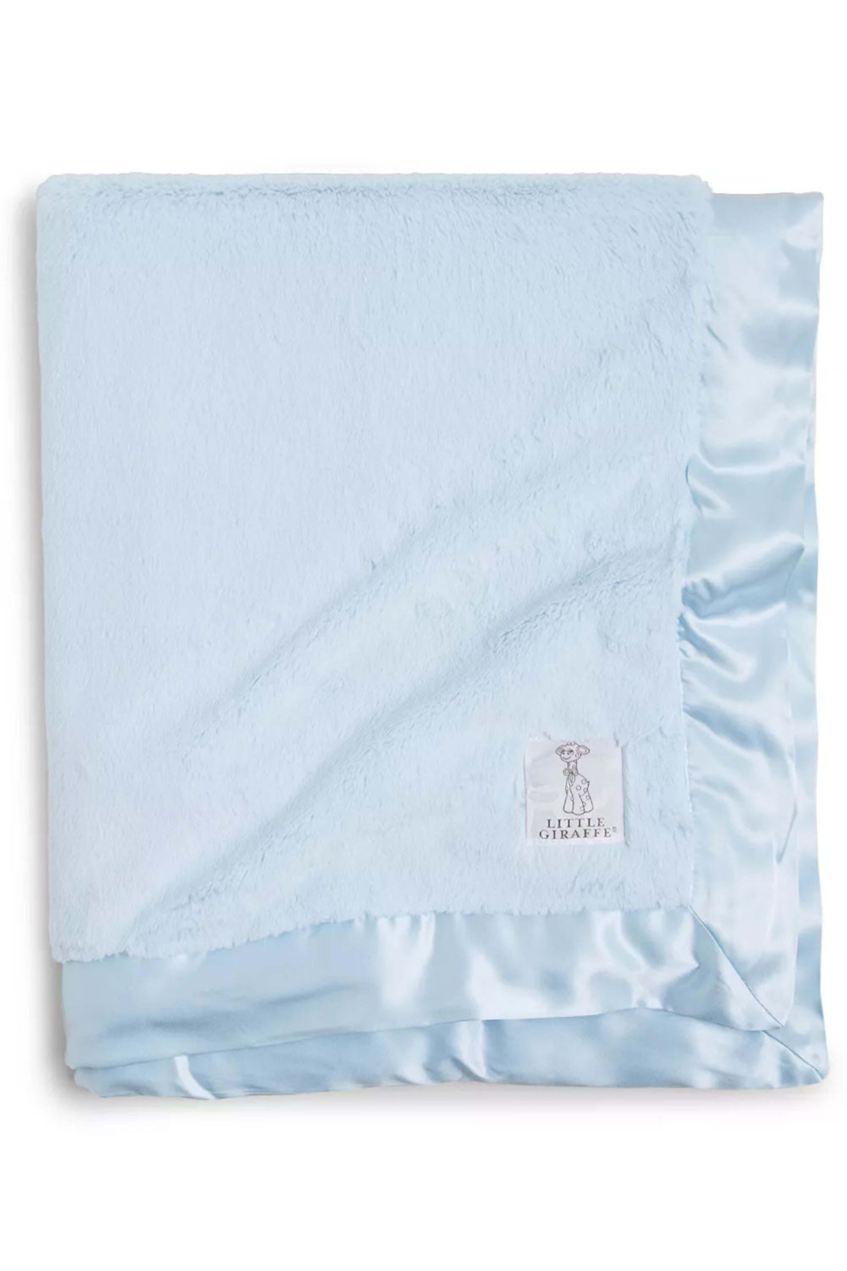 Little Giraffe Luxe Blue Solid Blanket. Arrives bundled with a ribbon tie, making it a beautiful gift right out of the box. Satin trim. 36cm x 30cm. Luxuriously soft faux fur body. Logo patch at the corner. Machine wash.