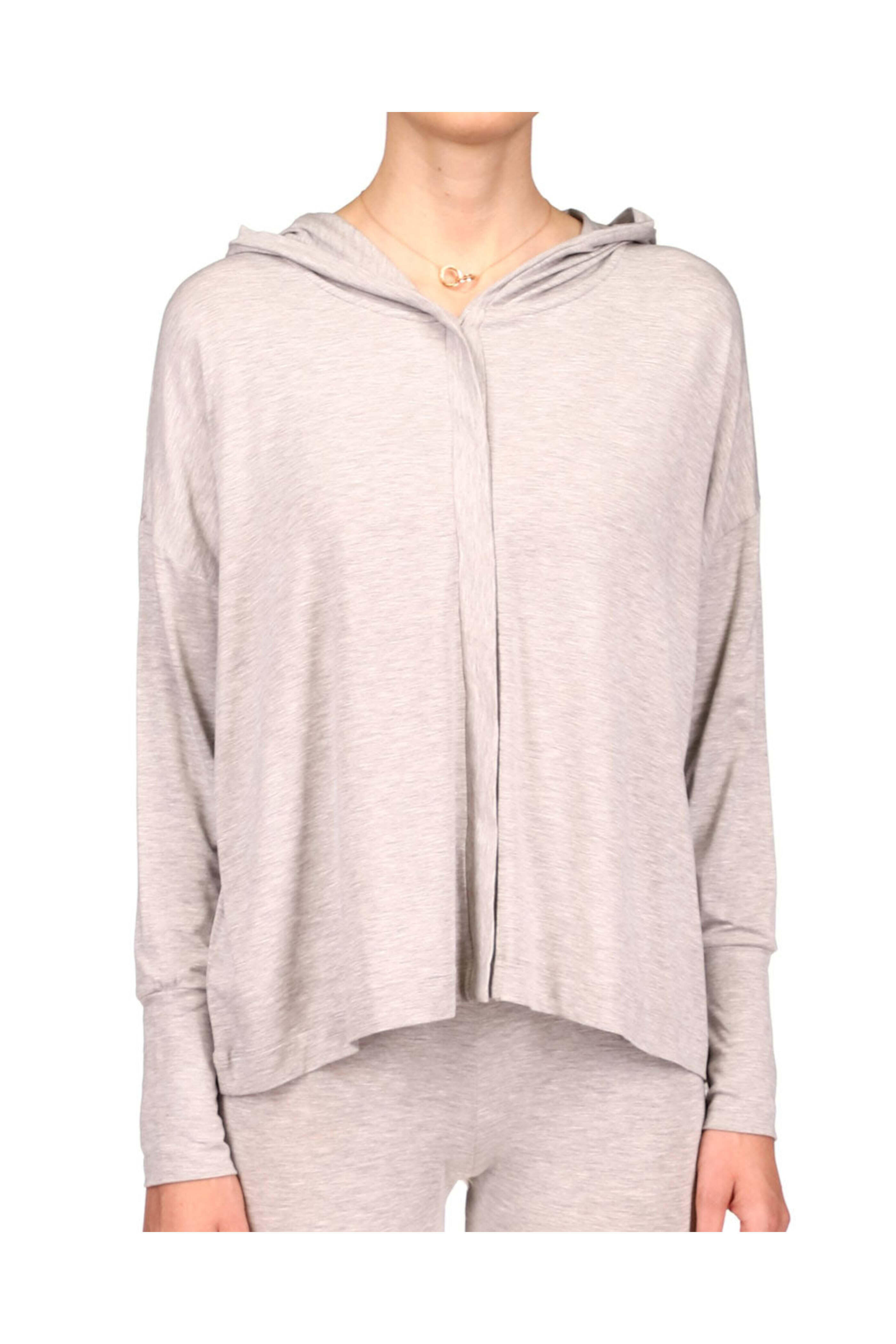 Majestic Filatures Grey Button Up Hoodie. Hood at neck. Front button closure. Long sleeves. Straight hem. 94% viscose, 6% elastane.
