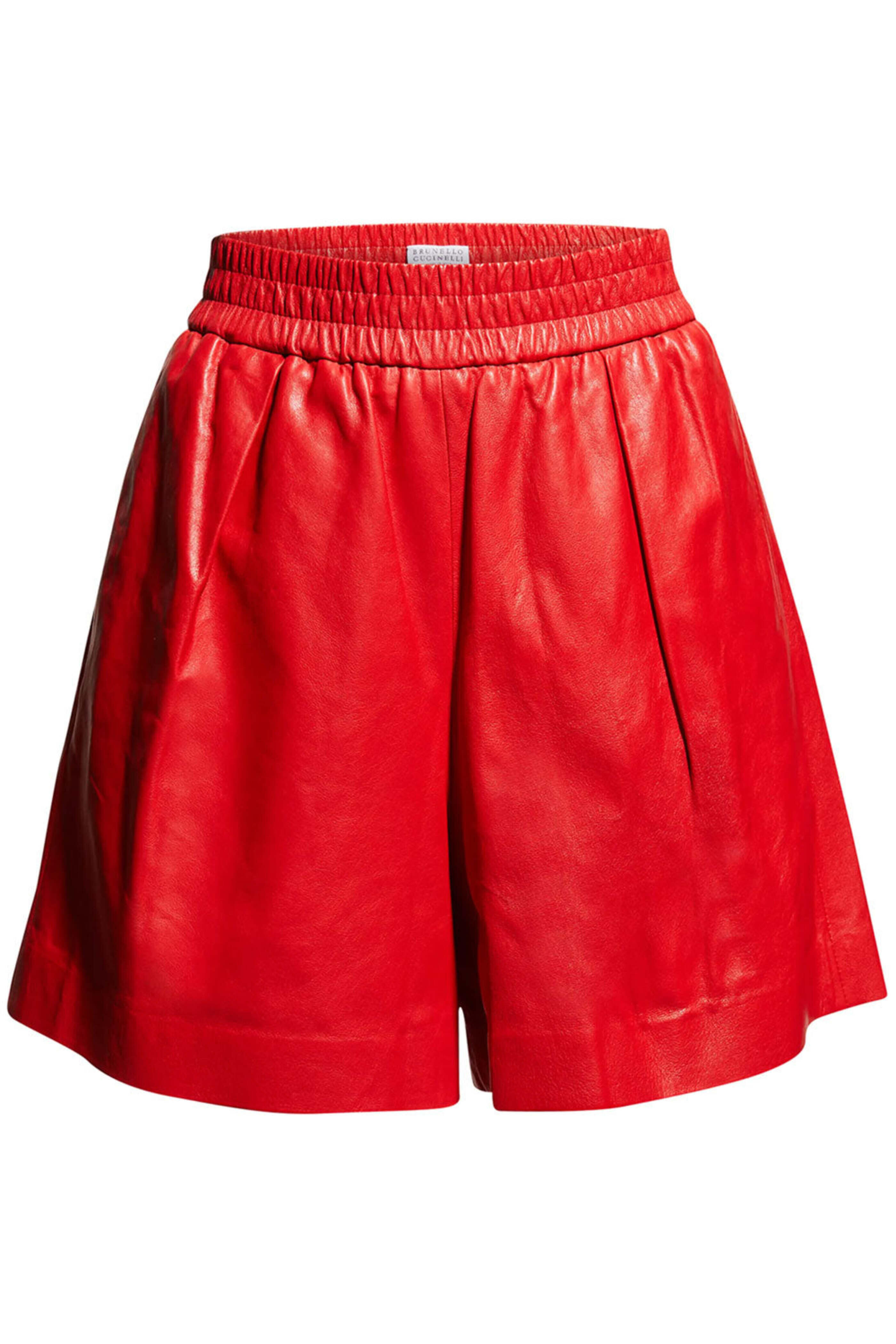 Brunello Cucinelli Chili Red Leather Short. High rise. Elastic waist. Side slip pockets. Back welt pockets. Wide through leg. Short length. Made in Italy. 100% leather.