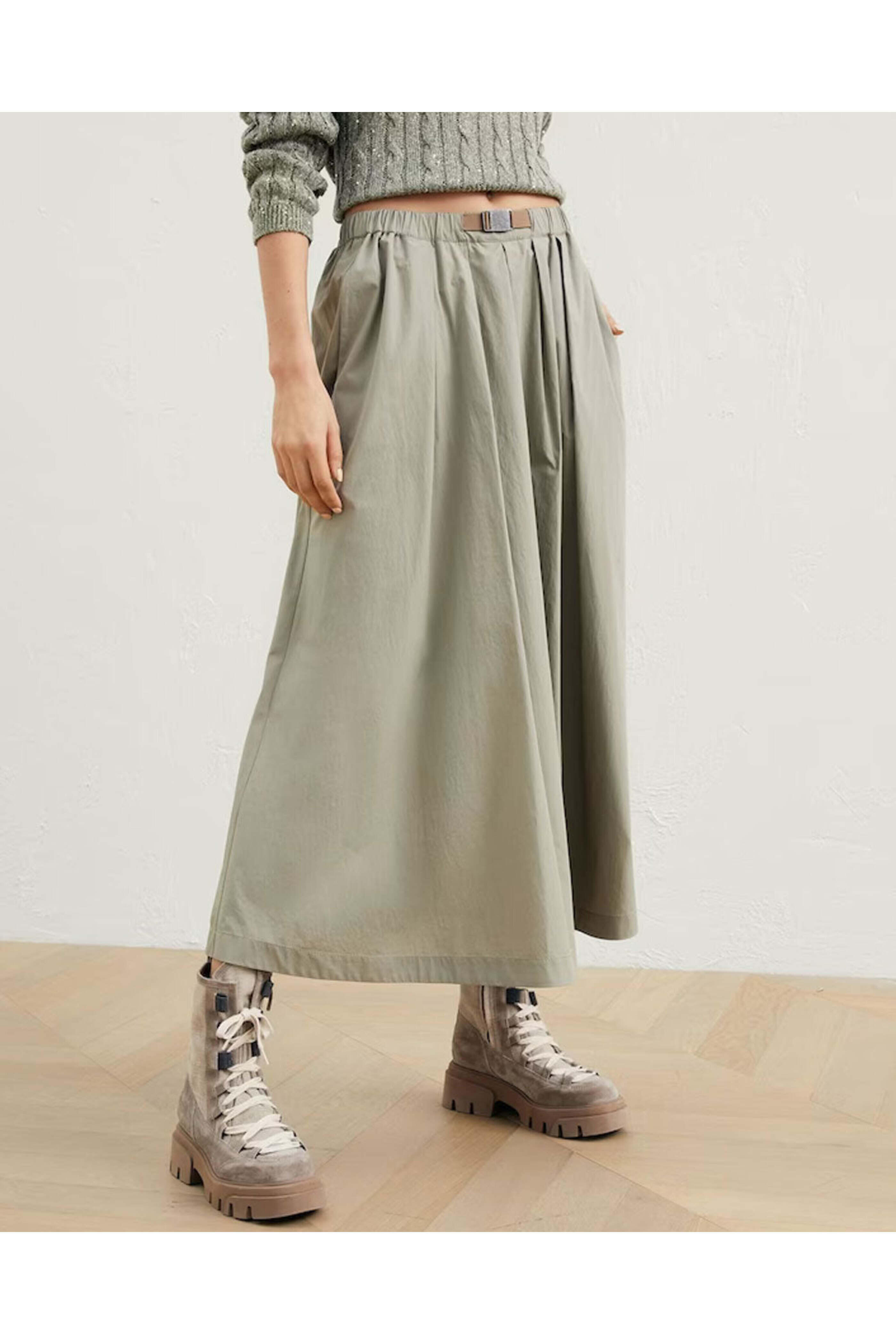 Brunello Cucinelli Khaki Cotton Midi Skirt. Mid rise. Elastic waist; monili buckle detail. Side slip pockets. Aline silhouette. Midi length. Made in Italy. 100% cotton.