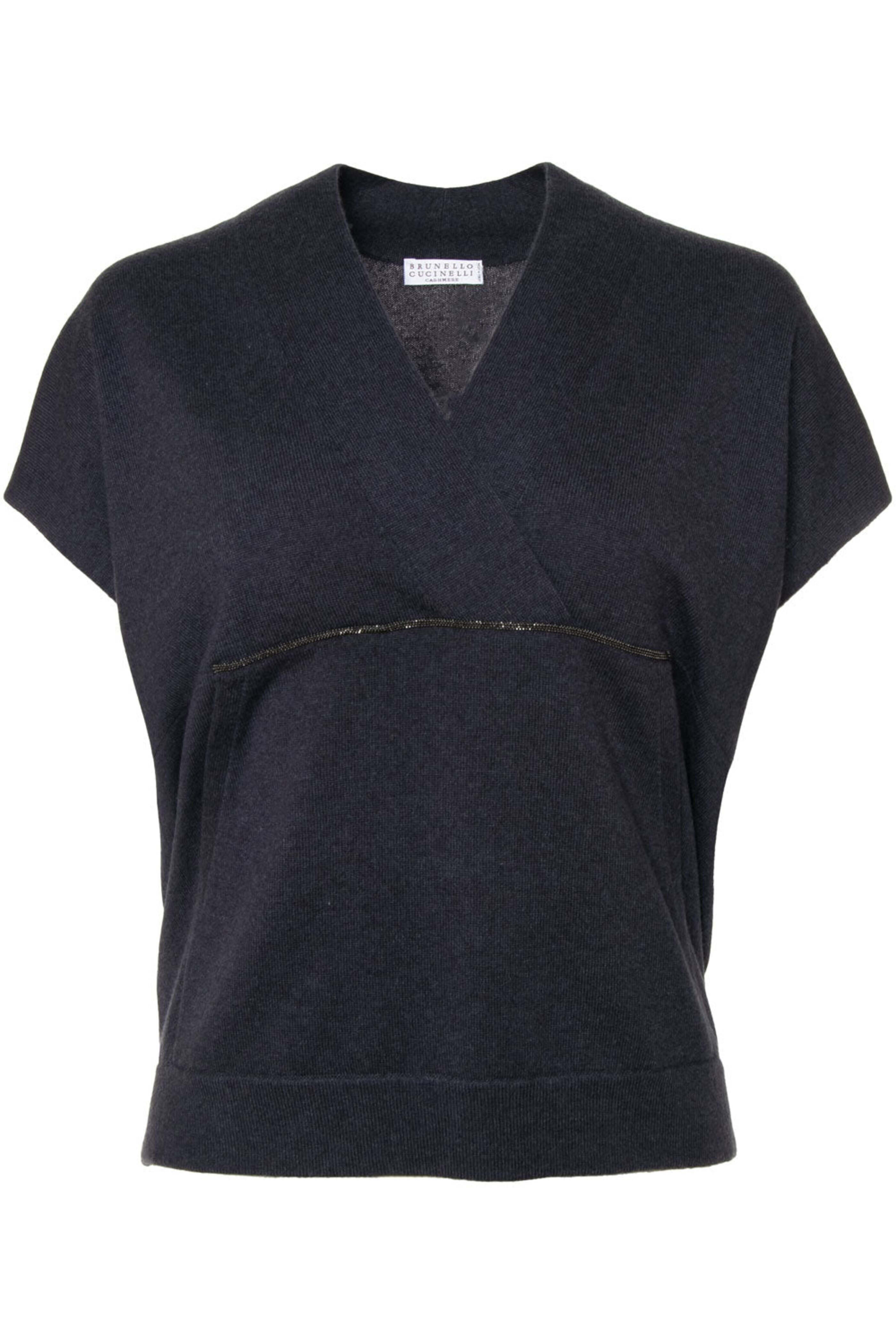 Brunello Cucinelli Midnight Cashmere Cap Sleeve Sweater . V-neck. Cap sleeves. Monili detail at neck. Pocket at front. Relaxed fit. Ribbed trims. Made in Italy. 100% cashmere.