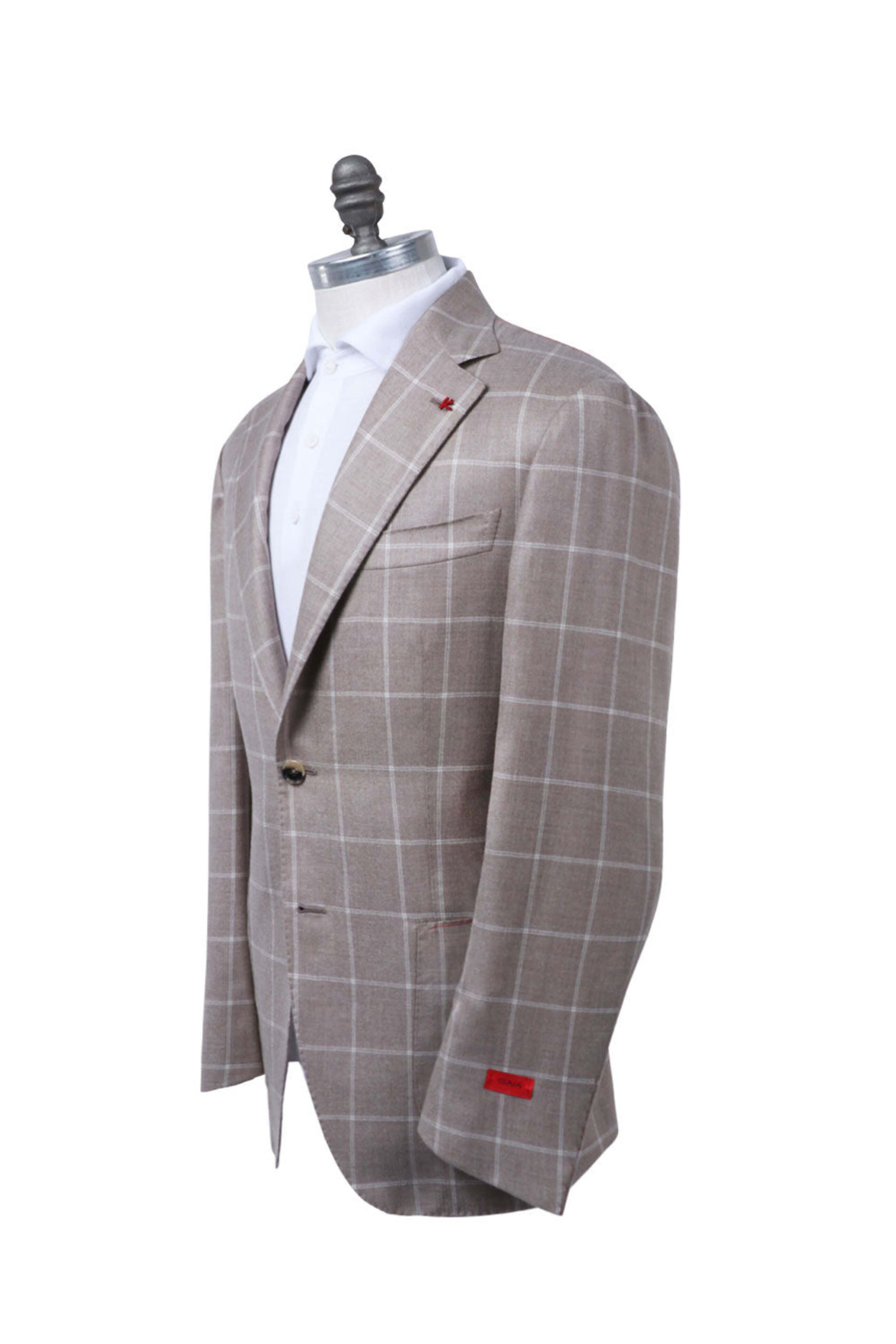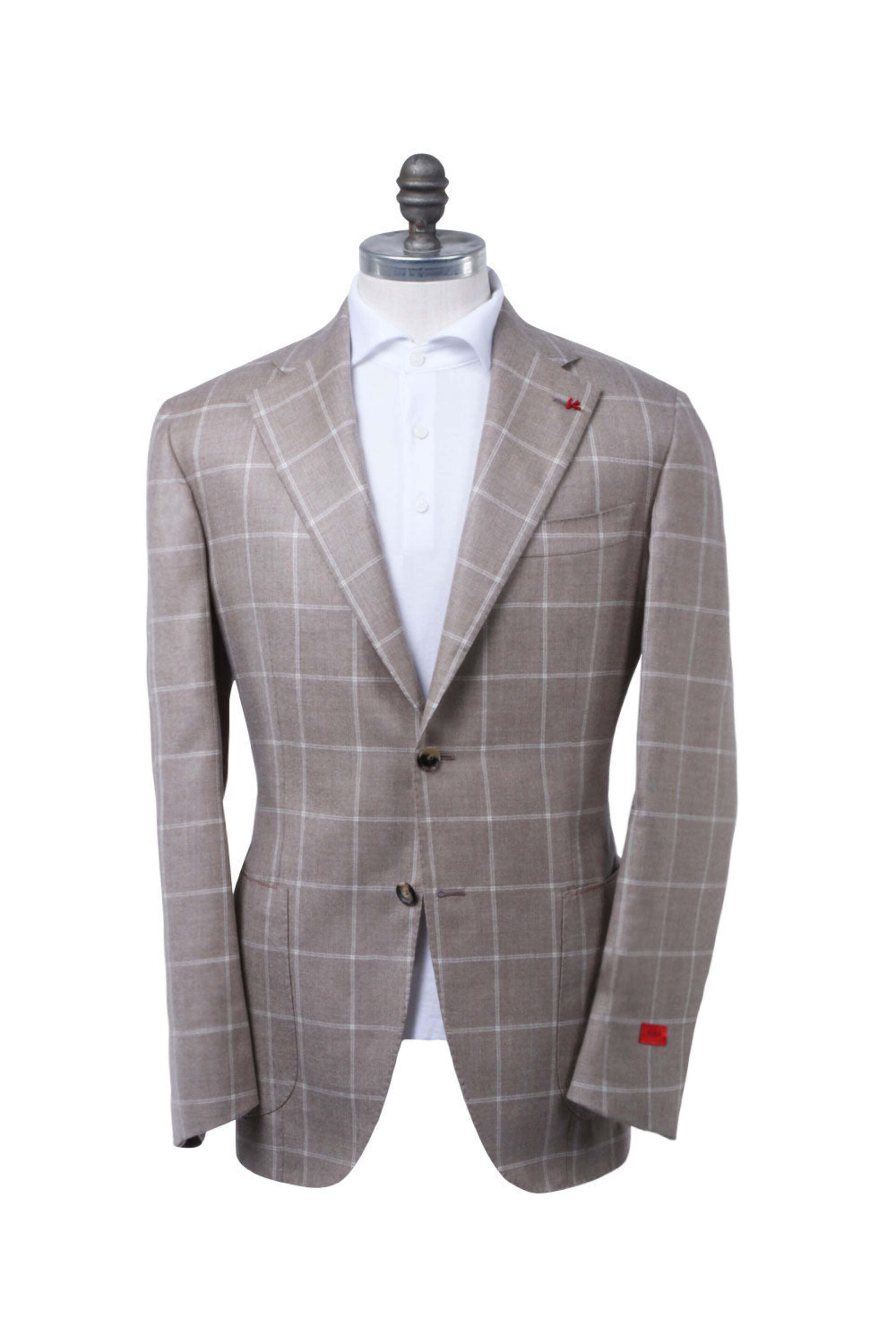 - · Isaia Beige Windowpane Sportcoat· Notch lapels· Two button jacket· Front left chest welt pocket· Waist patch pockets· Double back vents· Unfinished buttonholes· Pick stitch detailing· Quarter lined· 93% cashmere, 7% silk· 100% cupro lining· Made In Italy