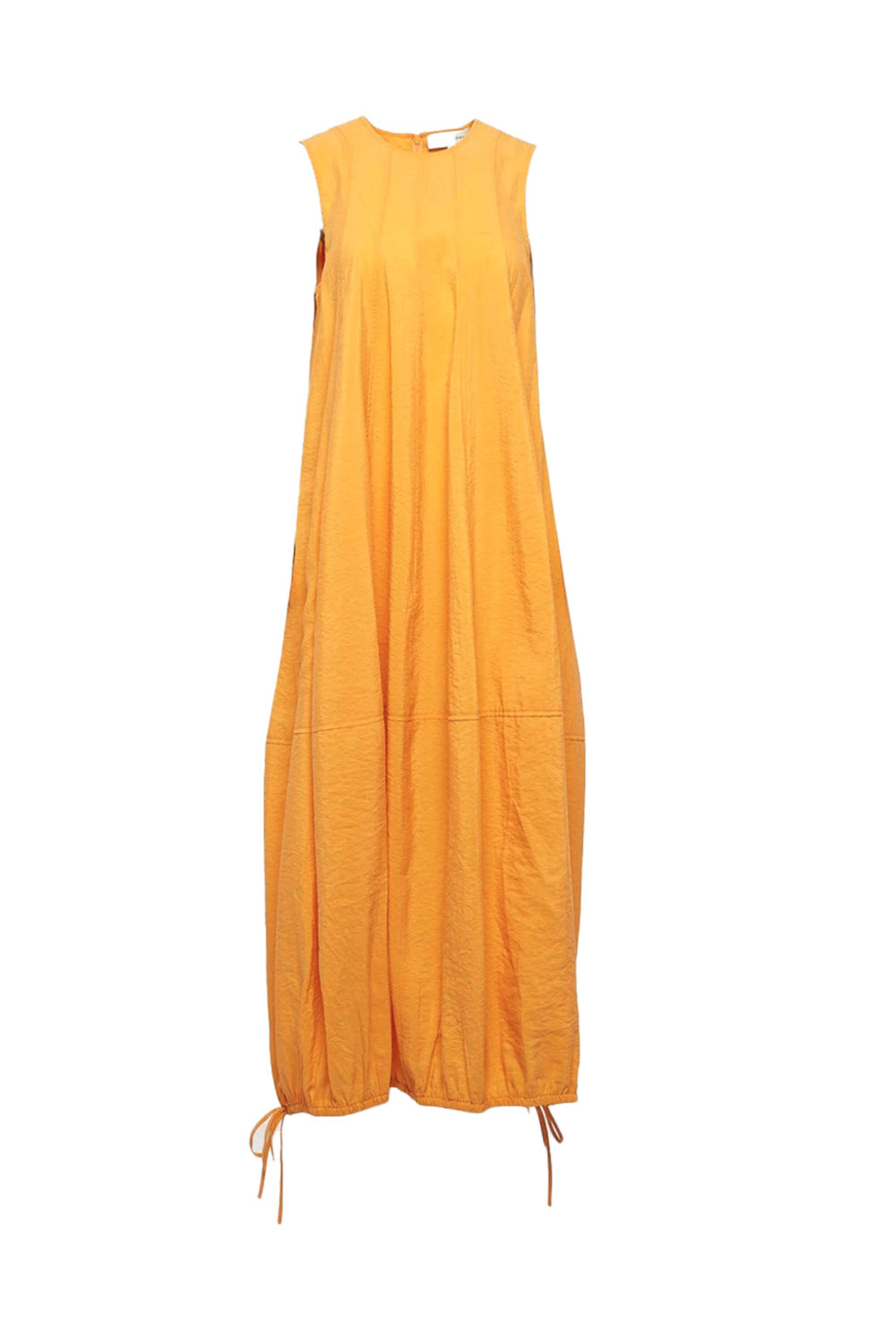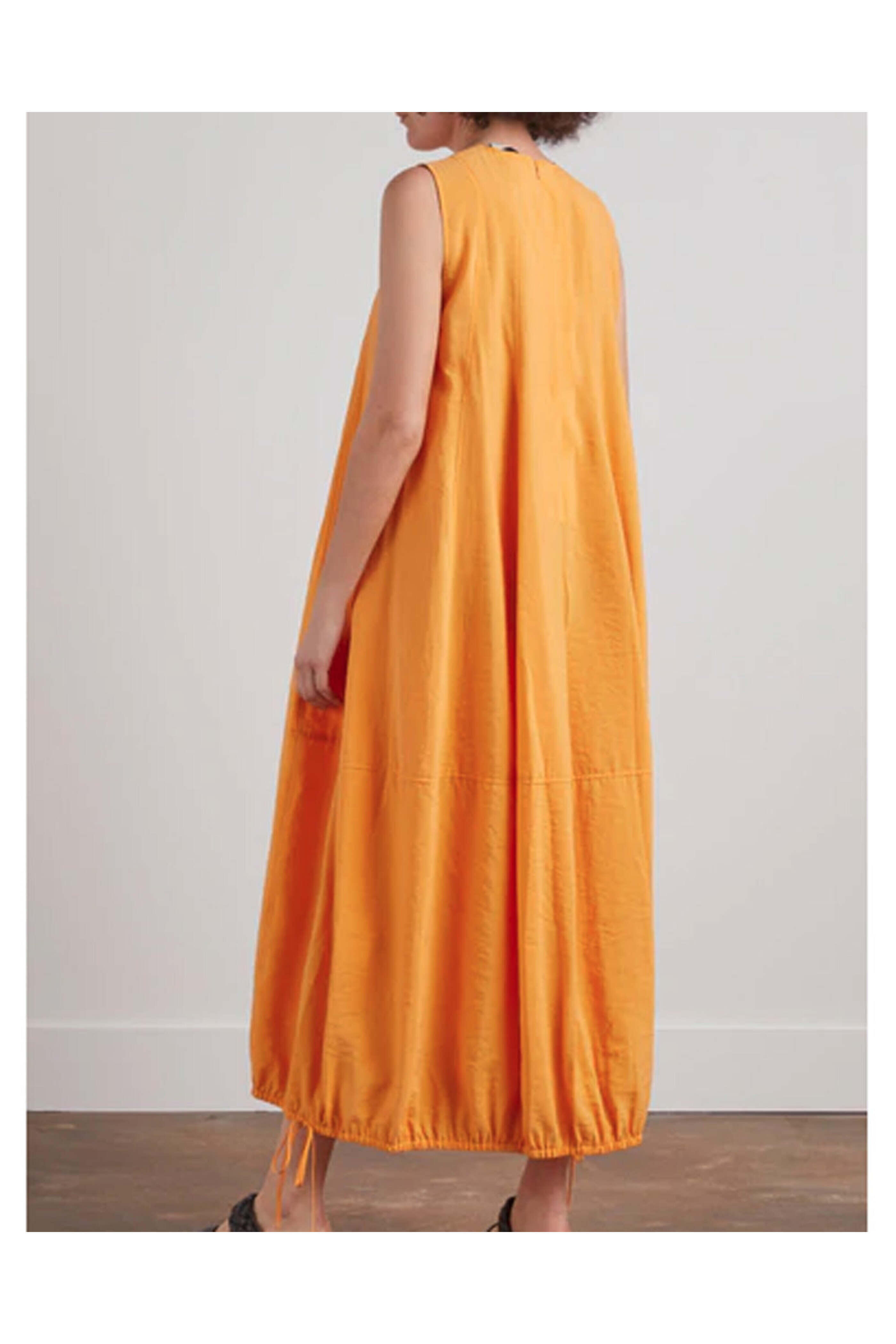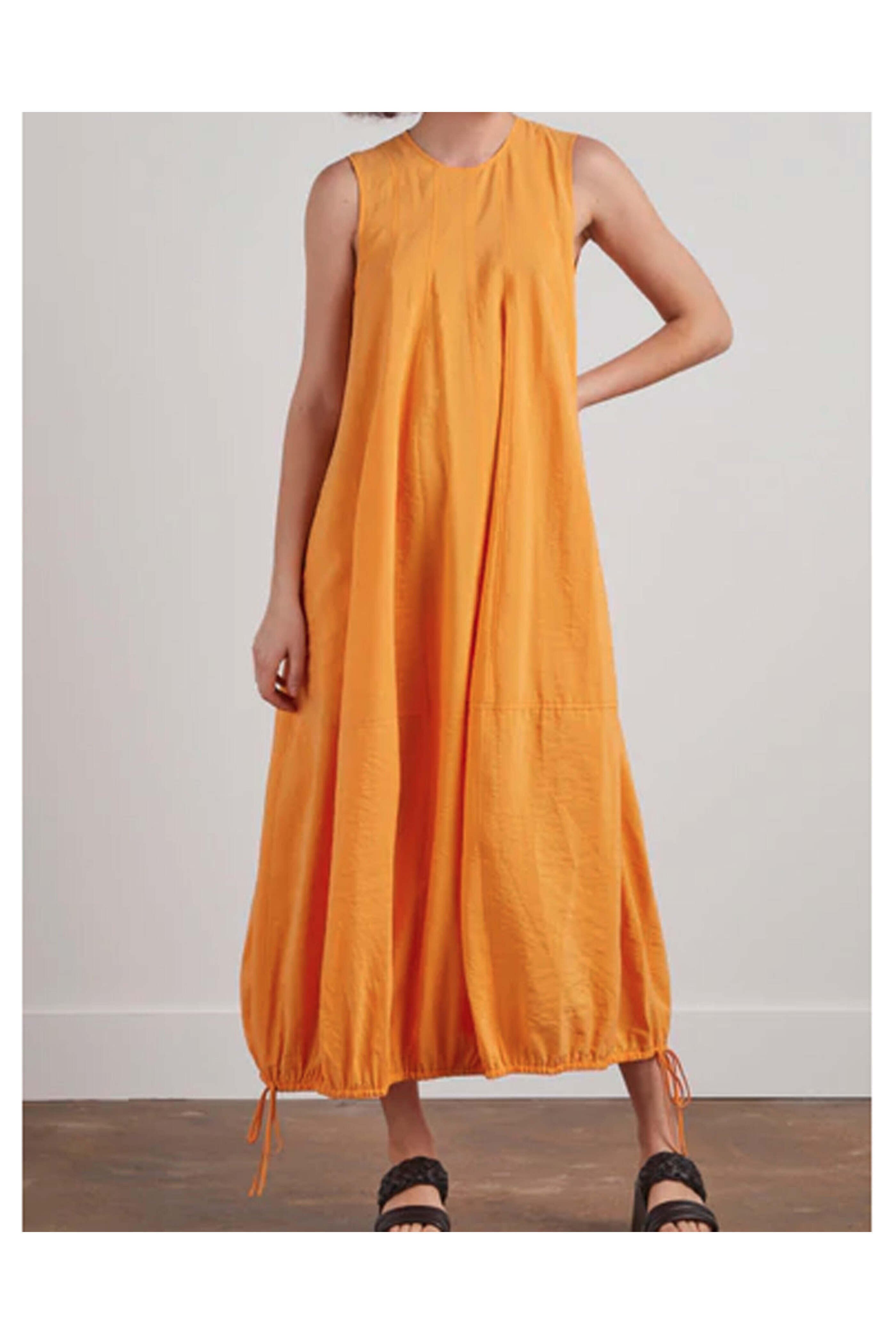 Lee Mathews Tangerine Edie Dress. Crew neckline. Sleeveless. Draped detailing. Maxi length. Bubble hemline with drawstring. Soft balloon silhouette. Relaxed fit. 66% spun silk 34% nylon.