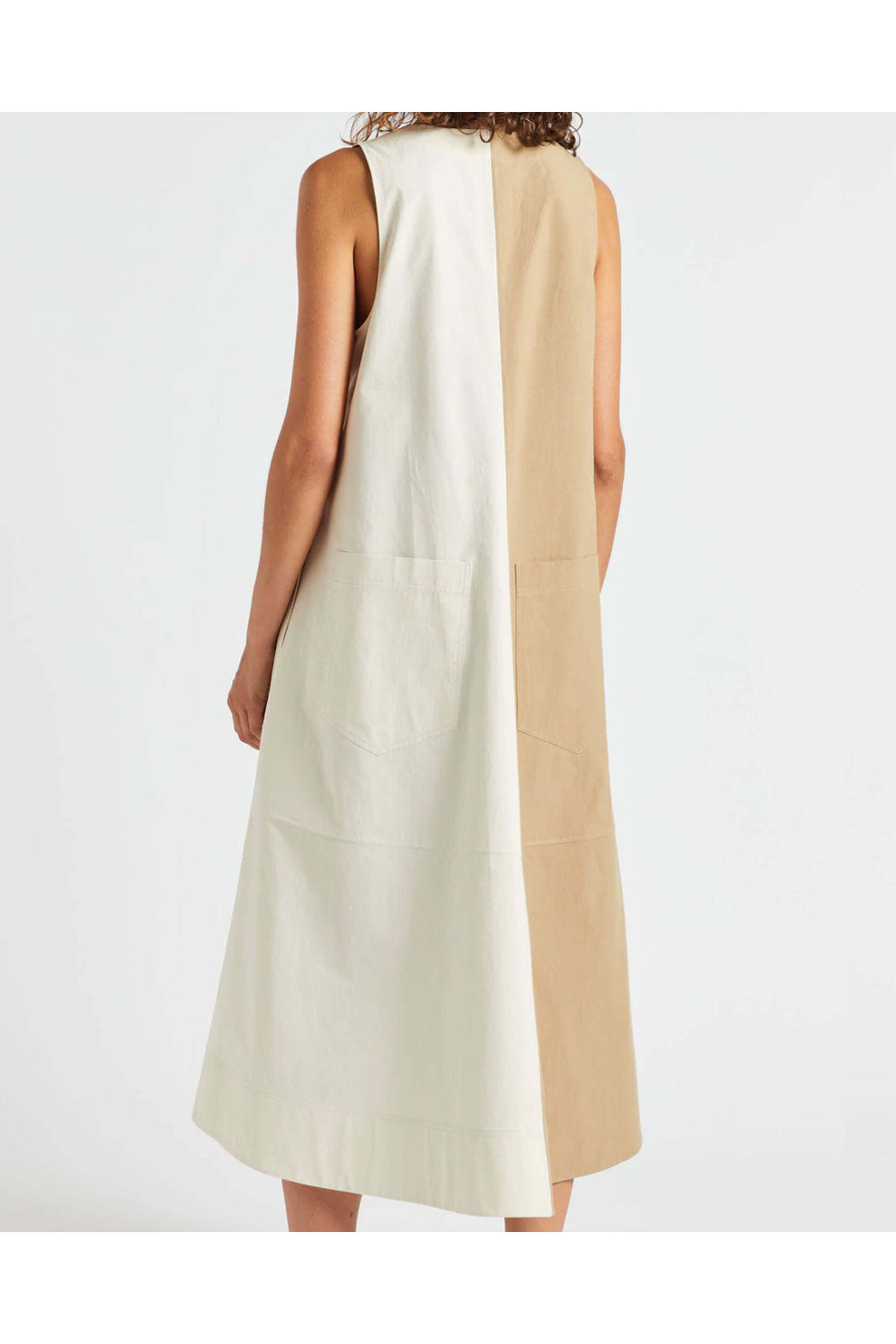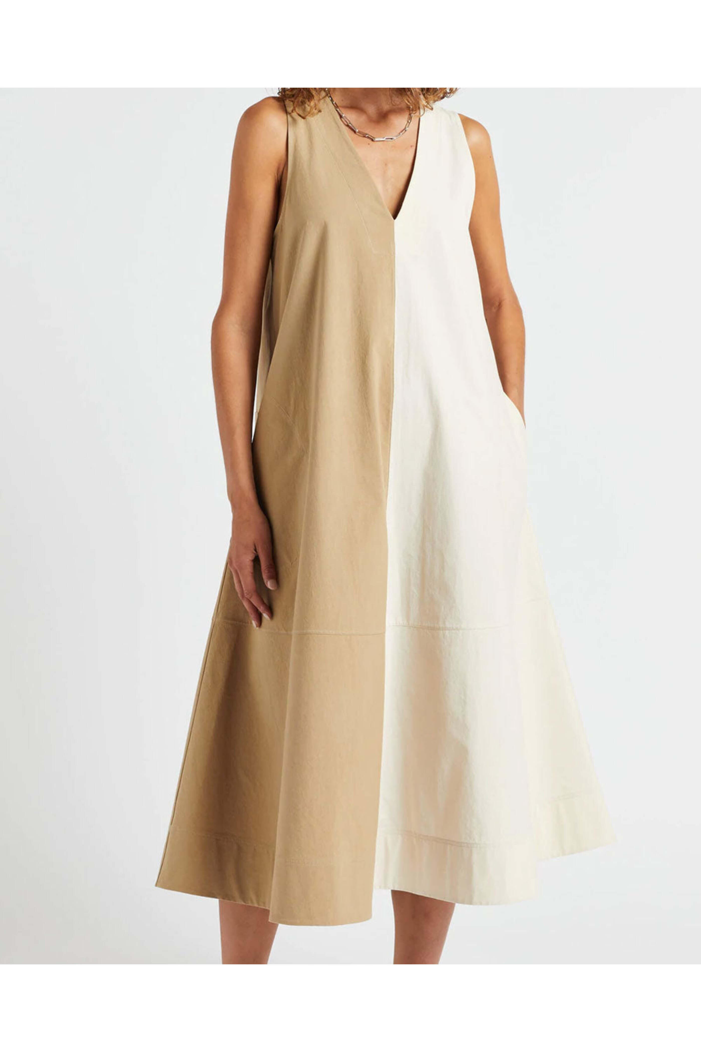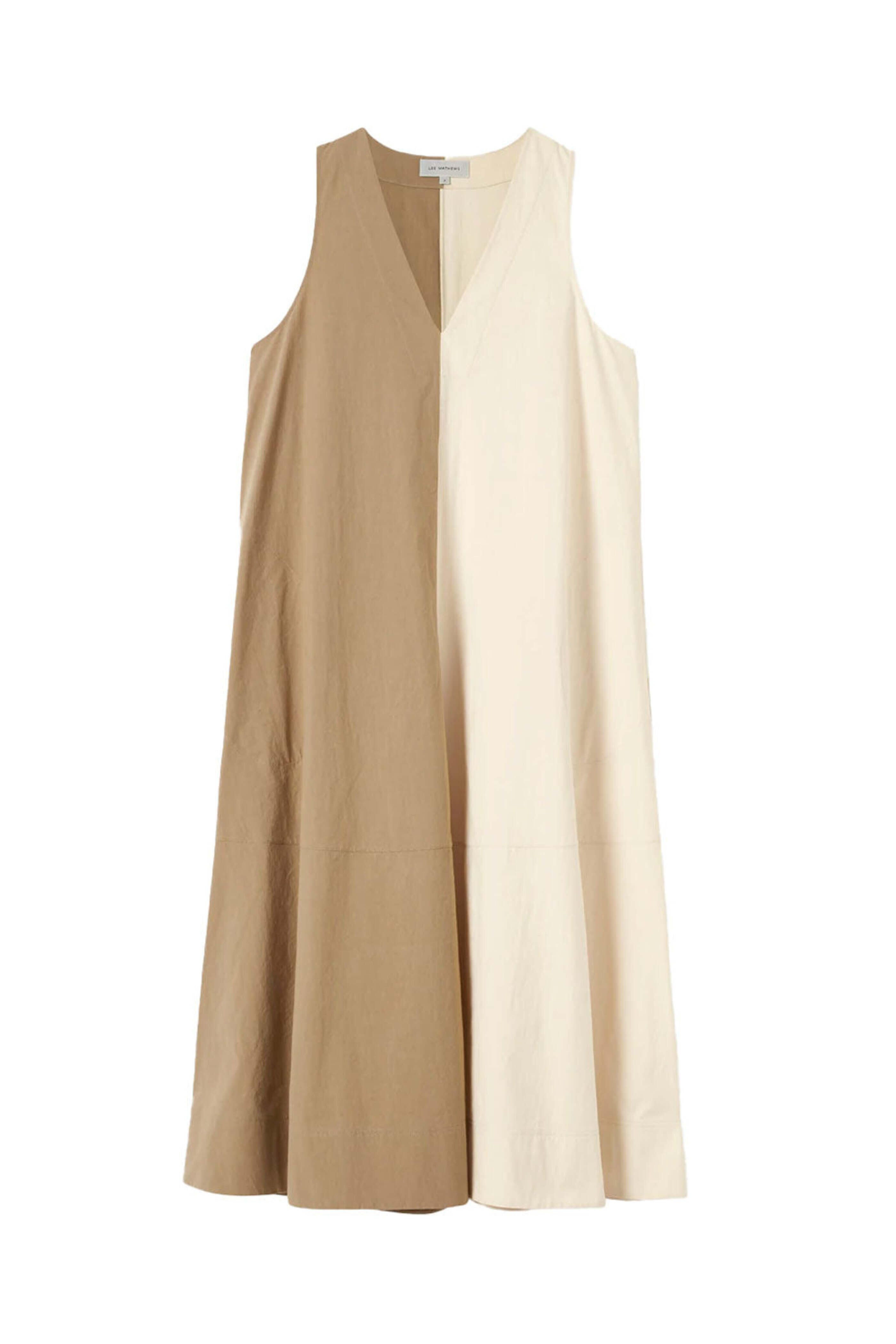 Lee Mathews Khaki Preston Apron Dress. V-neck. Sleeveless. Side pockets. Rear pockets. Midi length. A-line silhouette. Relaxed fit. 100% cotton.