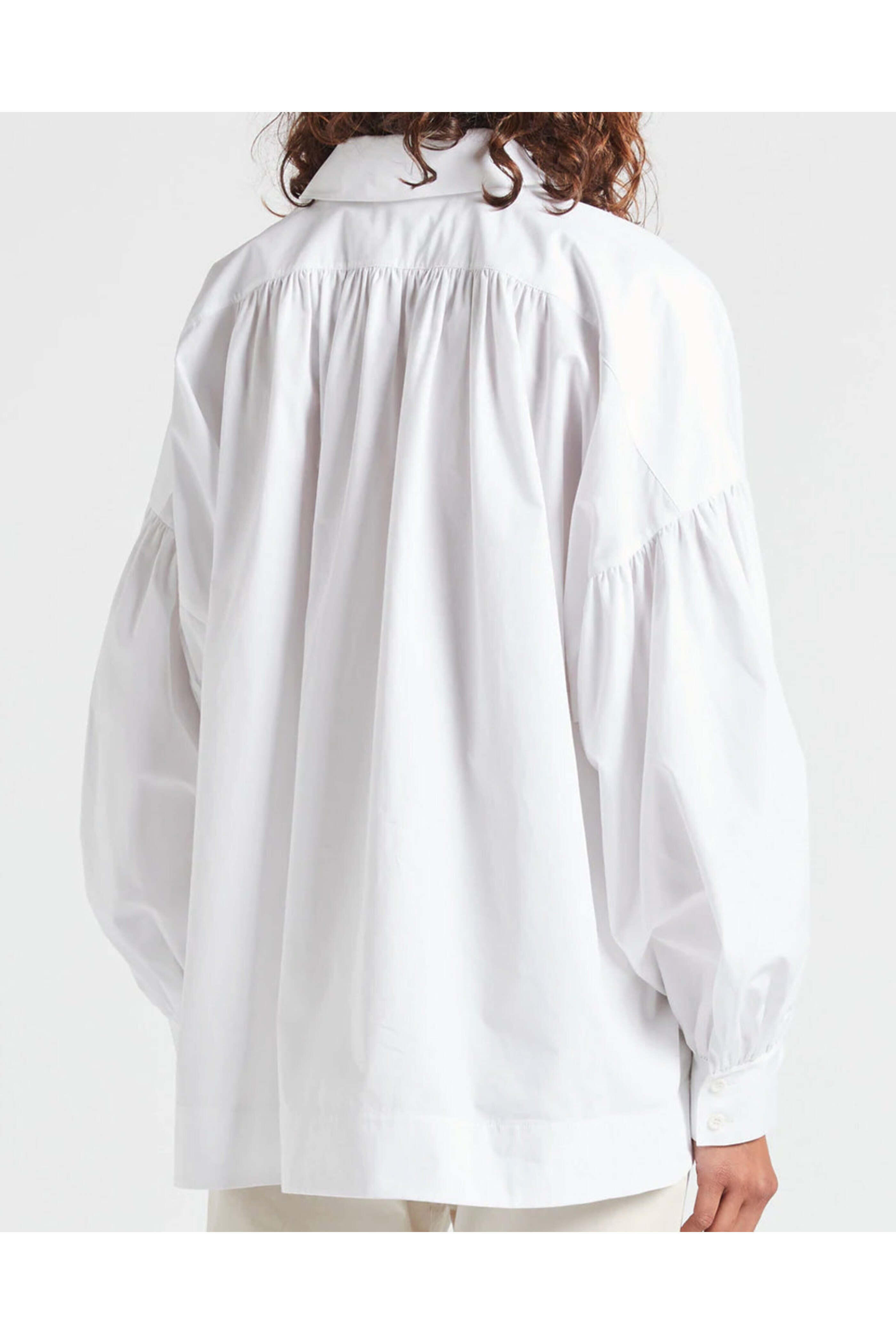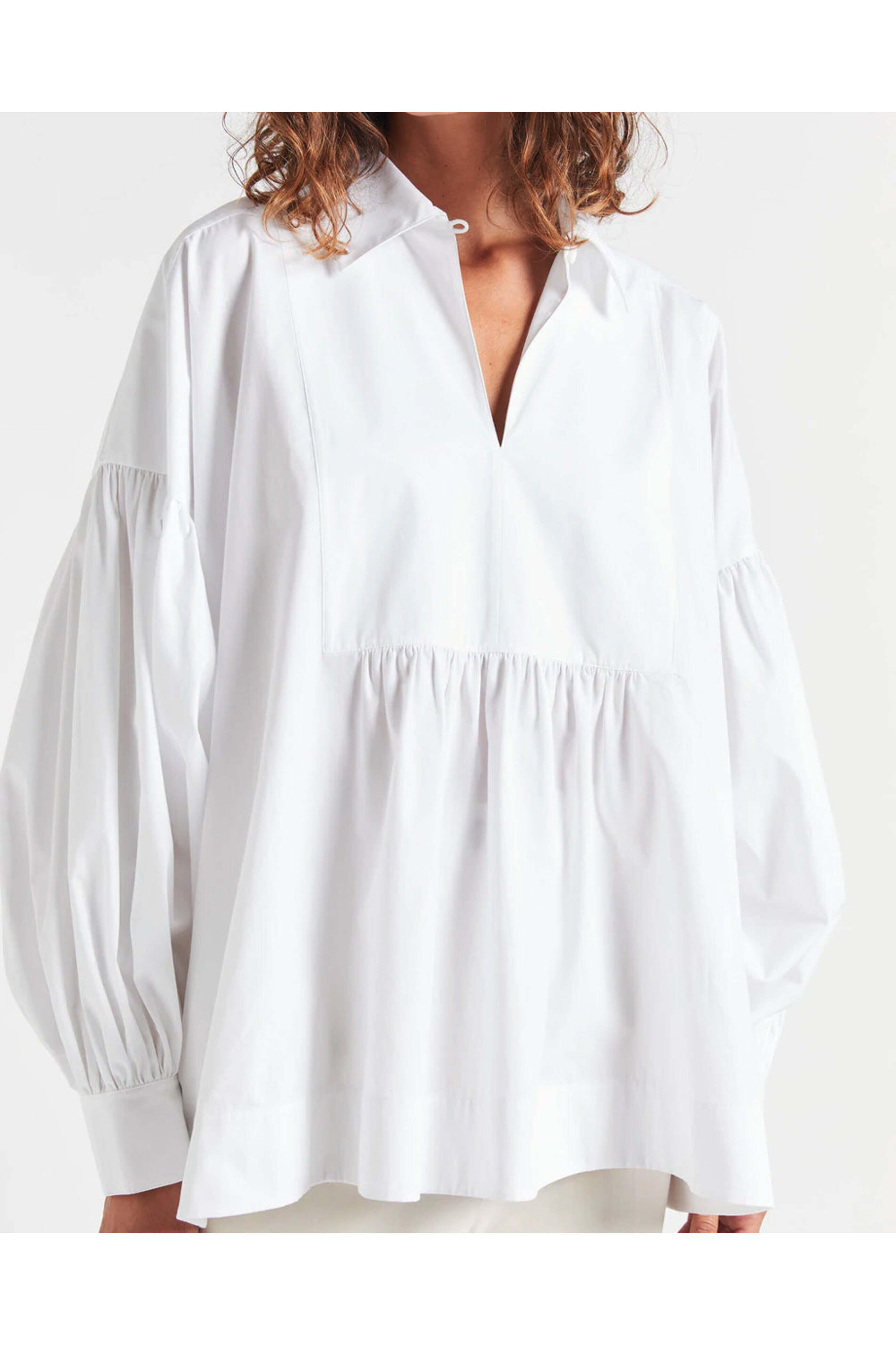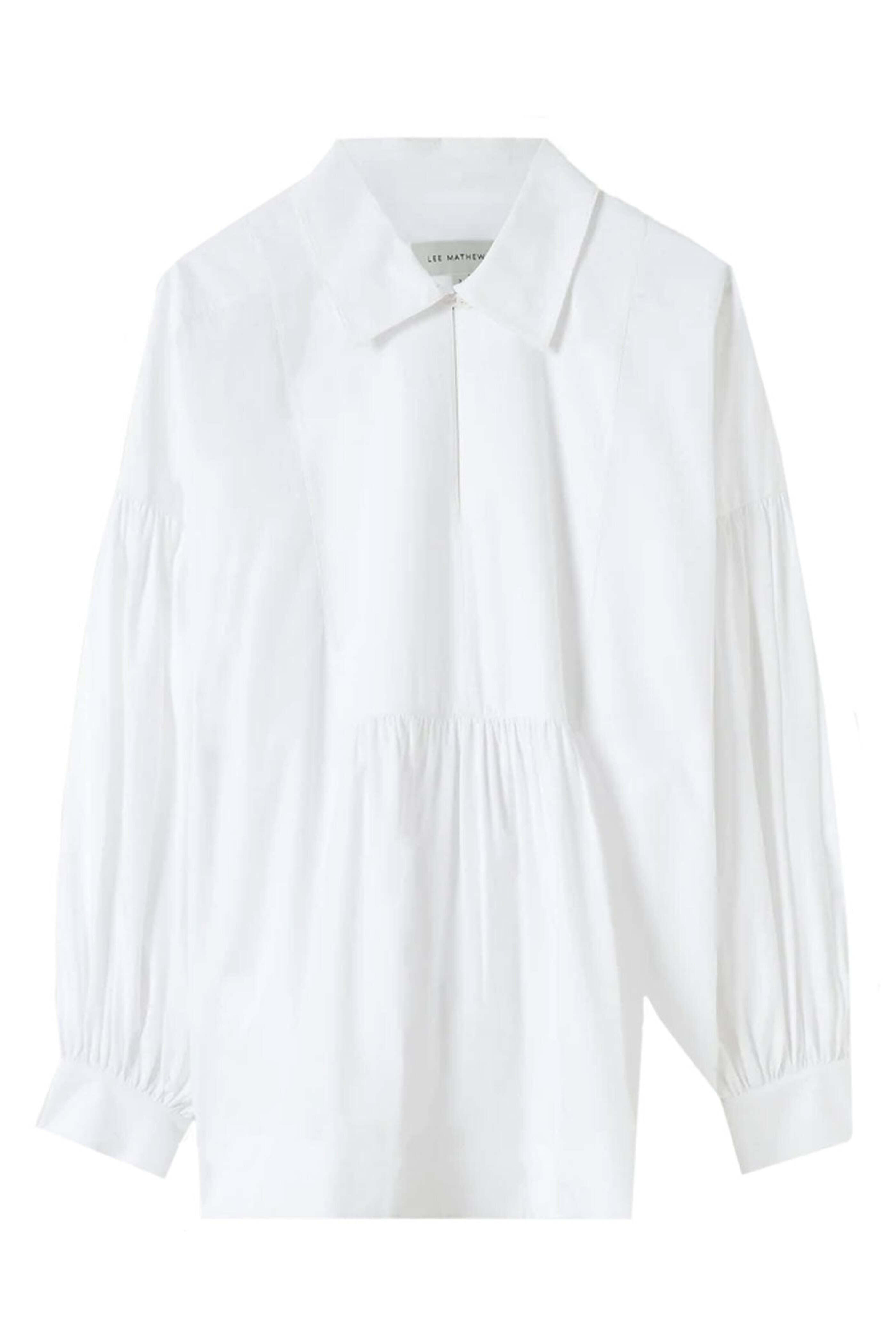 Lee Mathews Natural Frankie Bib Top. V-neck; polo collar. Long balloon sleeves; button cuffs. Dropped shoulders. Bib front. Gathered back. Gathered details throughout. Relaxed fit. 100% cotton.