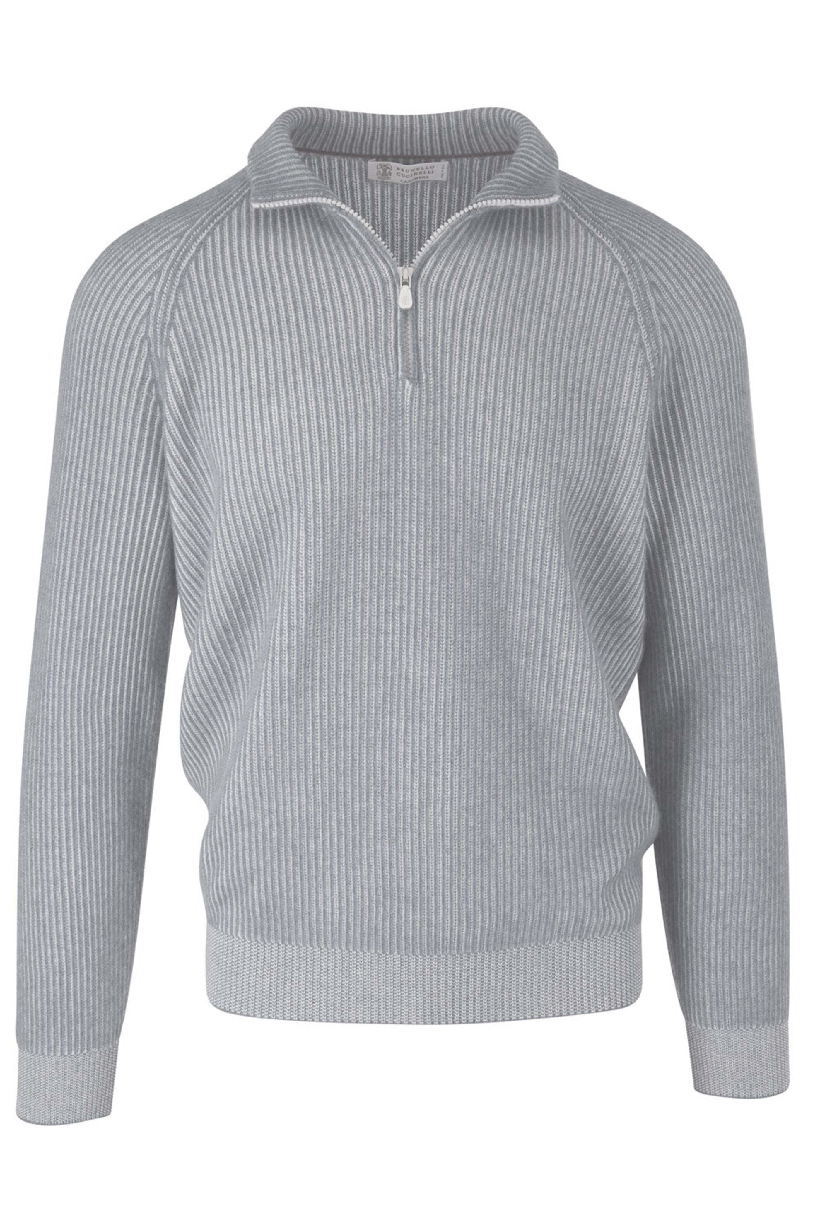 - Brunello Cucinelli Light Grey Ribbed Cashmere Quarter Zip Sweater