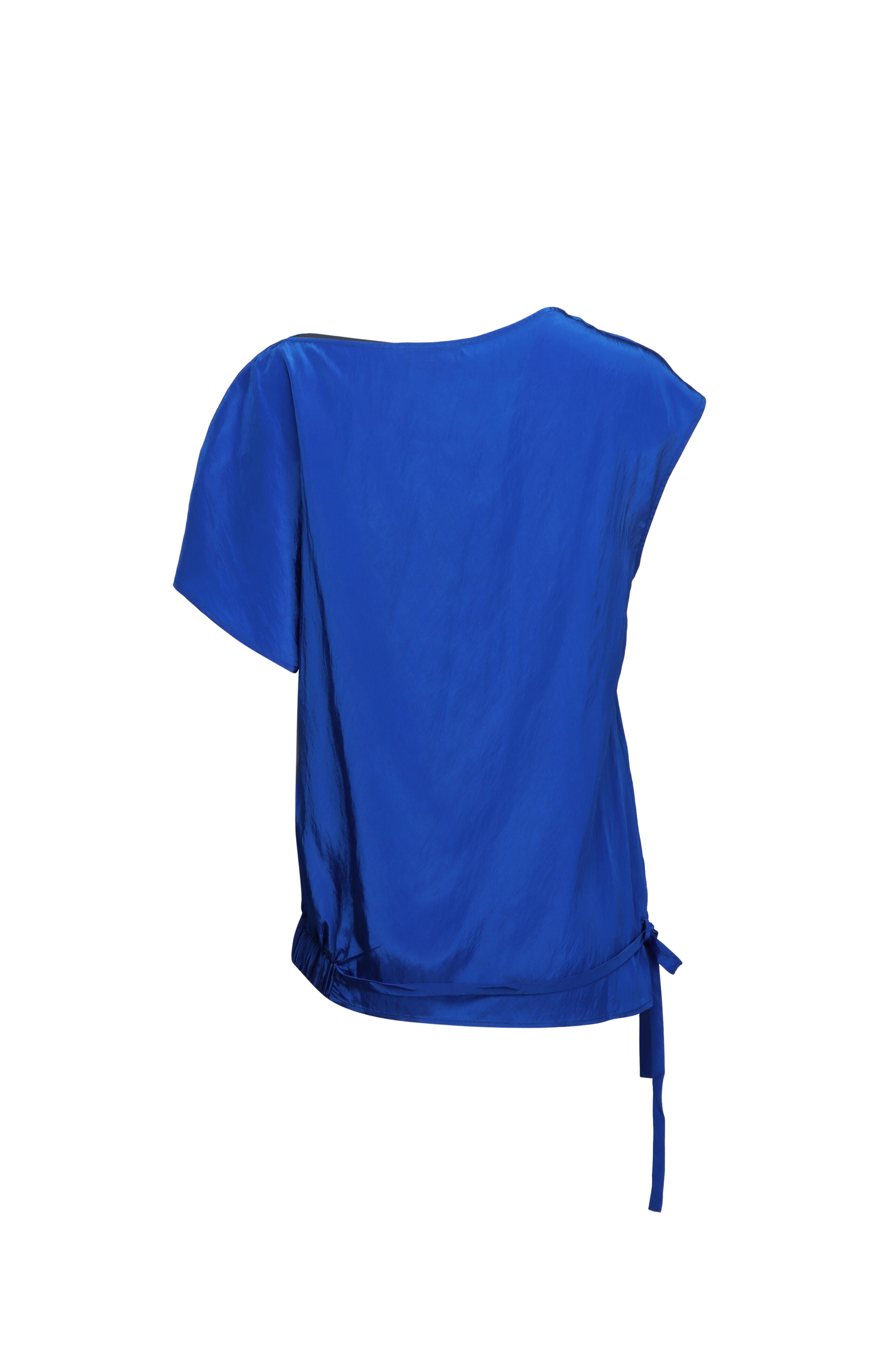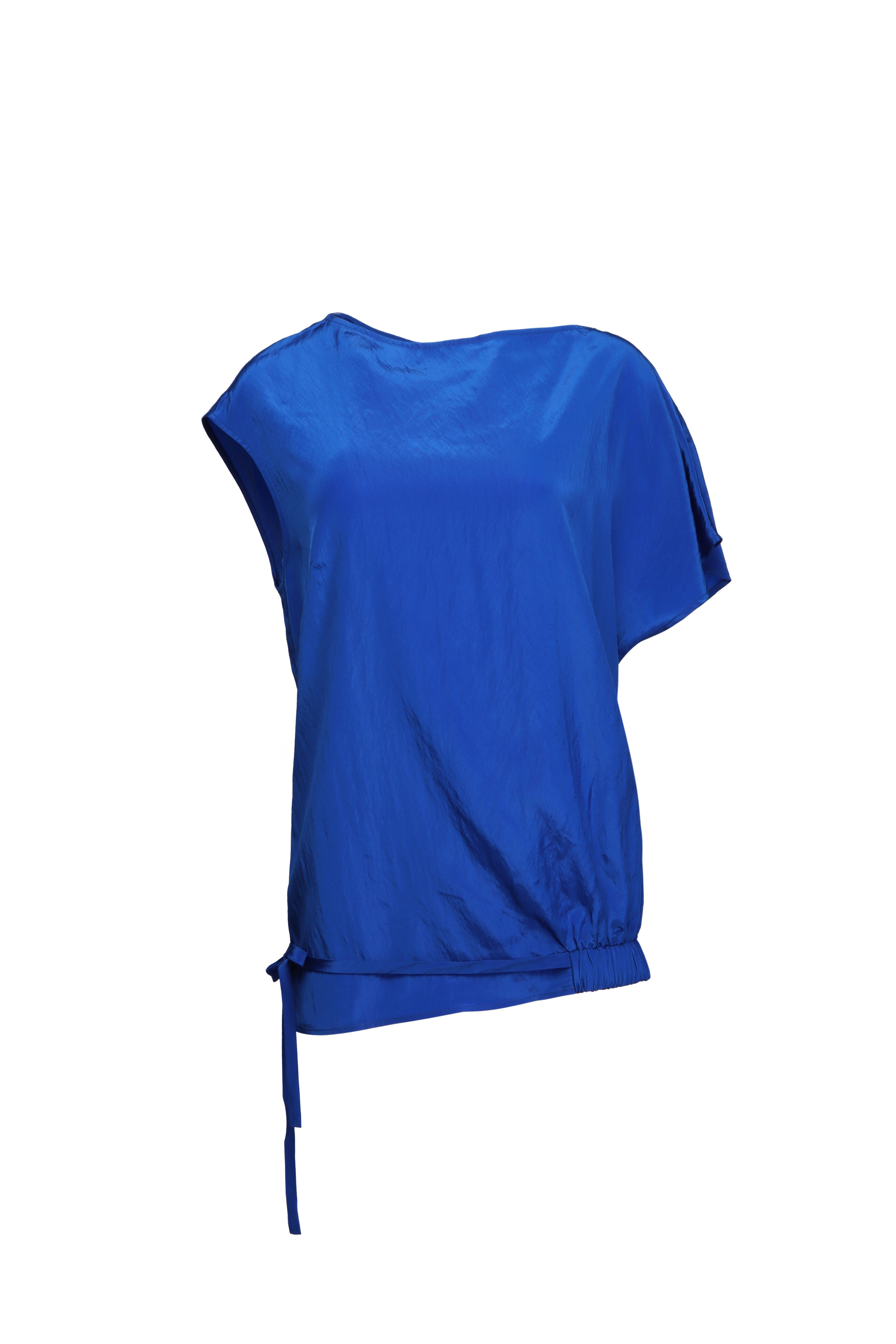 Drop shoulder. Single sleeve. Relaxed fit. Asymmetrical elastic hem. Imported. Bust 81cm (Size 1). Hip 86 cm (Size 1). 84% viscose, 16% nylon. Dry clean.