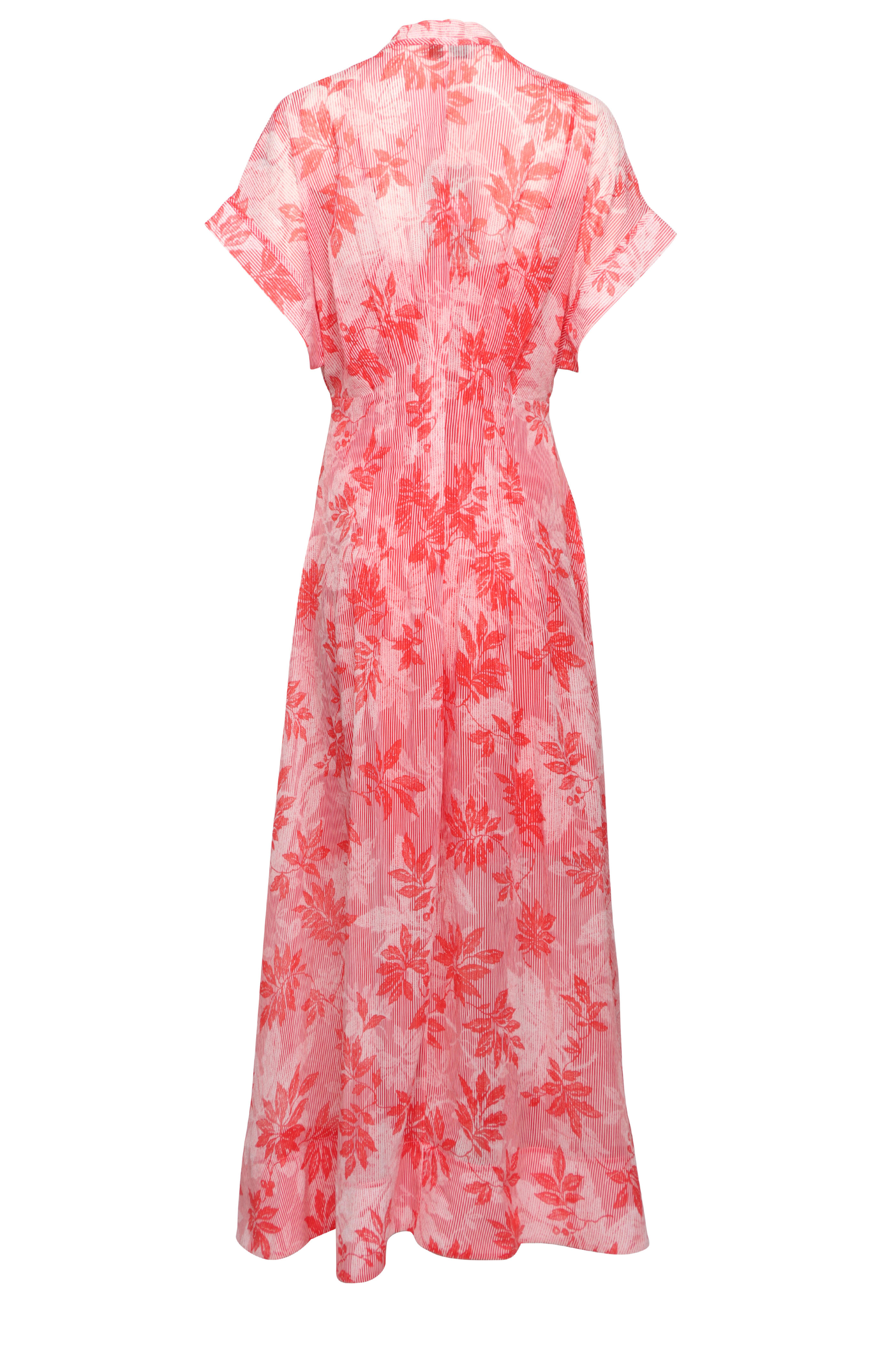 Banded collar; self-tie detail. Short dolman sleeves. Button front closure. Pintuck waist. Aline silhouette. Imported. Maxi length. 100% cotton outer; lined/ slip. Dry clean.