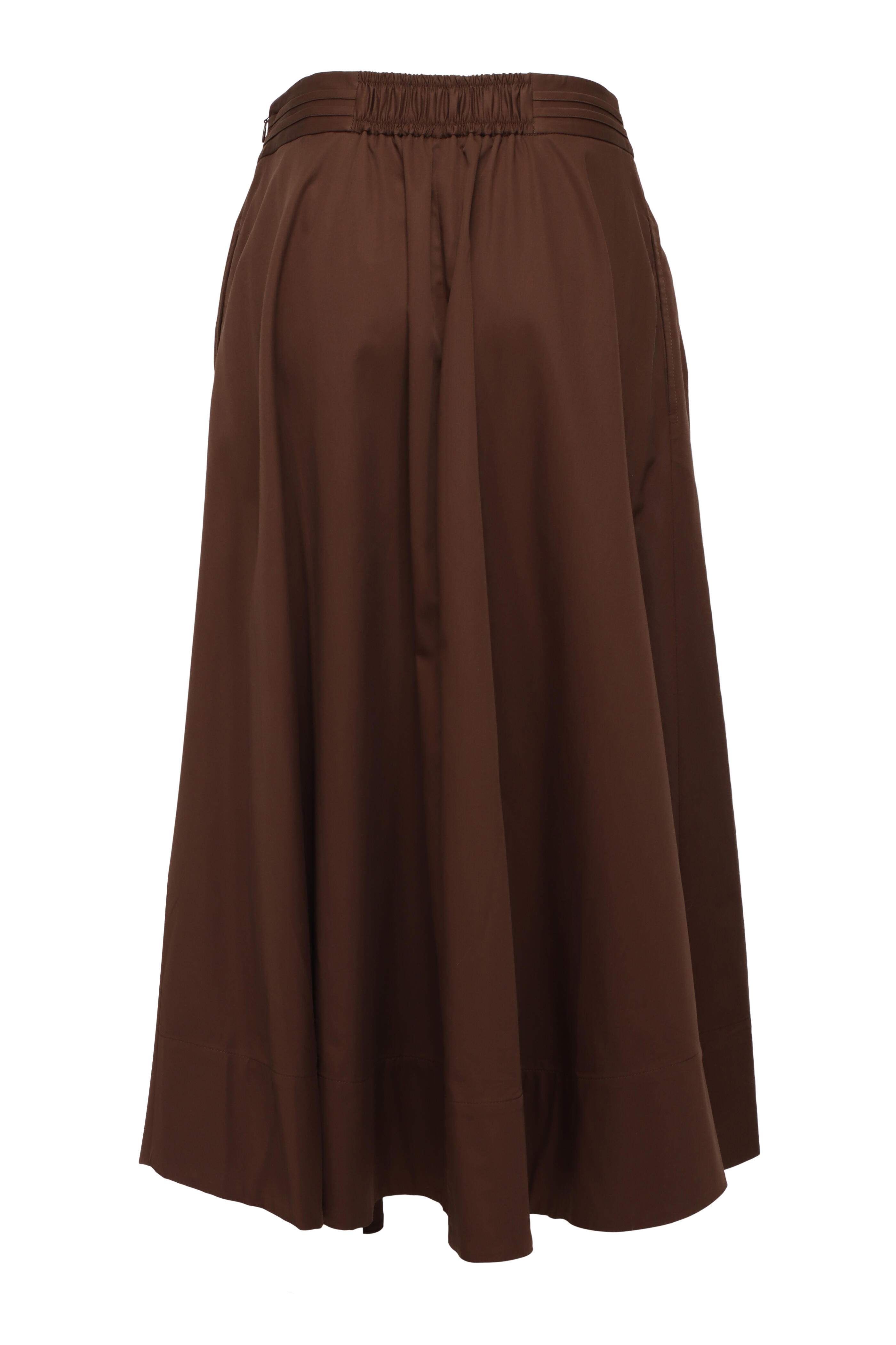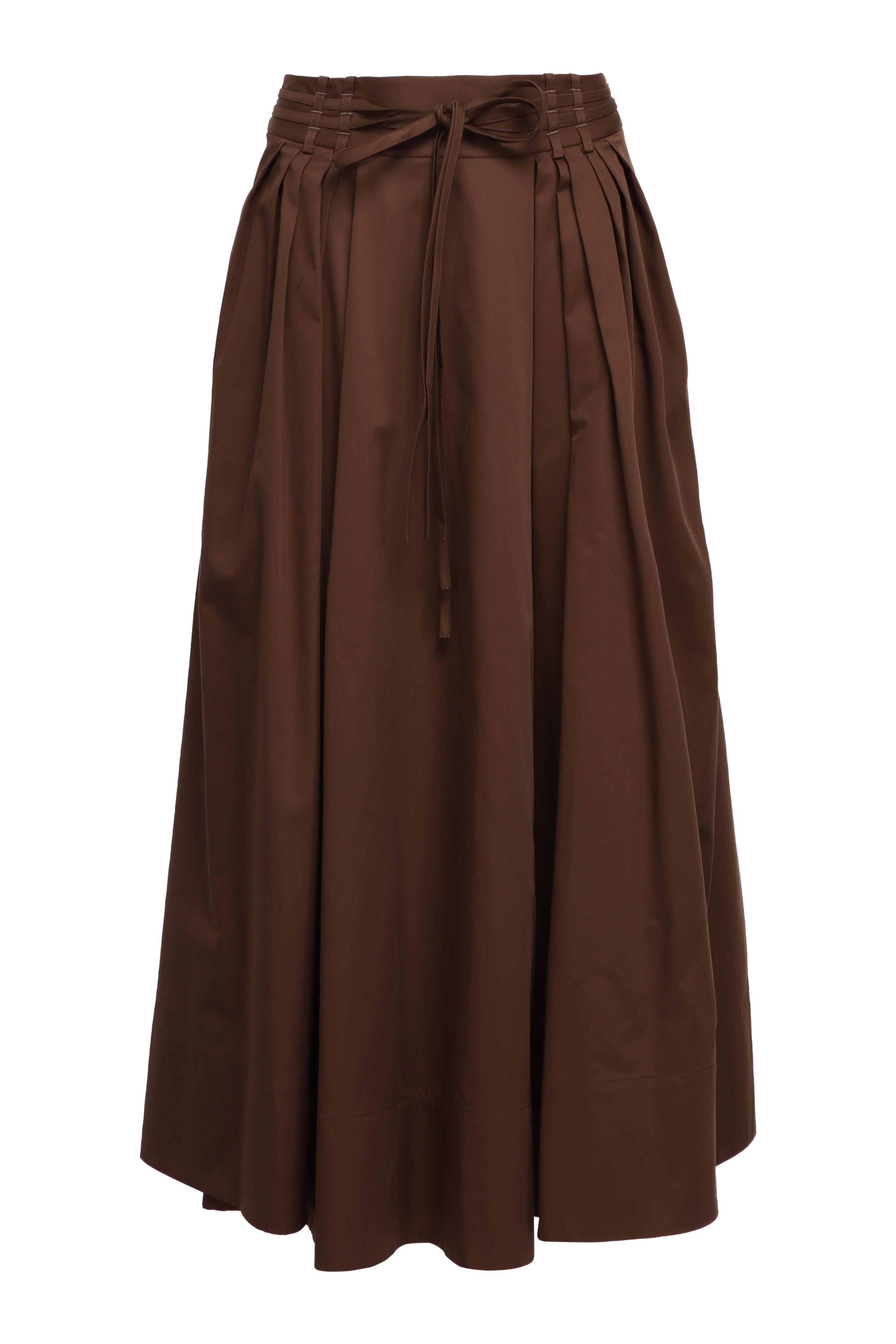 Mid rise. Elastic waist; self-tie belt. Side slip pockets. Gathered detail. Aline silhouette. Imported. Midi length. 100% organic cotton. Dry clean.