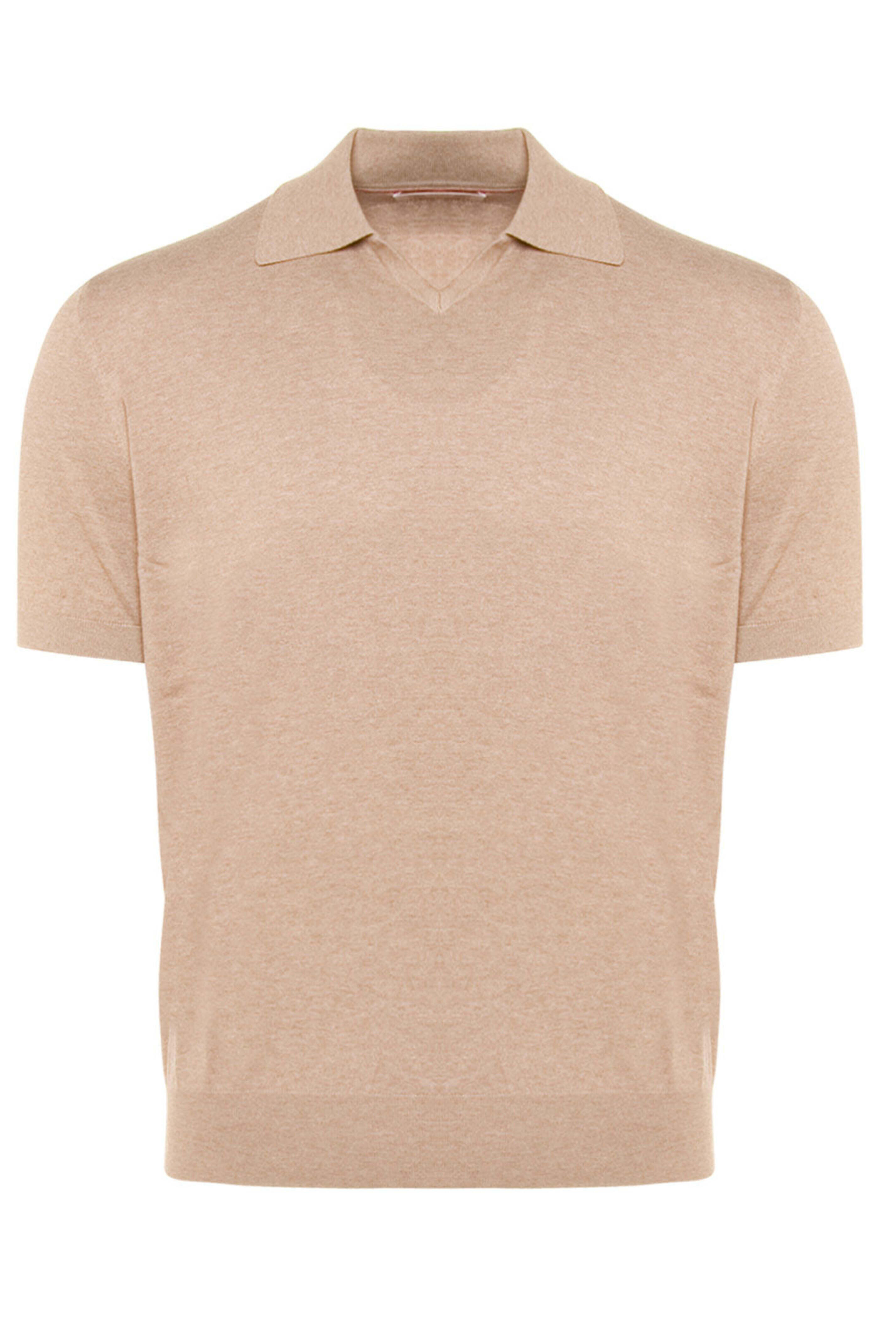 Brunello Cucinelli Brown Polo Sweater. Spread Johnny collar. Short sleeves. Pull over style. Ribbed trims. Made in Italy. 100% cotton.