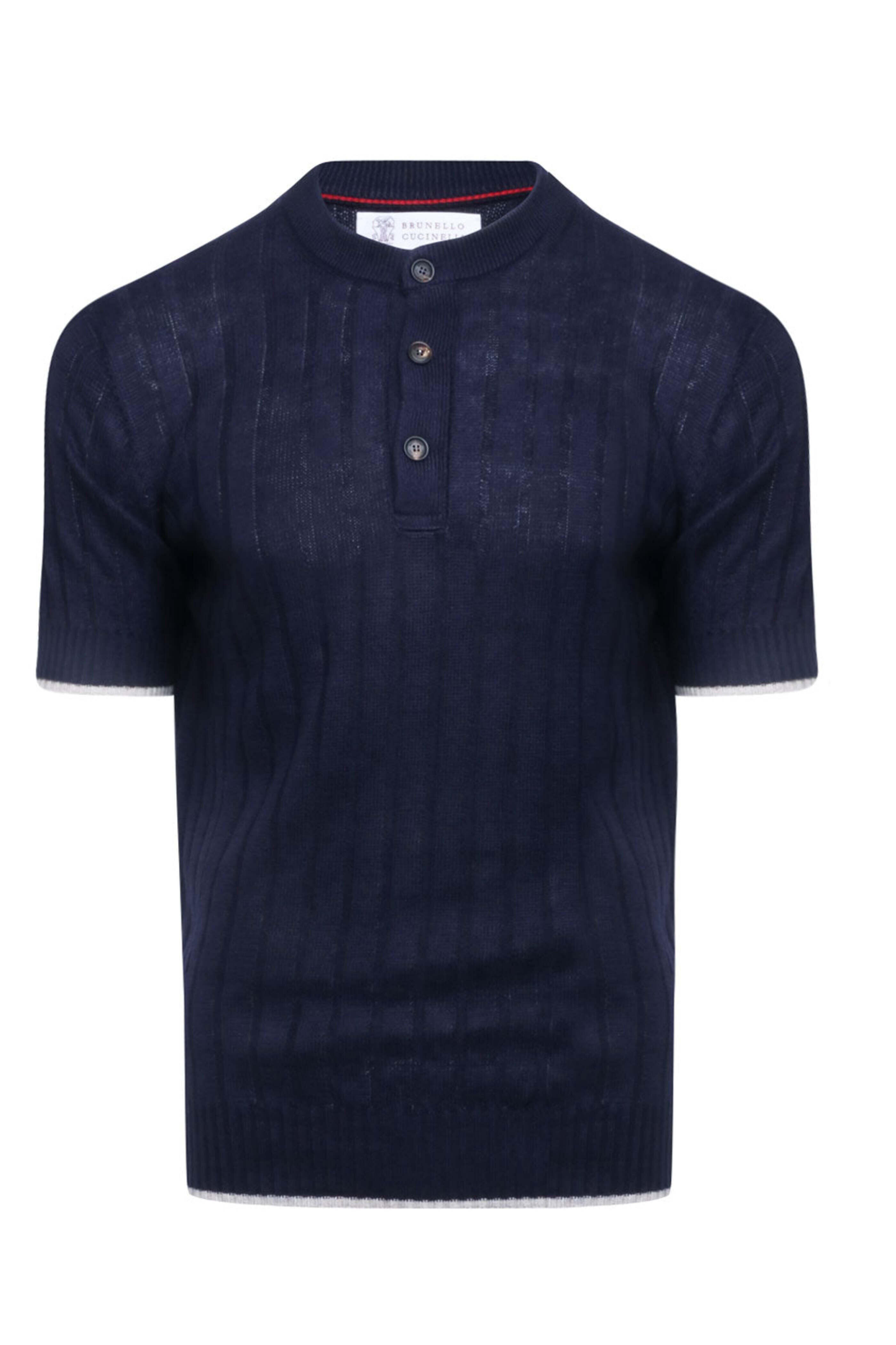 Brunello Cucinelli Navy Henley Knit Short Sleeve. Henley collar. Three button placket. Ribbed knit. Regular fit. Made in Italy . 77% linen, 23% cotton .