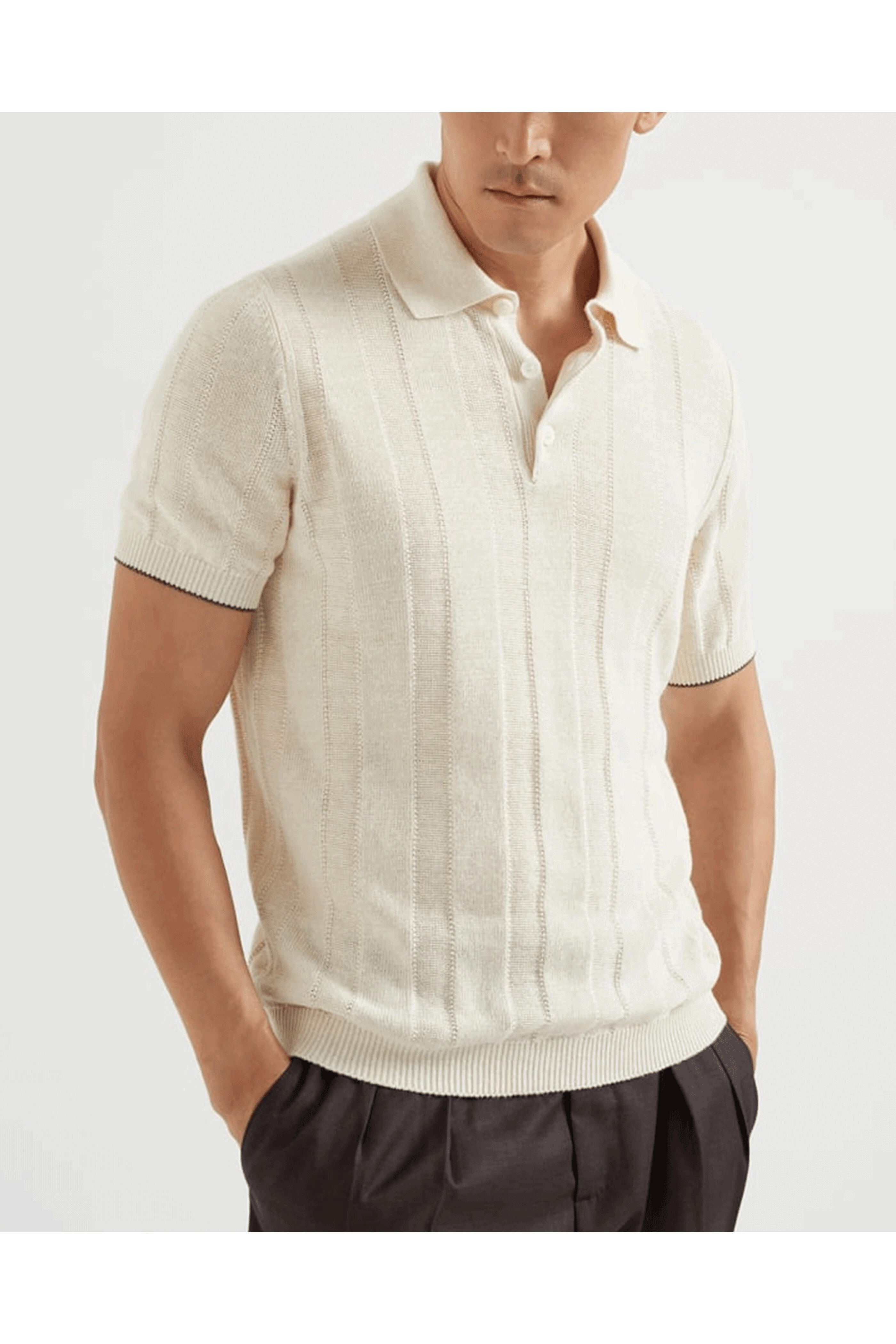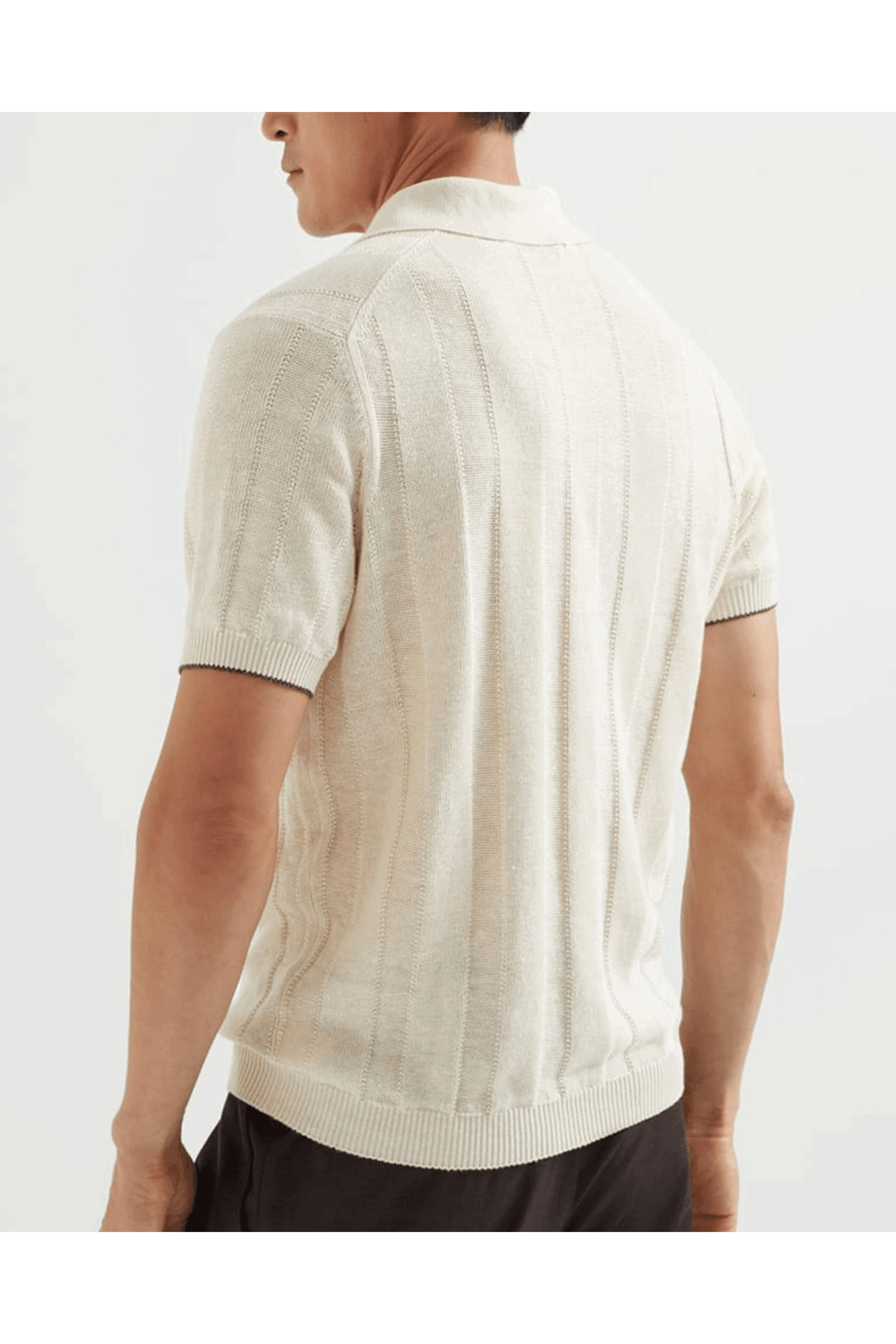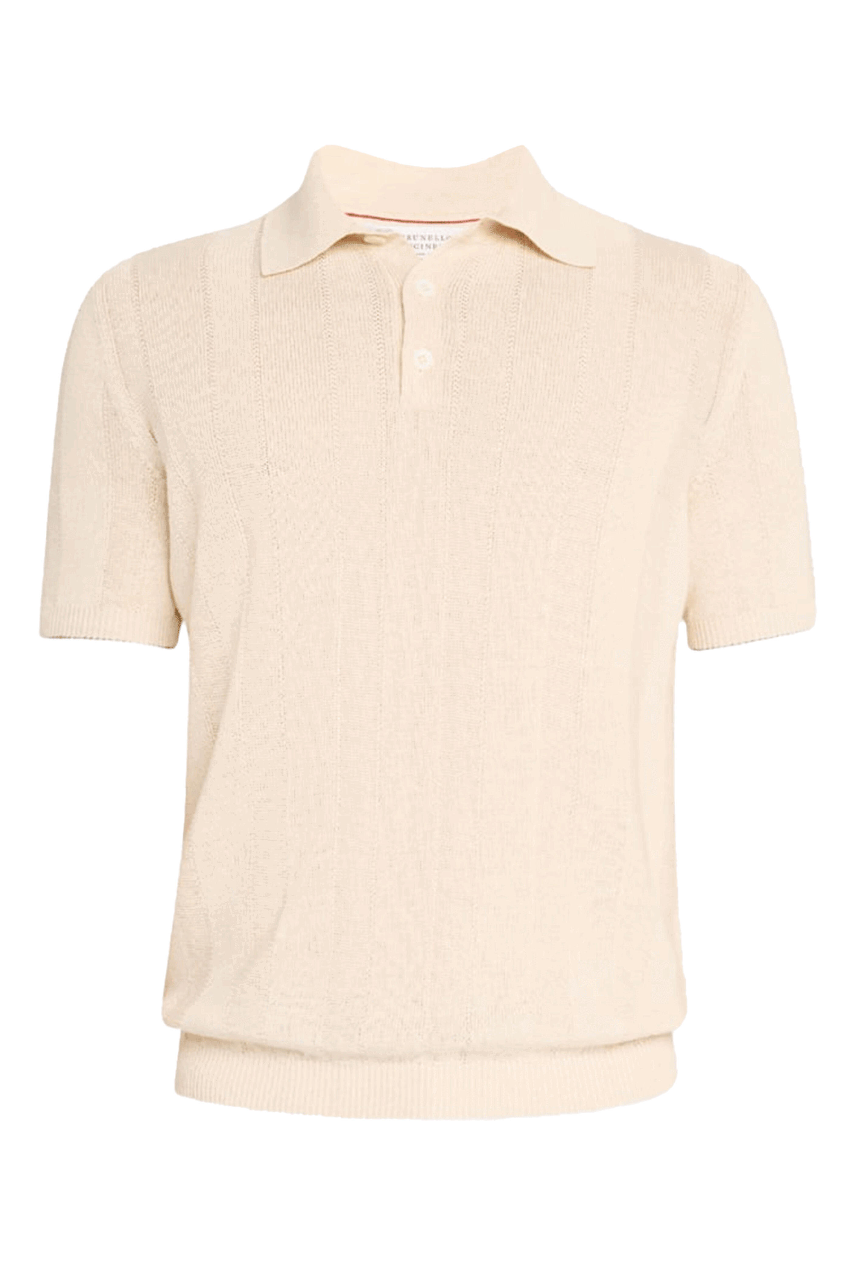 Brunello Cucinelli Cord Knit Polo. Spread collar. Three button placket. Short sleeves. Ribbed cuffs and hem. Pullover style. Made in Italy . 77% linen, 23% cotton.