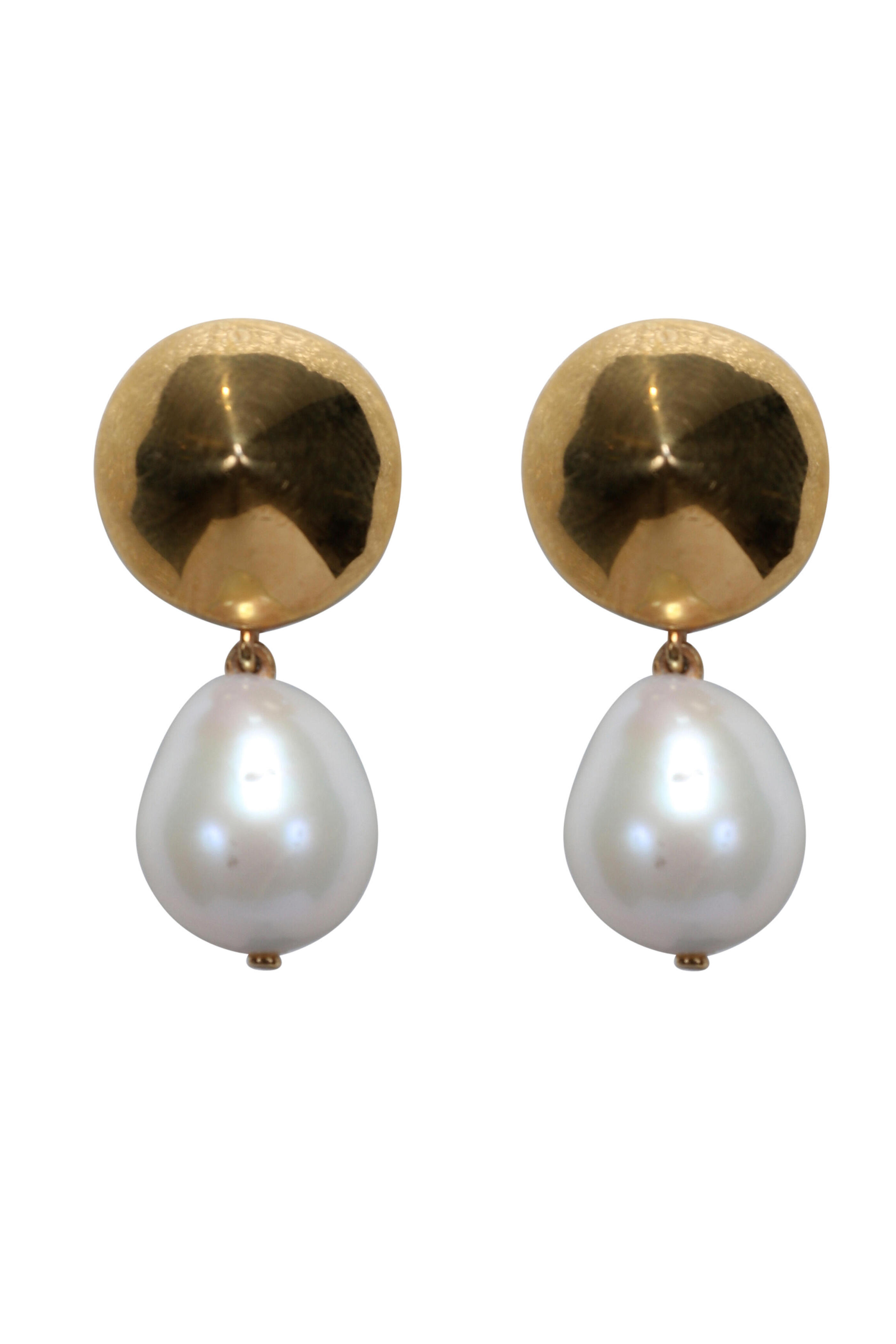 18k gold. Fresh water pearls. Gold cone design. Two tier. Drop style. Push back post with latch back. Manufactured in New York City.