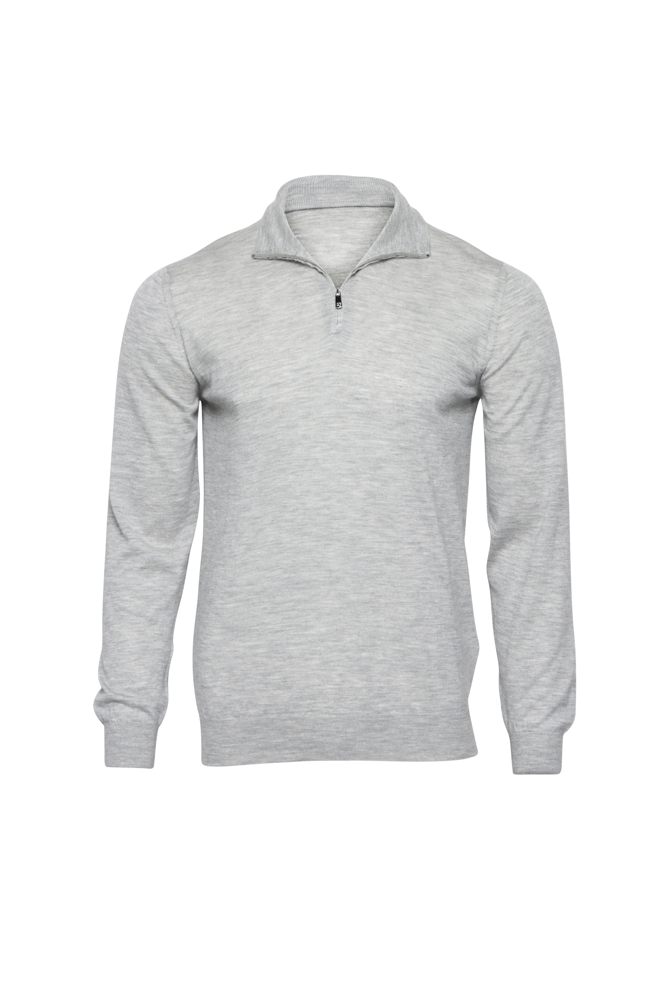 Stand collar. Quarter zip placket. Ribbed trims. Made in Italy. 100% cashmere. Dry clean.