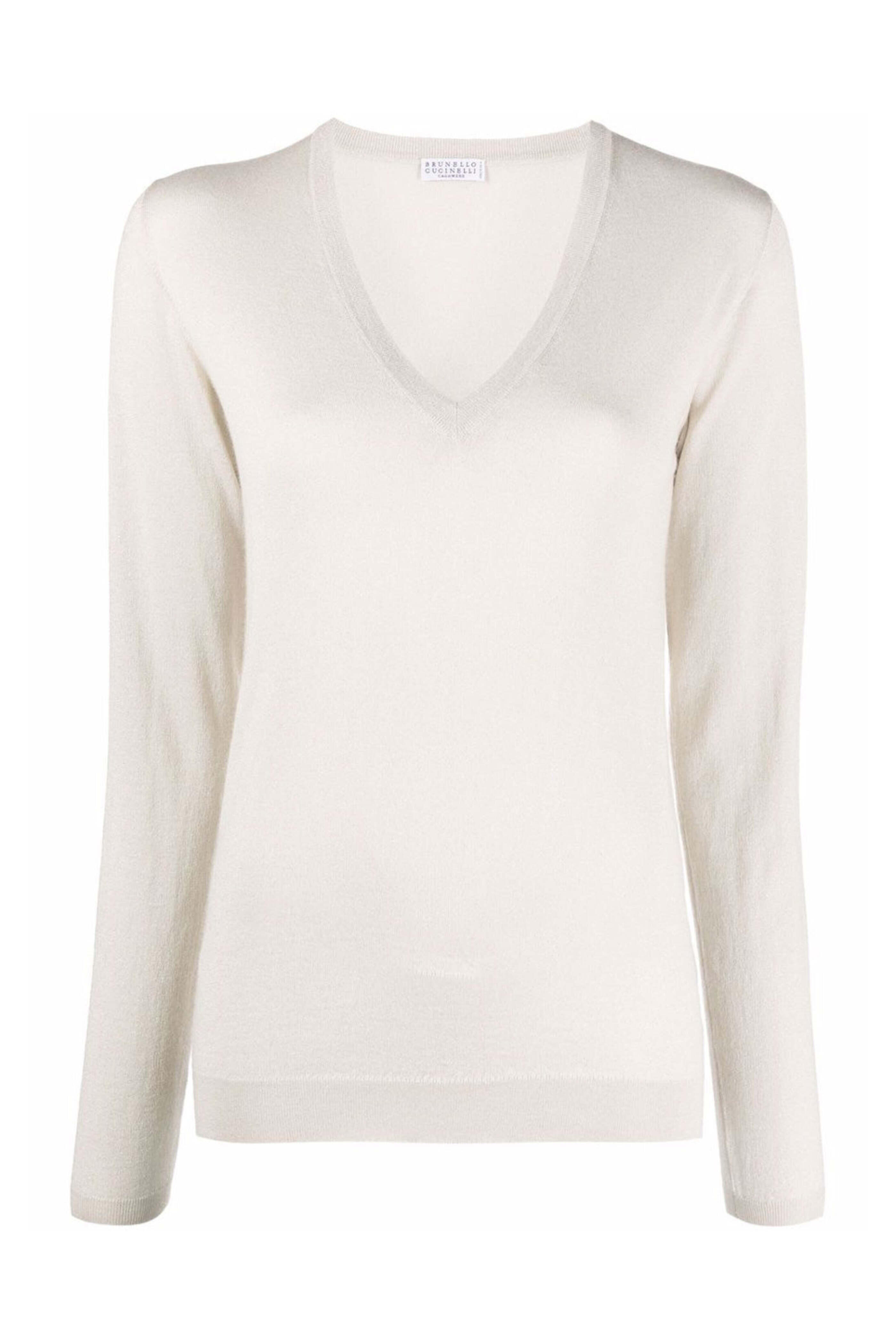 - Brunello Cucinelli Warm White Cashmere Silk V Neck Sweater