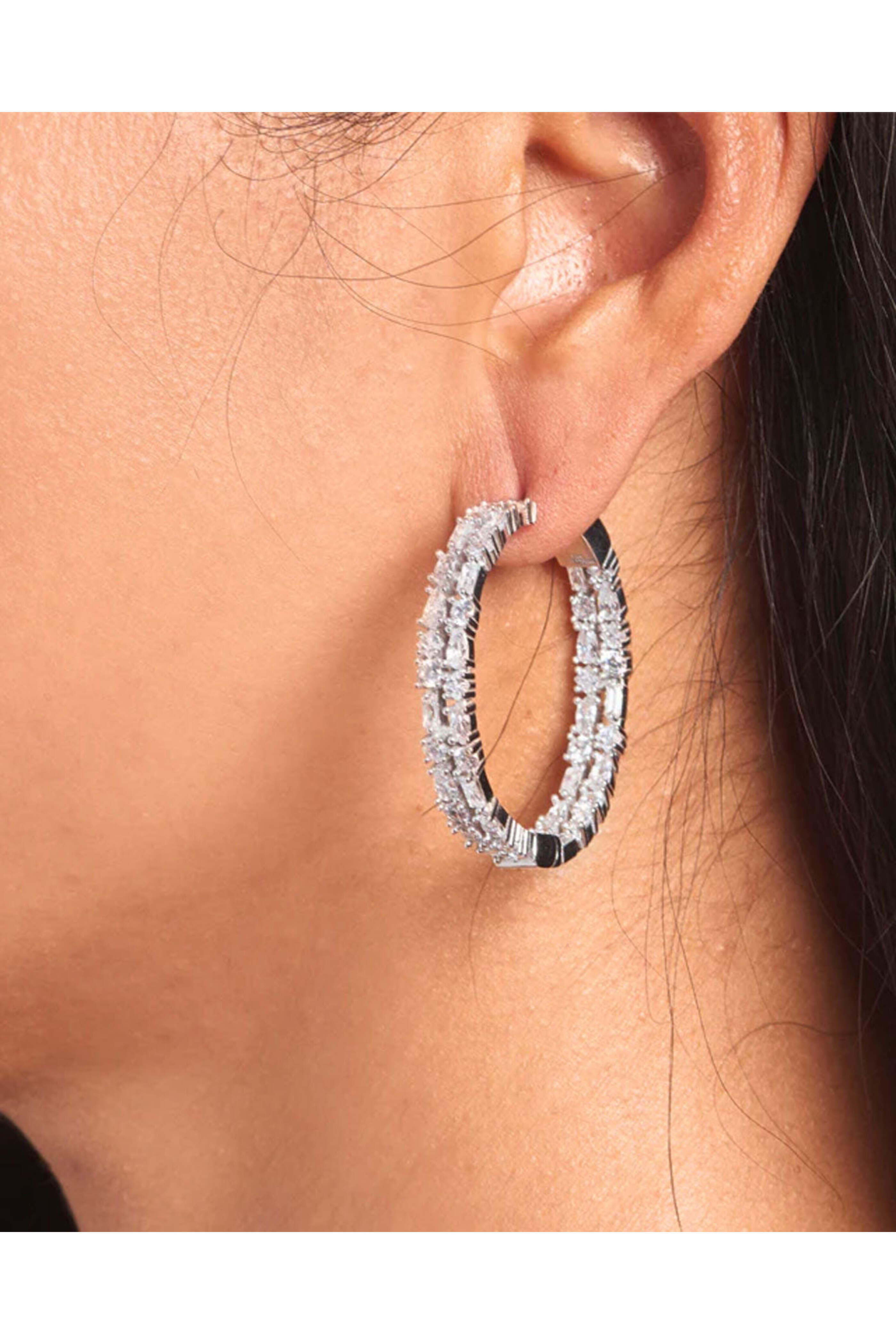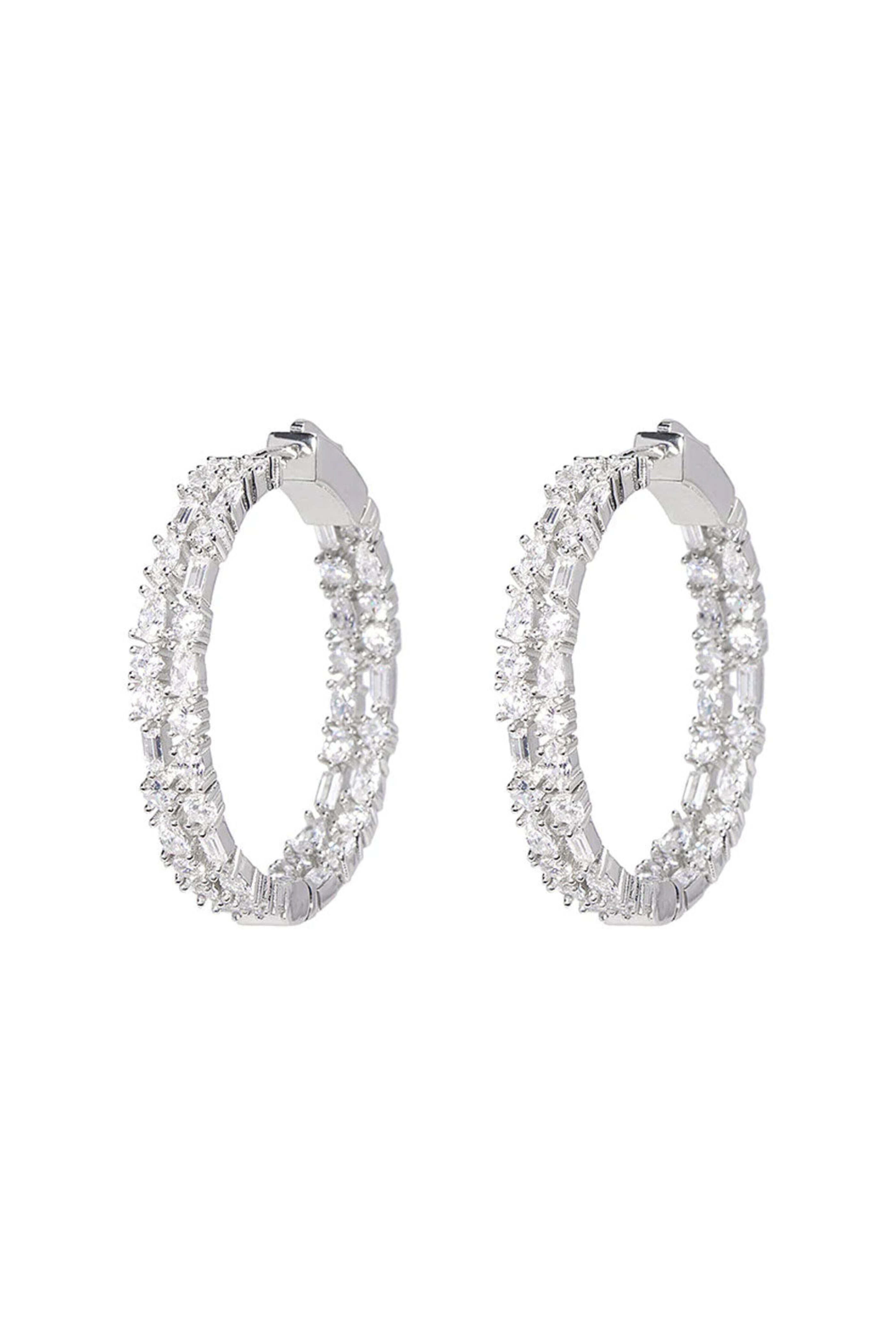 Nickho Rey Small Casey Hoop Earrings. White rhodium vermeil. Clear stones. Hoop. 1.3 D. Hinge closure. Imported.