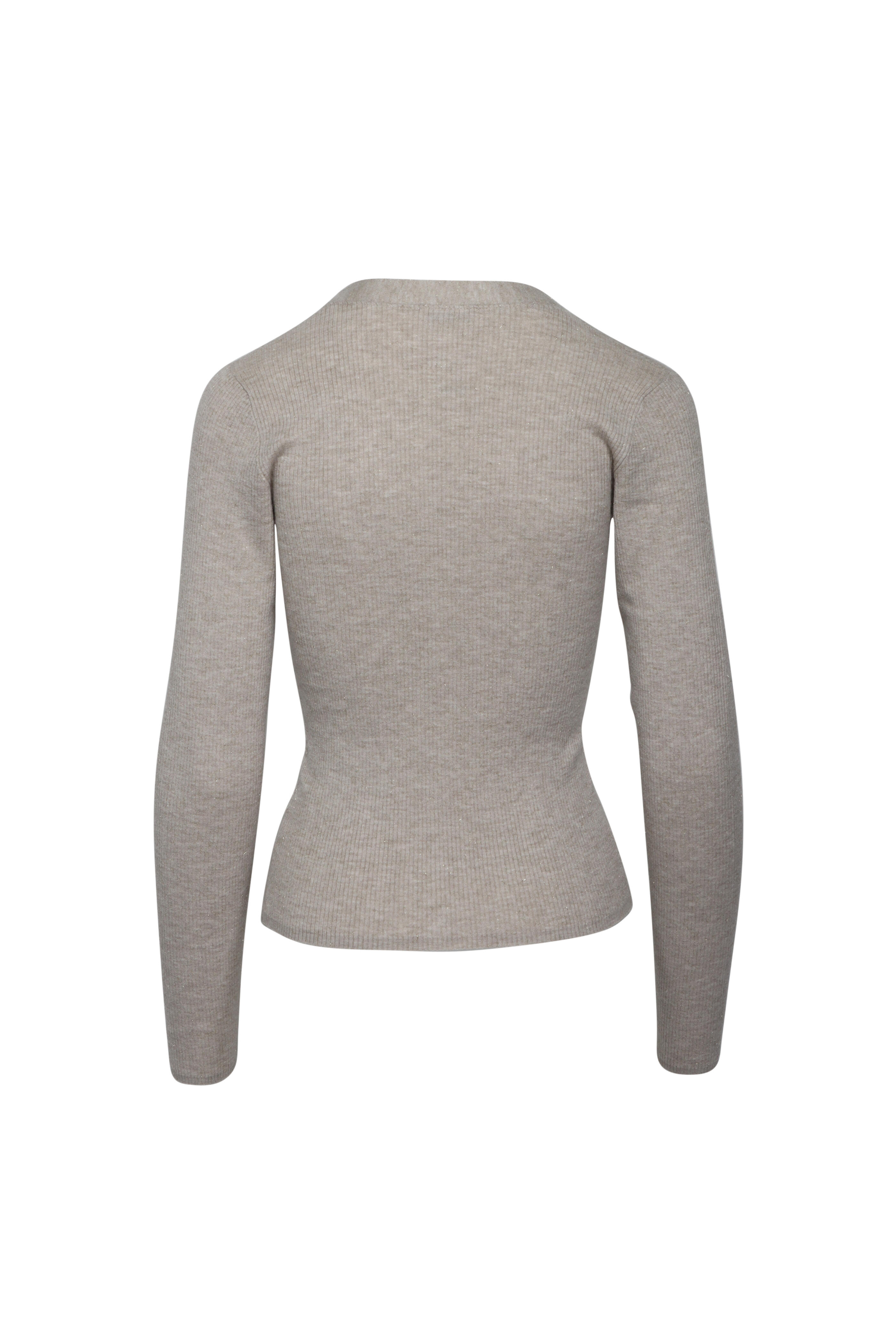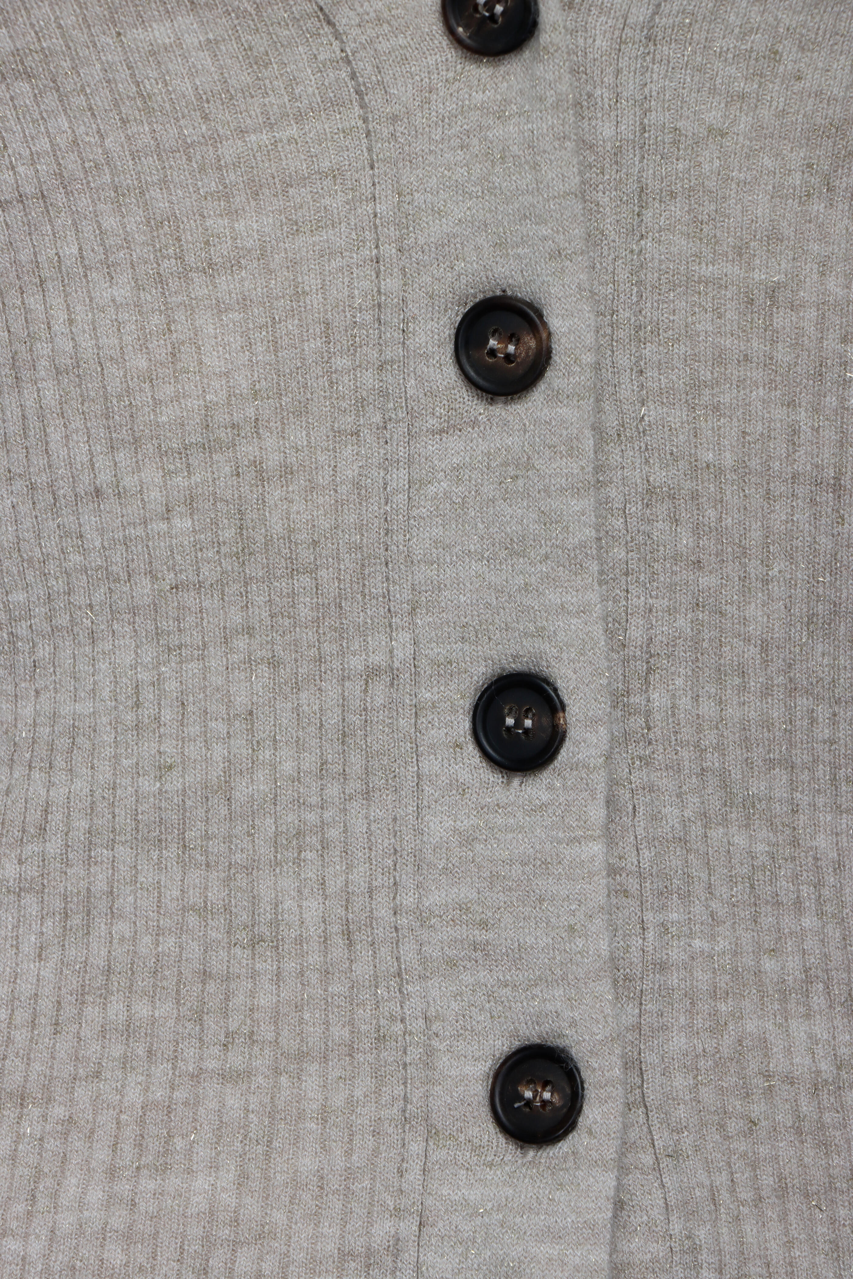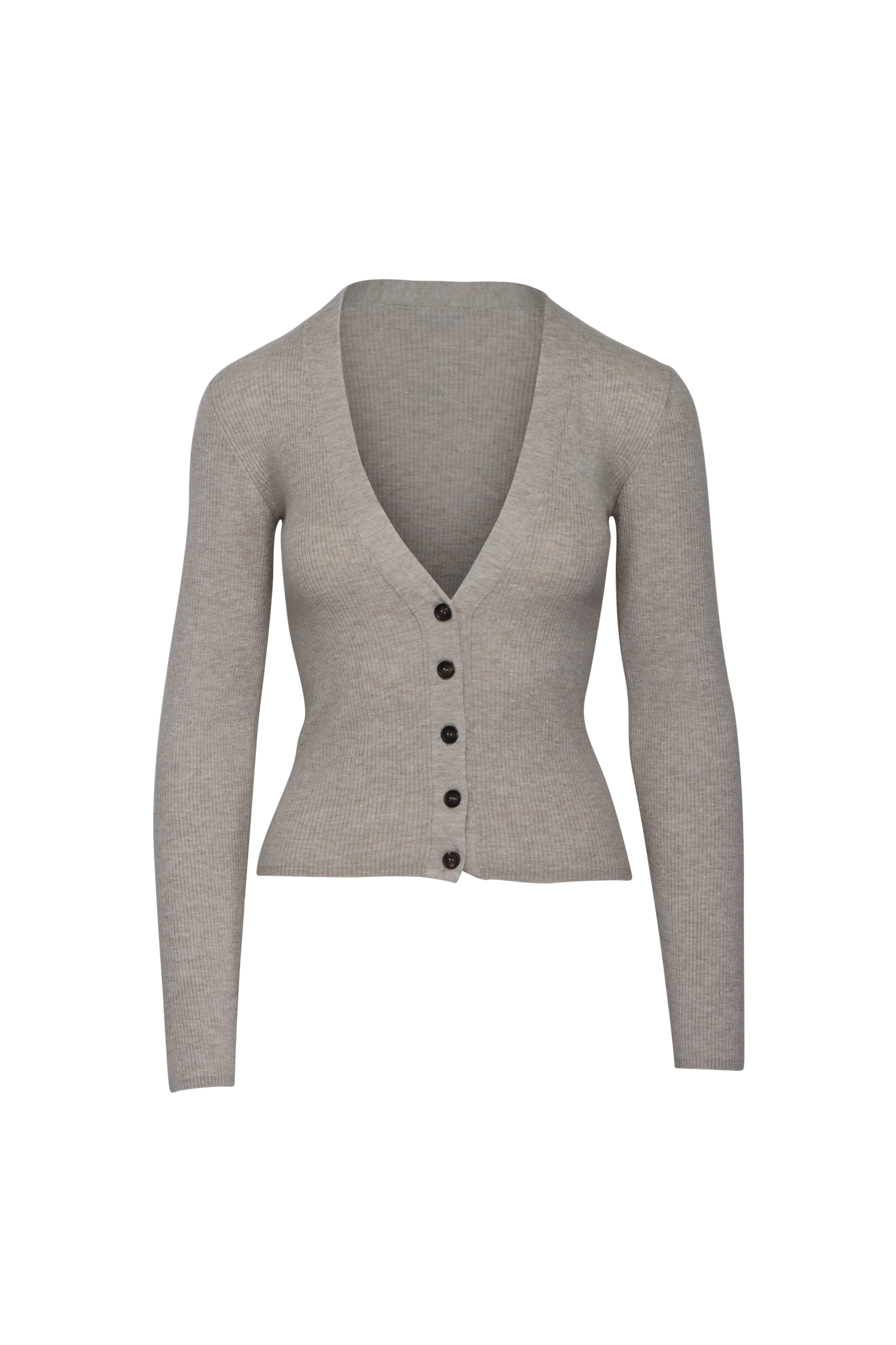 V neck. Long sleeves. Button up front closure. Ribbed throughout. Straight hem. Made in Italy. 46% cashmere, 41% viscose, 13% polyester. Dry clean.