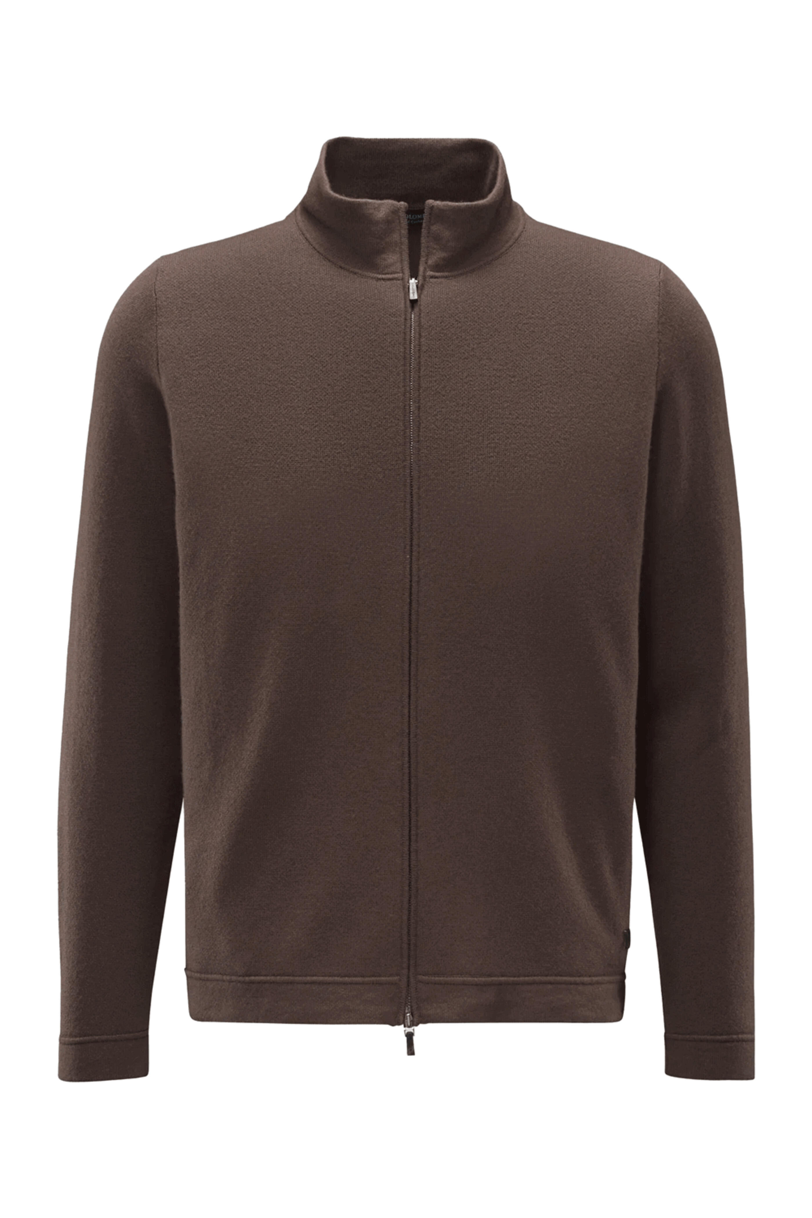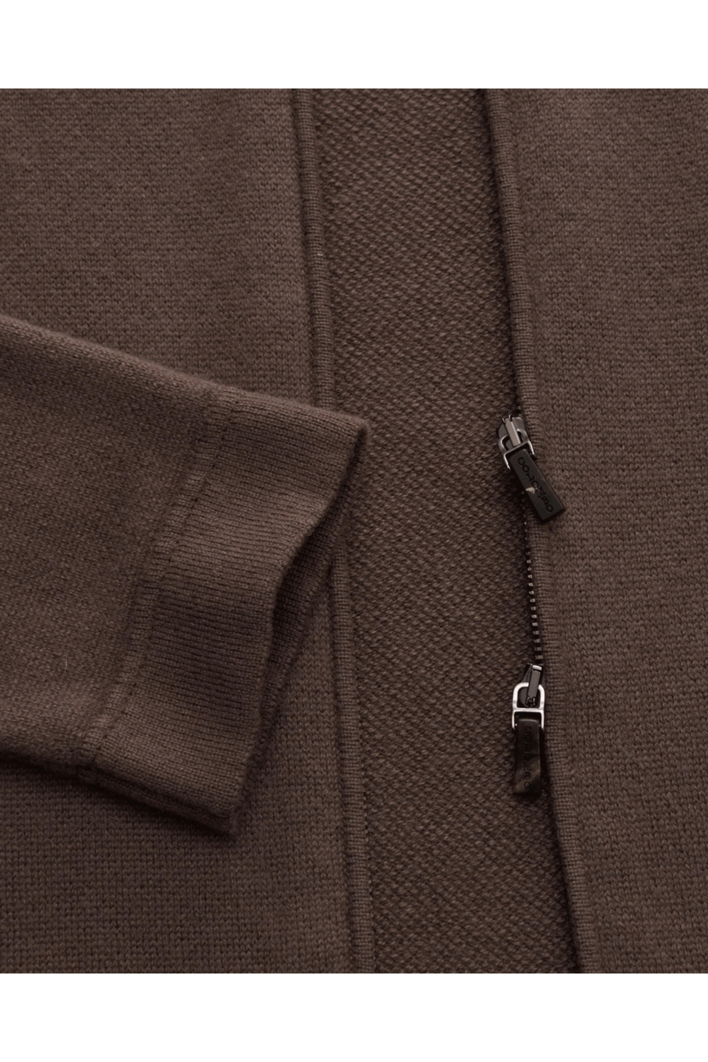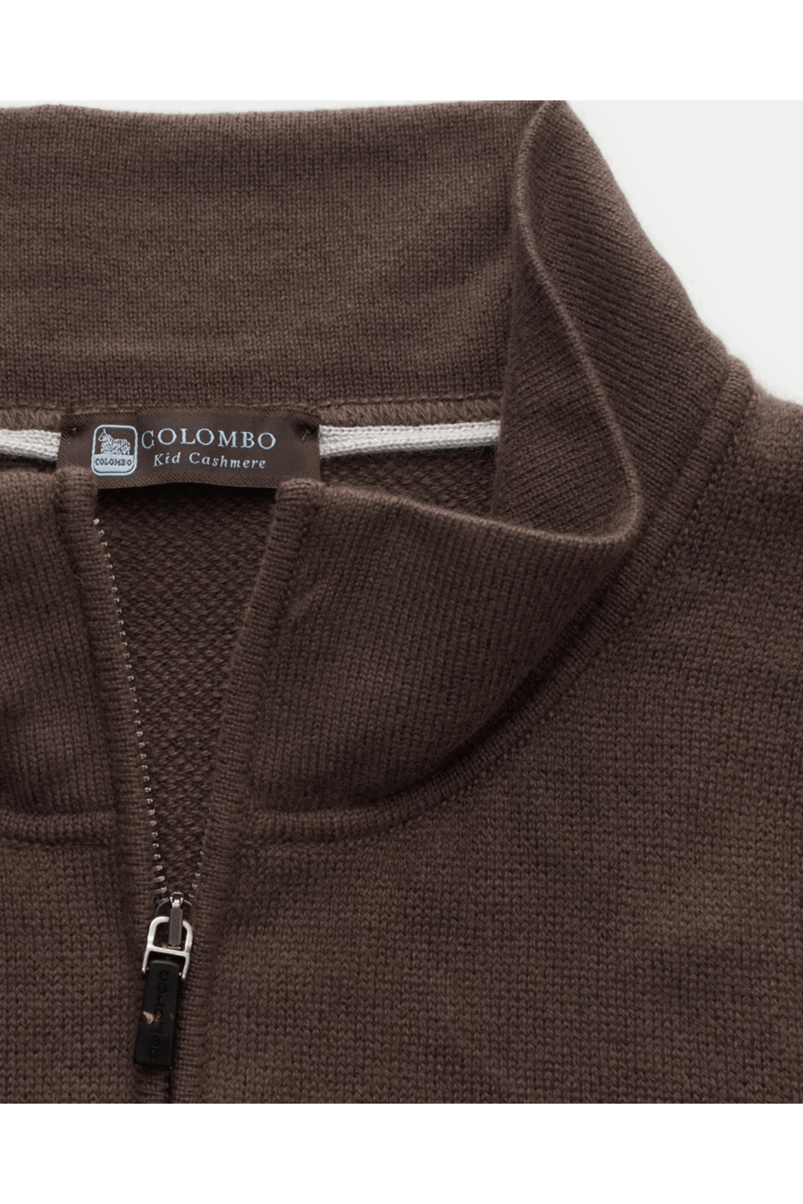 Colombo Wood Cashmere Mockneck Sweater. Stand collar. Two-way zip closure. Logo zip pull. Side slip pockets. Long sleeves. Made in Italy . 100% Kid cashmere.