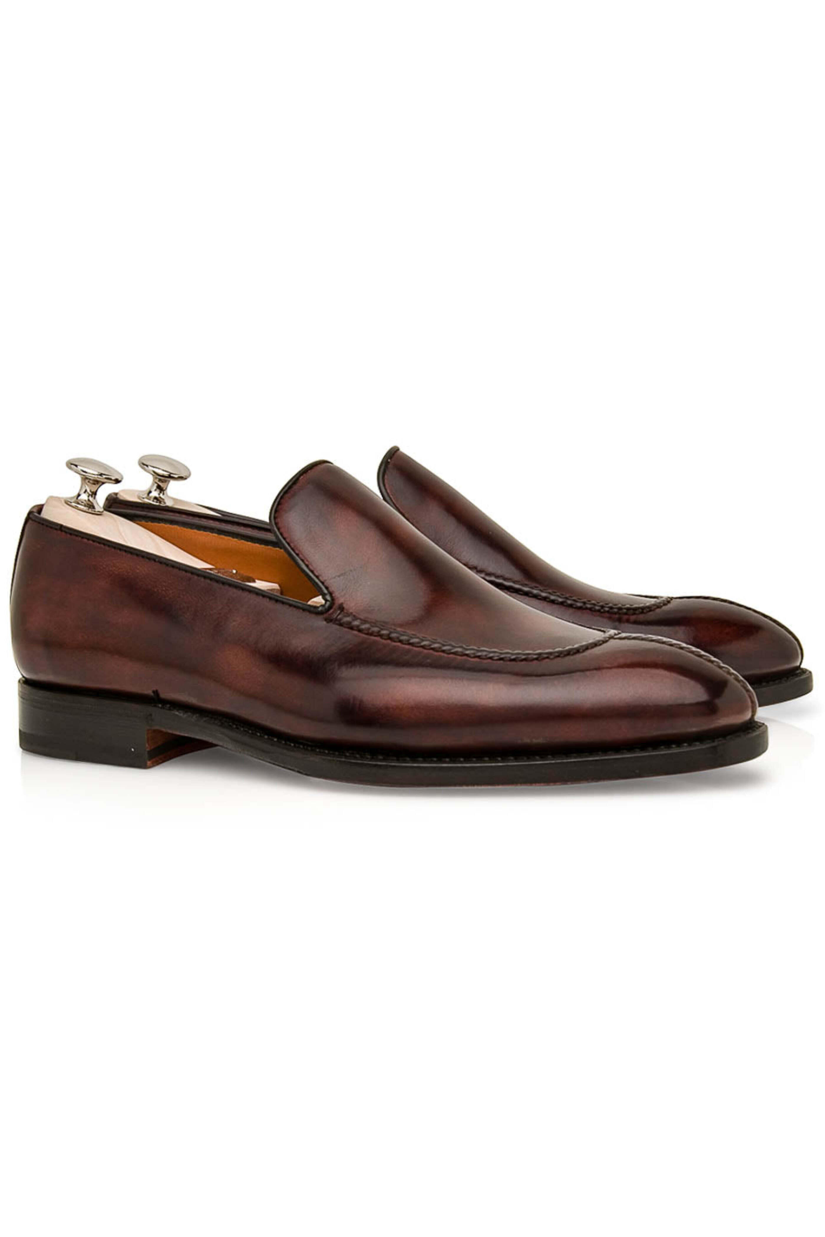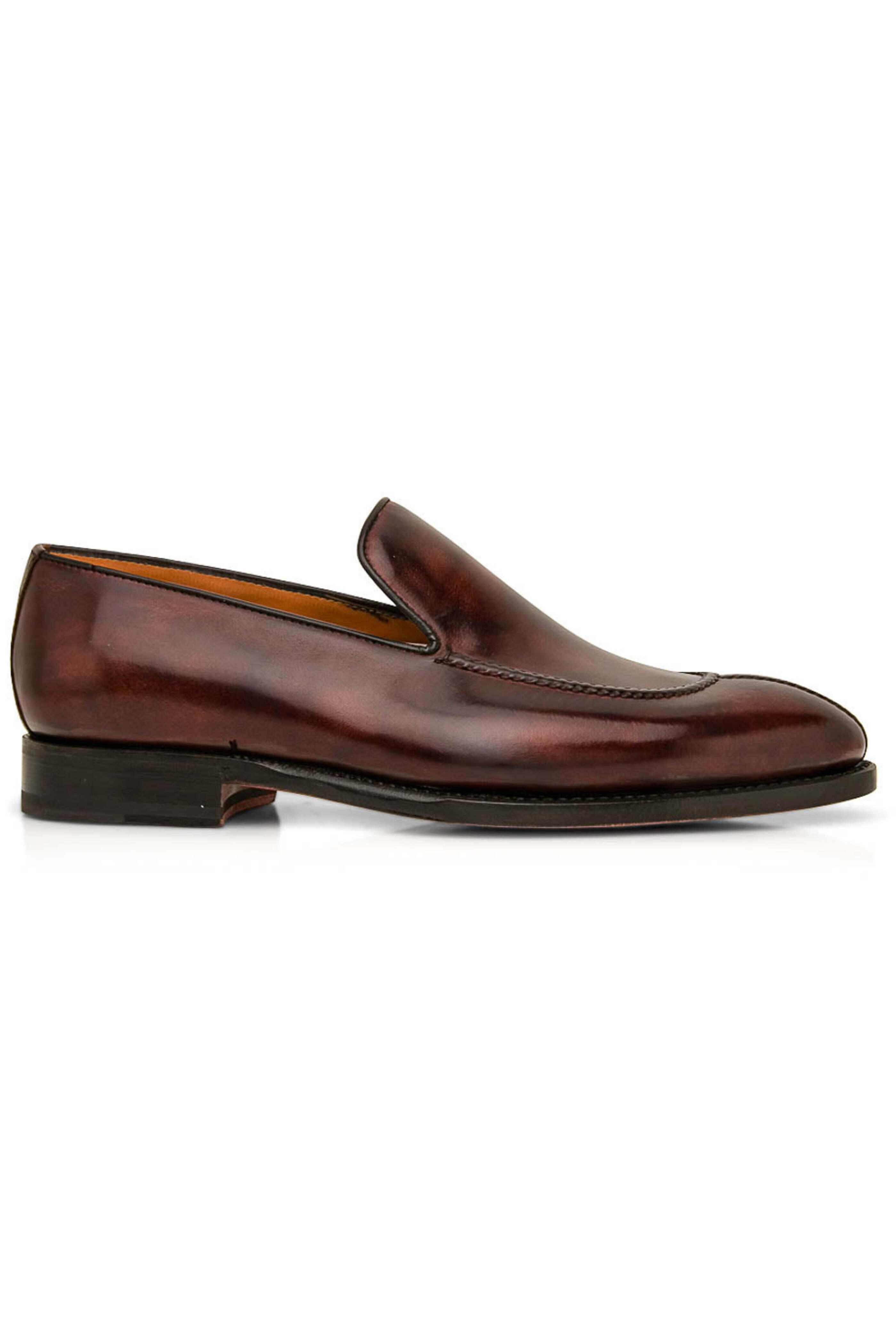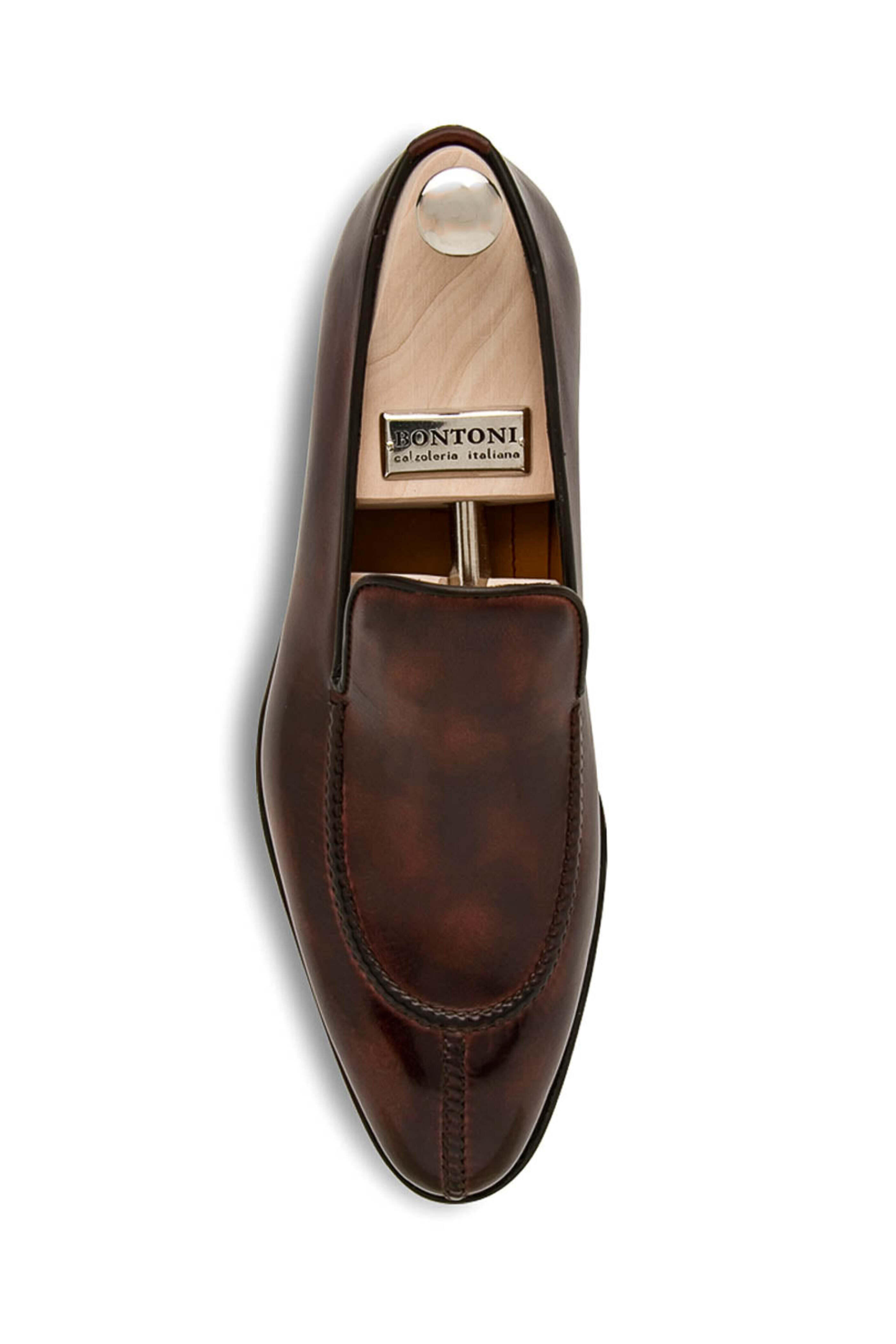 Bontoni Legno Scuro Magnifico Loafer. Smooth leather upper. Slip on style. Split toe loafer. Almond toe. Leather lining, sole, and insole. Cushioned footbed. Tonal stitching. Blake construction. Wooden shoe trees included. Color: legno scuro. Handmade in Italy.