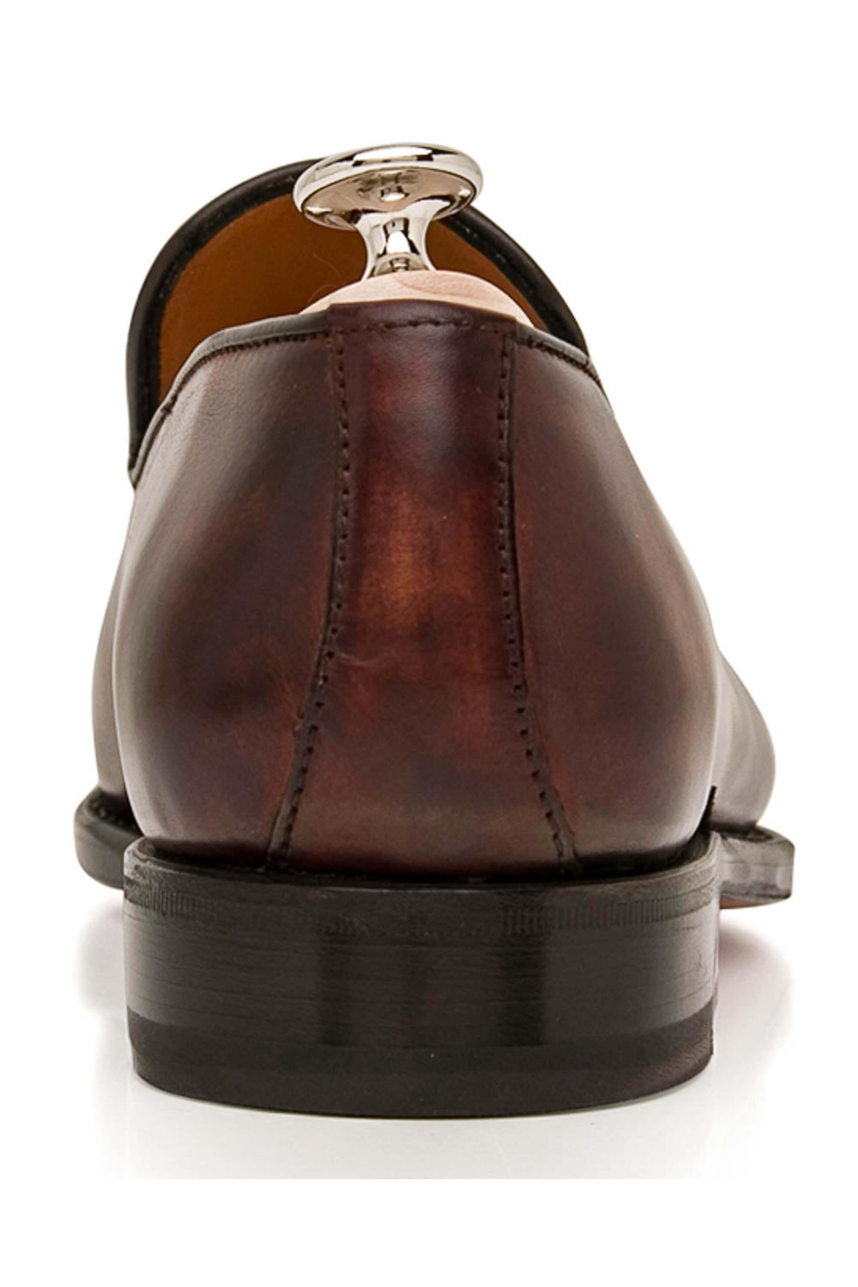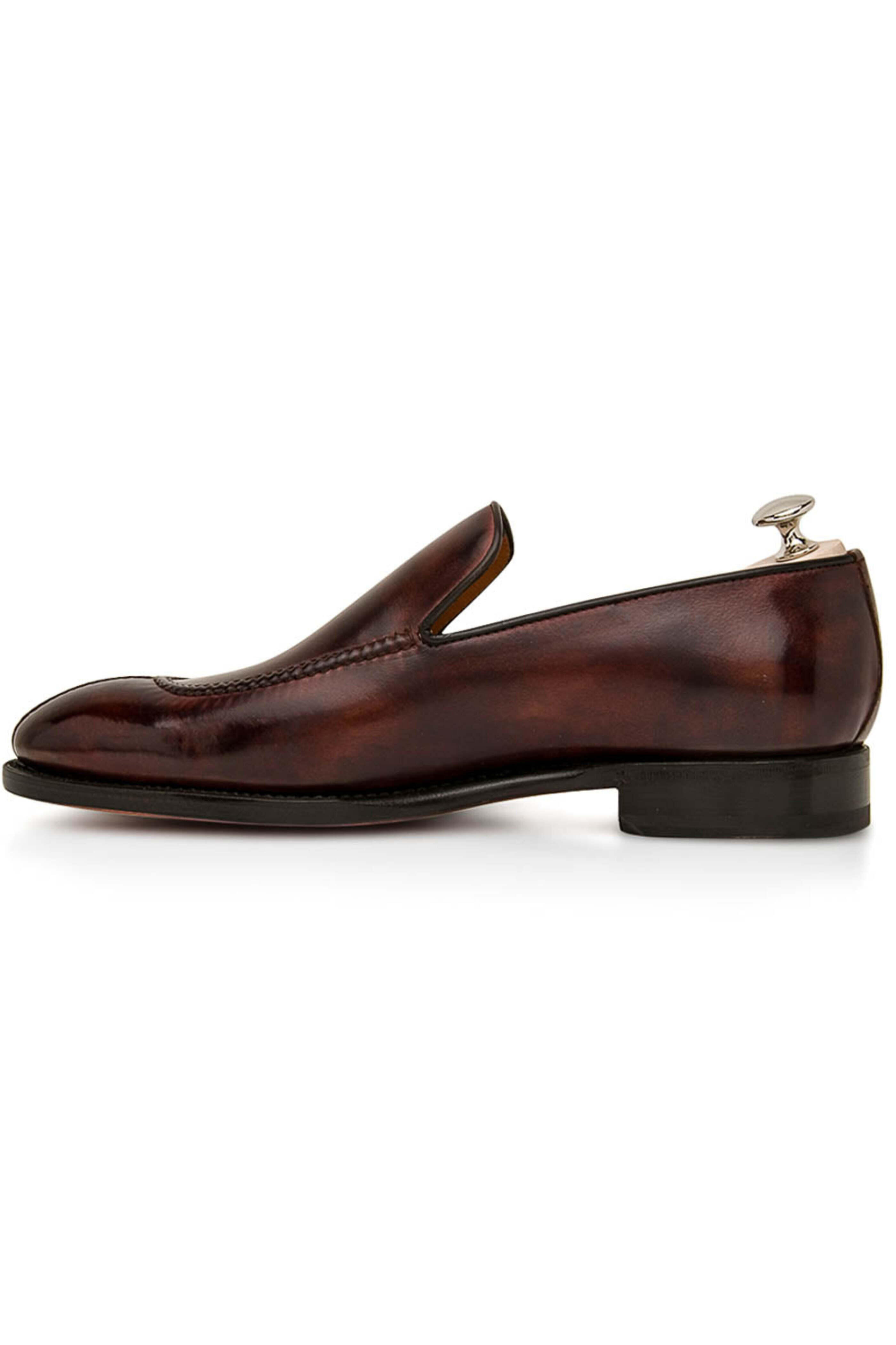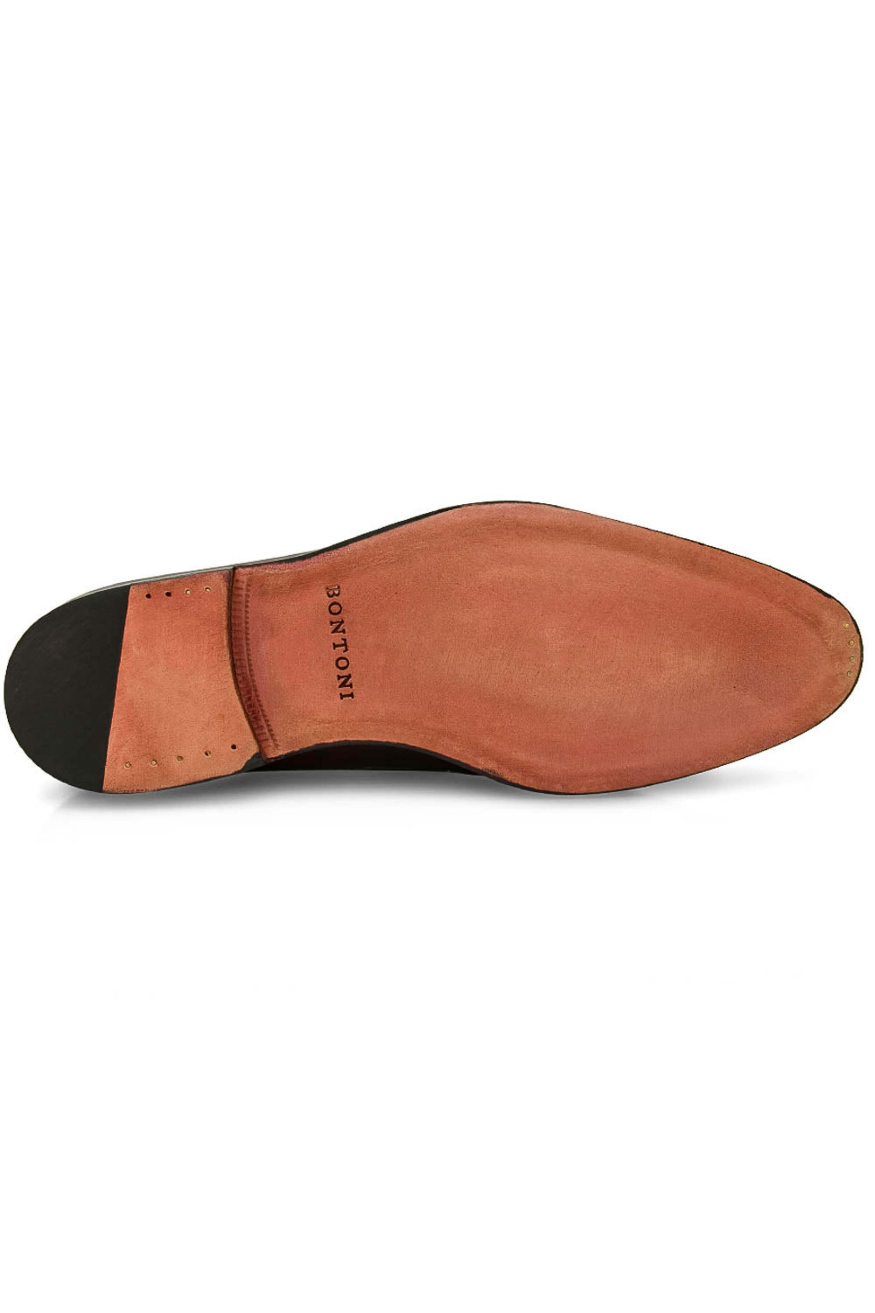 Bontoni Legno Scuro Magnifico Loafer. Smooth leather upper. Slip on style. Split toe loafer. Almond toe. Leather lining, sole, and insole. Cushioned footbed. Tonal stitching. Blake construction. Wooden shoe trees included. Color: legno scuro. Handmade in Italy.